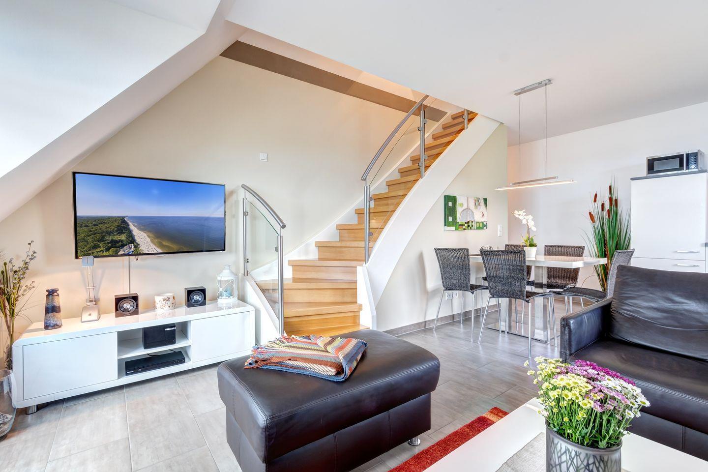 Diese 67 Quadratmeter große, hochwertig eingerichtete Wohnung erstreckt sich über zwei Etagen und ist für 4 Personen oder Familien geeignet. Der Balkon lädt dazu ein, entspannte Urlaubsmomente im Freien zu genießen.