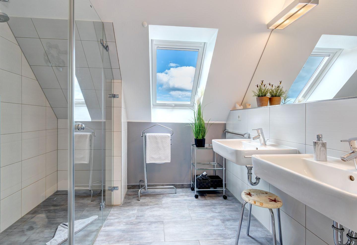Die obere Etage dieser bezaubernden Maisonettewohnung wartet mit einem lichtdurchfluteten Badezimmer auf, das mit einer modernen, ebenerdigen Dusche ausgestattet ist. In einem der Schlafzimmer finden Sie einen Fernseher und einen Arbeitsplatz, der perfekt für gemütliches Arbeiten am Laptop ist – für zusätzlichen Komfort während Ihres Aufenthalts.