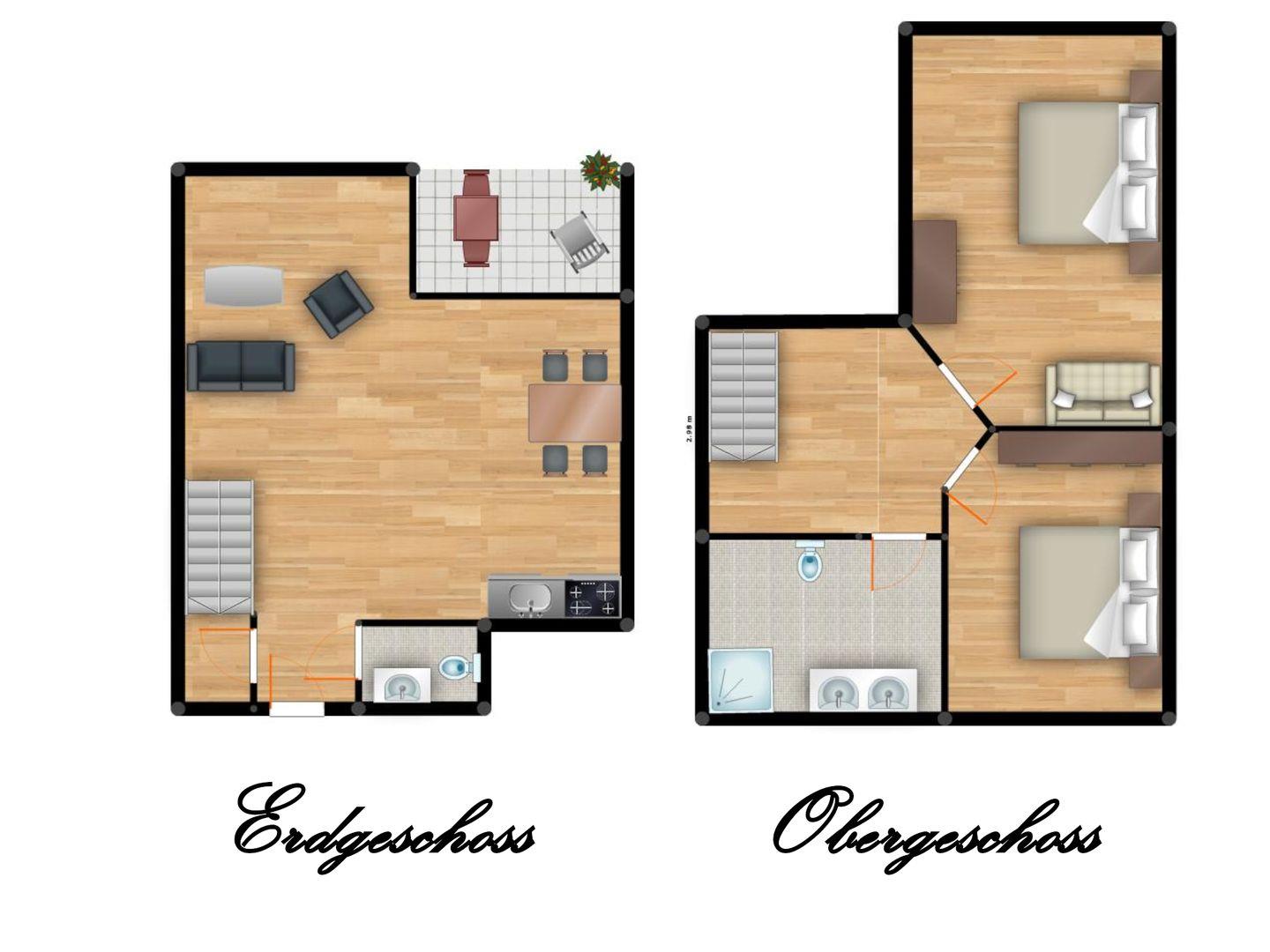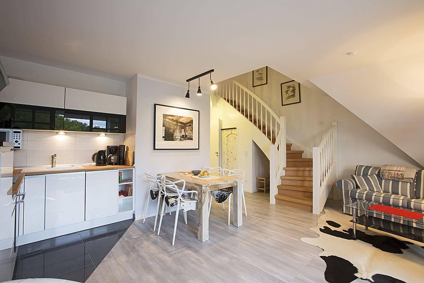 Ihr Zuhause auf Zeit erstreckt sich über zwei Etagen und bietet auf rund 70 m² jede Menge Komfort. Im Erdgeschoss erwartet Sie ein offener Wohn- und Küchenbereich, ausgestattet mit einer gemütlichen Couch und einer modernen Wohnwand mit Flatscreen. Ein Gäste-WC sowie ein praktischer Abstellraum komplettieren das Erdgeschoss.