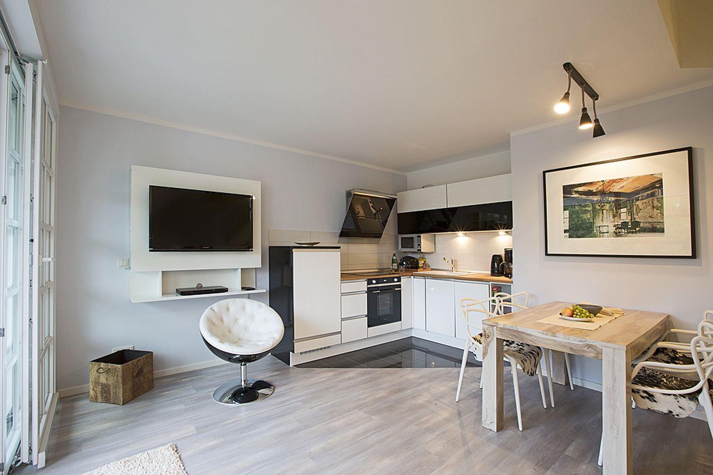 Die hochwertige Küche lädt zum kulinarischen Erlebnis ein und ist vollständig ausgestattet. Am großzügigen Esstisch finden vier Personen bequem Platz, um gemeinsam zu speisen.