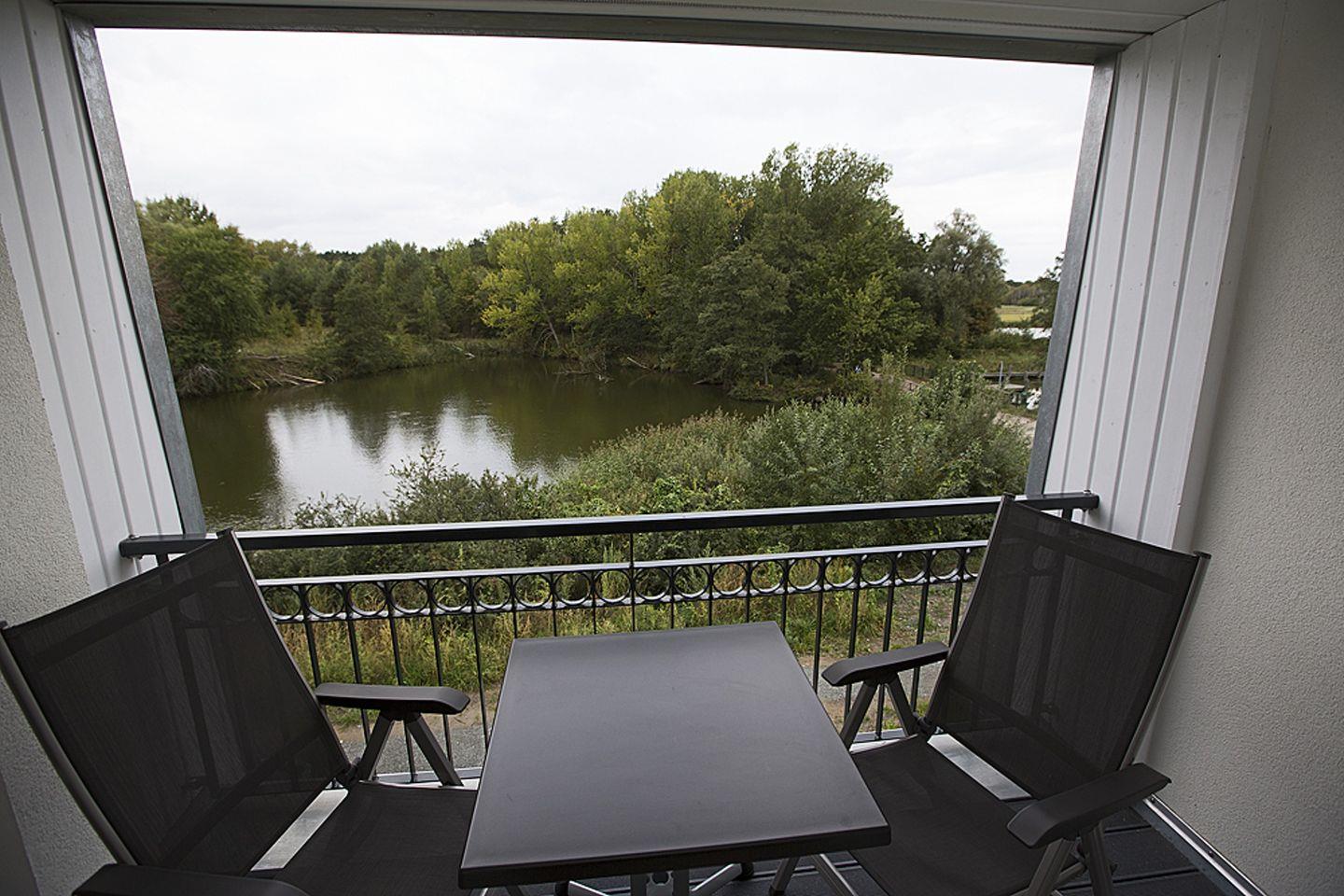Das Highlight des Erdgeschosses ist zweifelsohne das große bodentiefe Schiebefenster, das nicht nur für reichlich Tageslicht sorgt, sondern auch den Zugang zur Loggia ermöglicht. Von hier aus können Sie den Blick auf den Teich neben der Anlage genießen oder sich von der beeindruckenden Natur am Achterwasser verzaubern lassen.