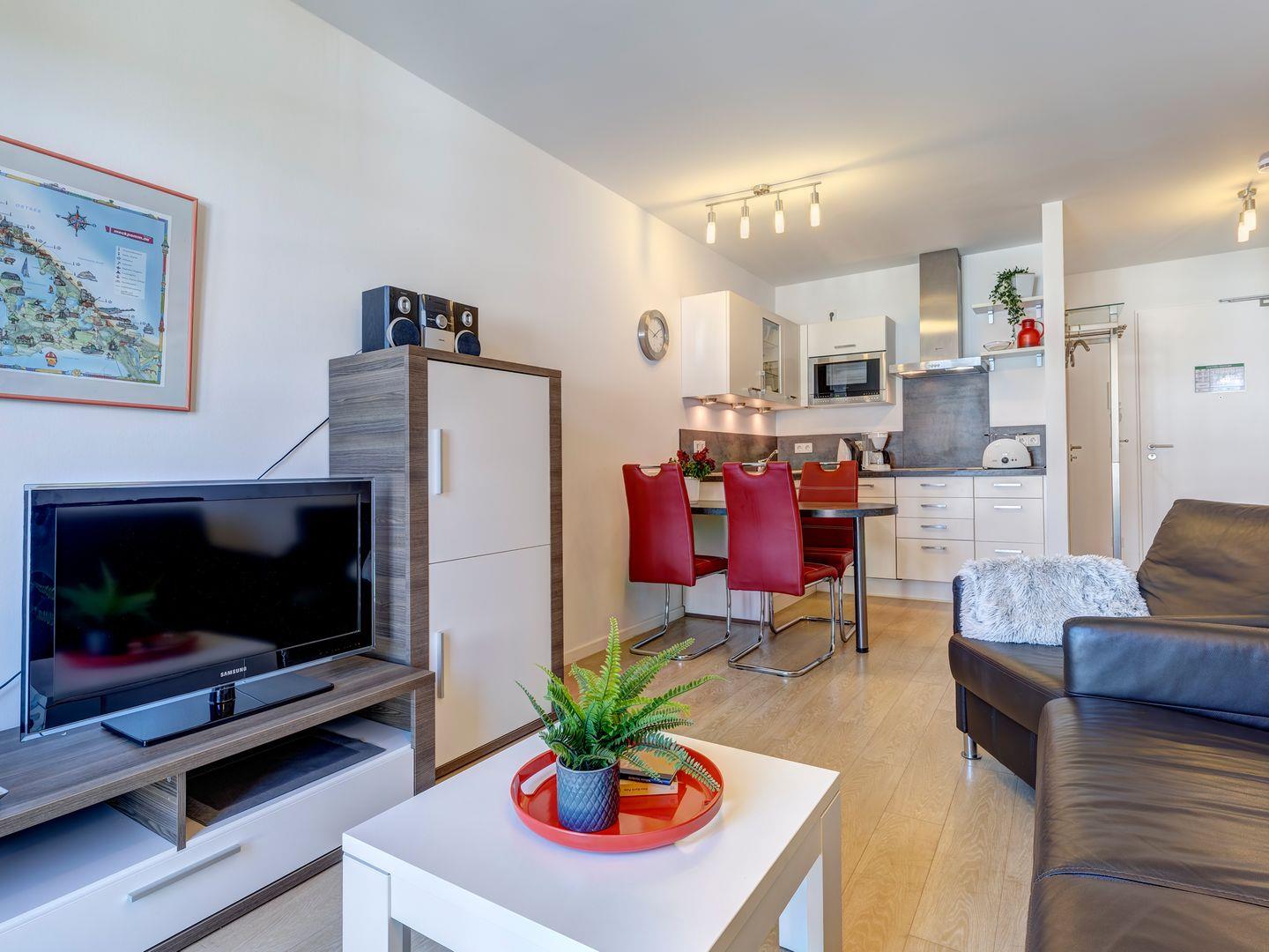 Vom gemütlichen Wohnzimmer aus treten Sie direkt auf den Balkon und lassen Ihren Blick über das malerische Achterwasser schweifen. Die hochwertige und ausziehbare Ledercouch sowie ein bequemer Sessel laden zum Verweilen und Entspannen ein. Ein Esstisch trennt den Wohnbereich von der vollausgestatteten offenen Küche, in der Sie Ihre Speisen mit Leichtigkeit zubereiten können.