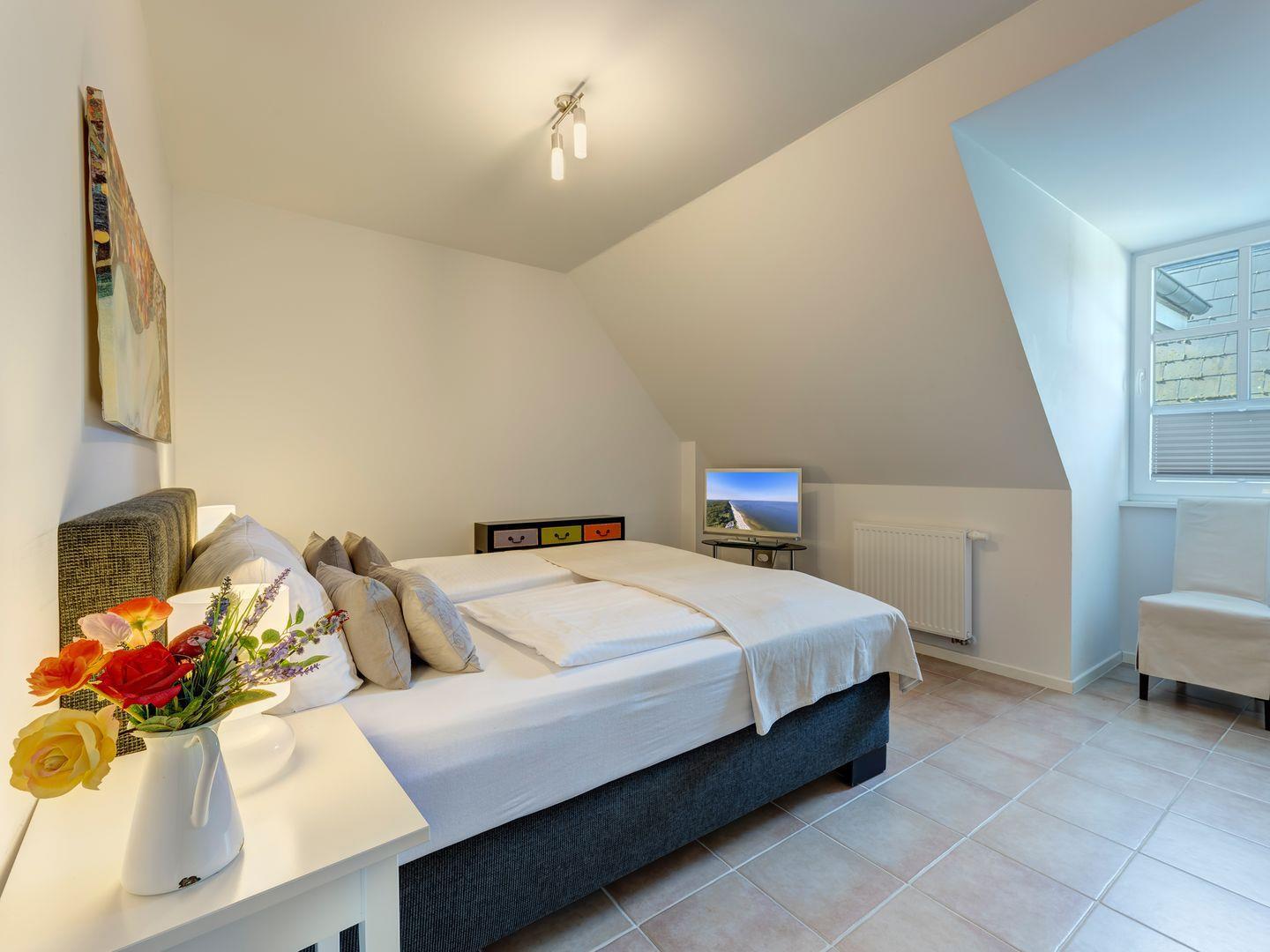 Das Schlafzimmer, modern und exklusiv eingerichtet, bietet ein komfortables Boxspring-Doppelbett und die Möglichkeit, bei Bedarf ein Baby- oder Kinderbett hinzuzufügen. Genießen Sie erholsamen Schlaf oder schauen Sie morgens Ihr (Frühstücks)TV-Programm auf dem zweiten Flachbildfernseher im Bett.