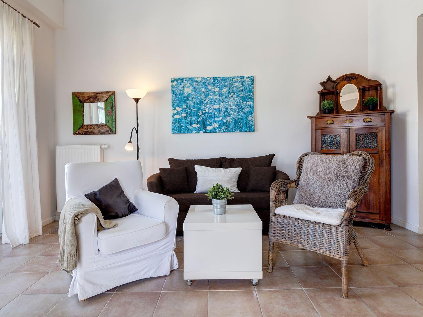 Das großzügige Wohnzimmer lädt mit einem bequemen Sofa, einem Sessel, einem Fernsehsessel, einem antiken Vertikot und einem Flachbildfernseher zum Entspannen ein. Die offene Küche ist vollausgestattet und durch einen Esstisch vom Wohnbereich getrennt.
