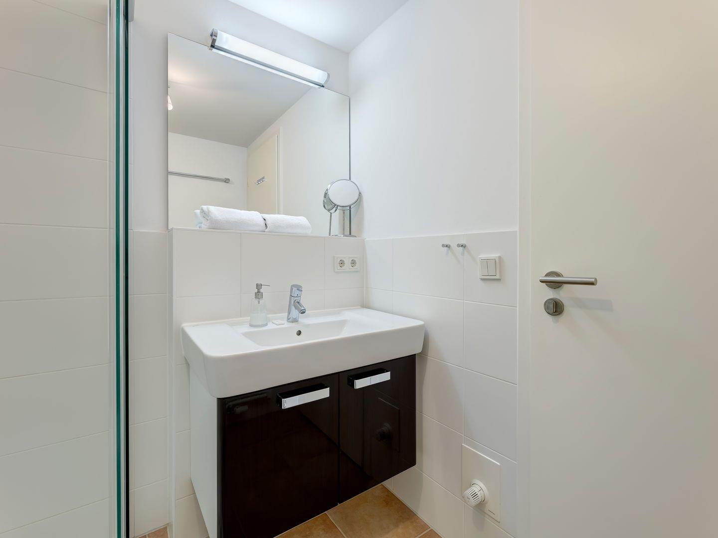 Im Badezimmer erwarten Sie Annehmlichkeiten wie eine ebenerdige Dusche, Kosmetikspiegel und Haartrockner. Das Appartement ist perfekt für zwei Personen, und ein herzliches Willkommen gilt auch einem Kind bis 3 Jahren, das in einem Zustellbett im Schlafzimmer untergebracht werden kann.