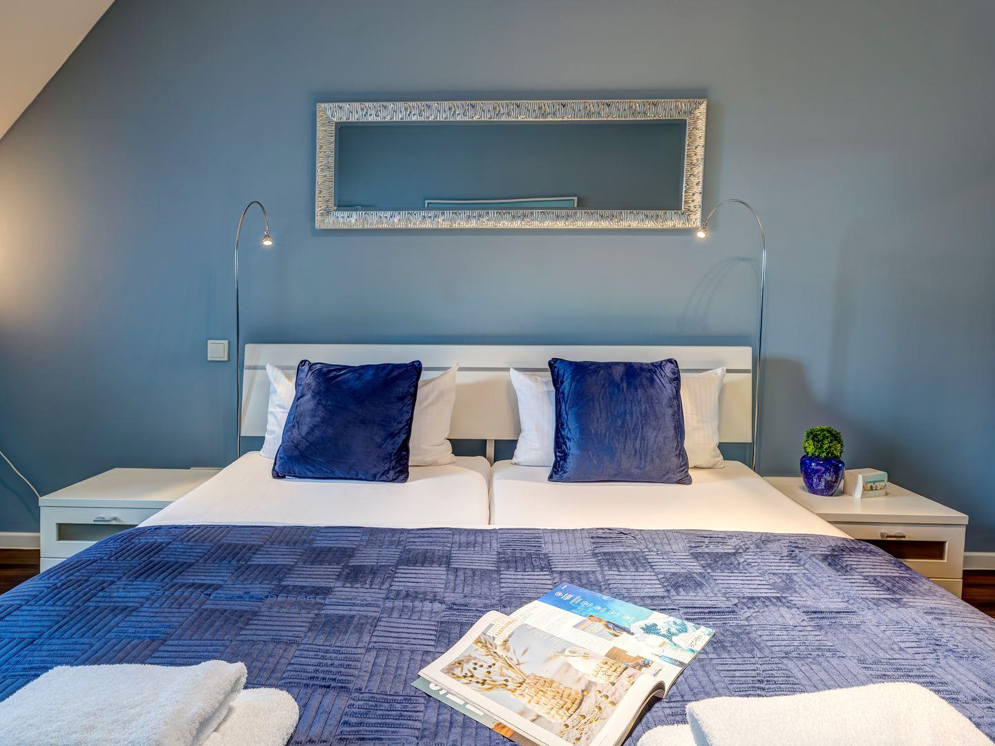 Im Schlafzimmer schaffen wasserblaue Farbtöne an den Wänden und weiße Möbel eine entspannte Atmosphäre von Strand und Wasser. Punktuell und flexibel einstellbare Beleuchtung am Bett laden zu einer kleinen Nachtlektüre ein, ohne den Partner zu stören. Zusätzlich zu den normalen Kopfkissen stehen Ihnen feste Nackenkissen und flauschige Decken zur Verfügung.