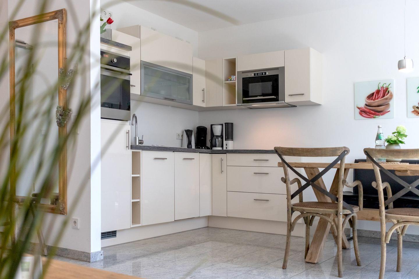 Die erste Ebene der Wohnung bildet den offen gestalteten Wohnbereich. Das Wohnzimmer geht fließend in die moderne Einbauküche mit Vollausstattung über und schafft eine einladende Atmosphäre für gemeinsame Kochabende und entspannte Stunden.