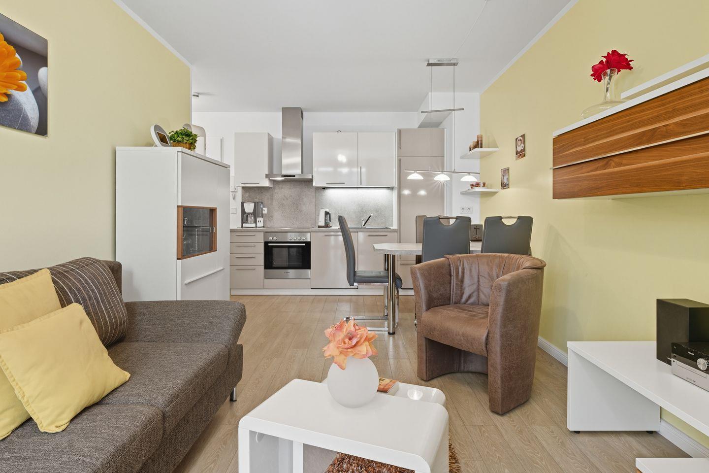 Unsere traumhaft am Achterwasser gelegene Ferienwohnung heißt Sie herzlich willkommen. Die helle und freundliche Wohnung bietet bequem Platz für bis zu 4 Personen und verfügt über einen großzügigen Wohn- und Essbereich sowie ein vollwertiges Schlafzimmer.