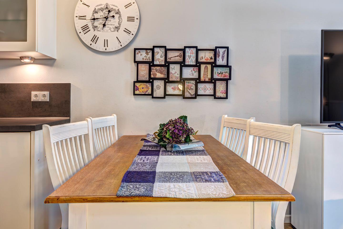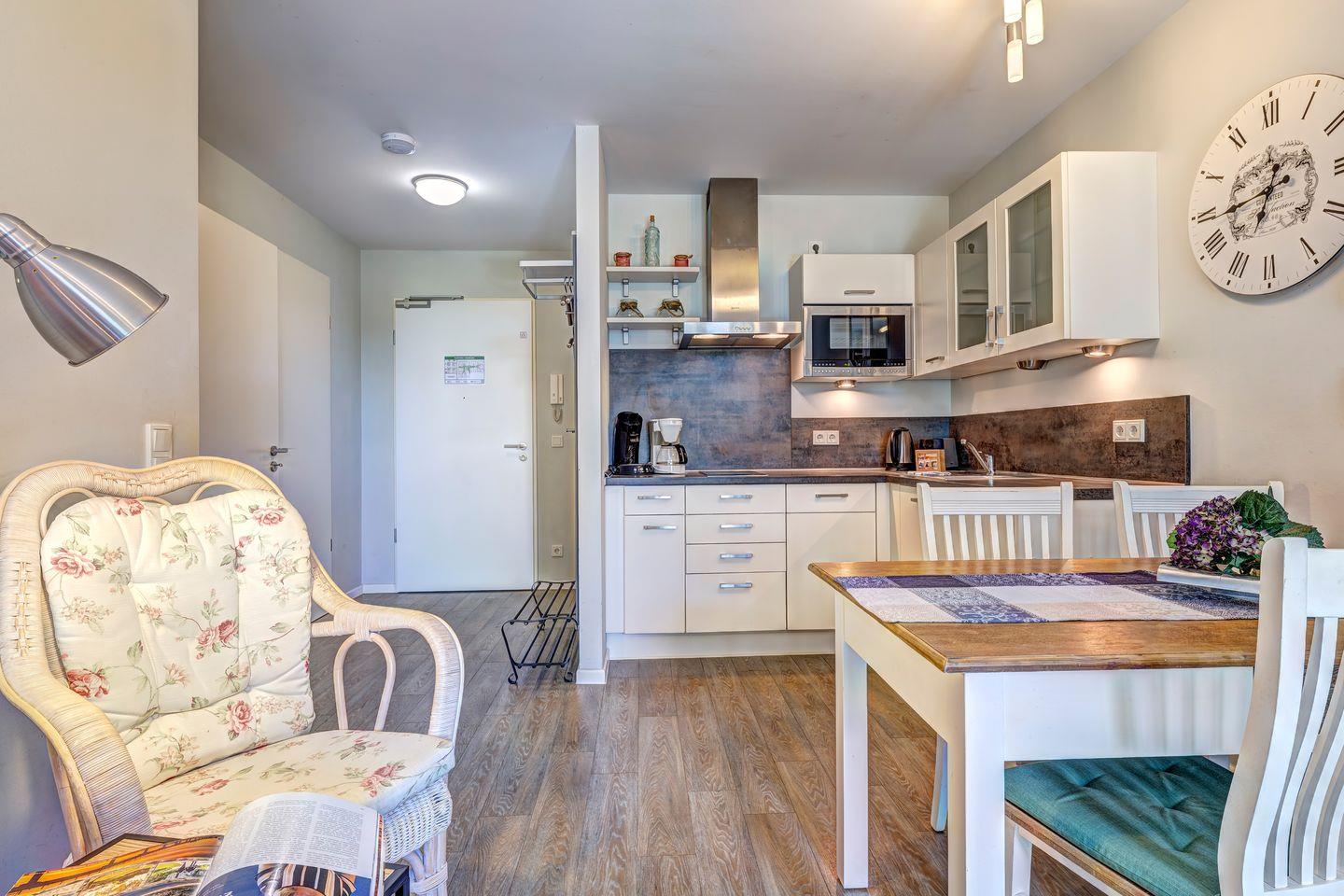 Die 41 m² große Wohnung beeindruckt durch eine gut ausgestattete und moderne Einbauküche mit Vollausstattung, die nahtlos in den gemütlichen Wohnbereich übergeht. Hier können Sie sich ganz nach Belieben kulinarisch verwöhnen und entspannen. Die gemütliche Atmosphäre setzt sich auf der sonnigen Terrasse fort, wo Sie Ihre Urlaubstage inmitten der Natur und an der frischen Luft ausklingen lassen können.