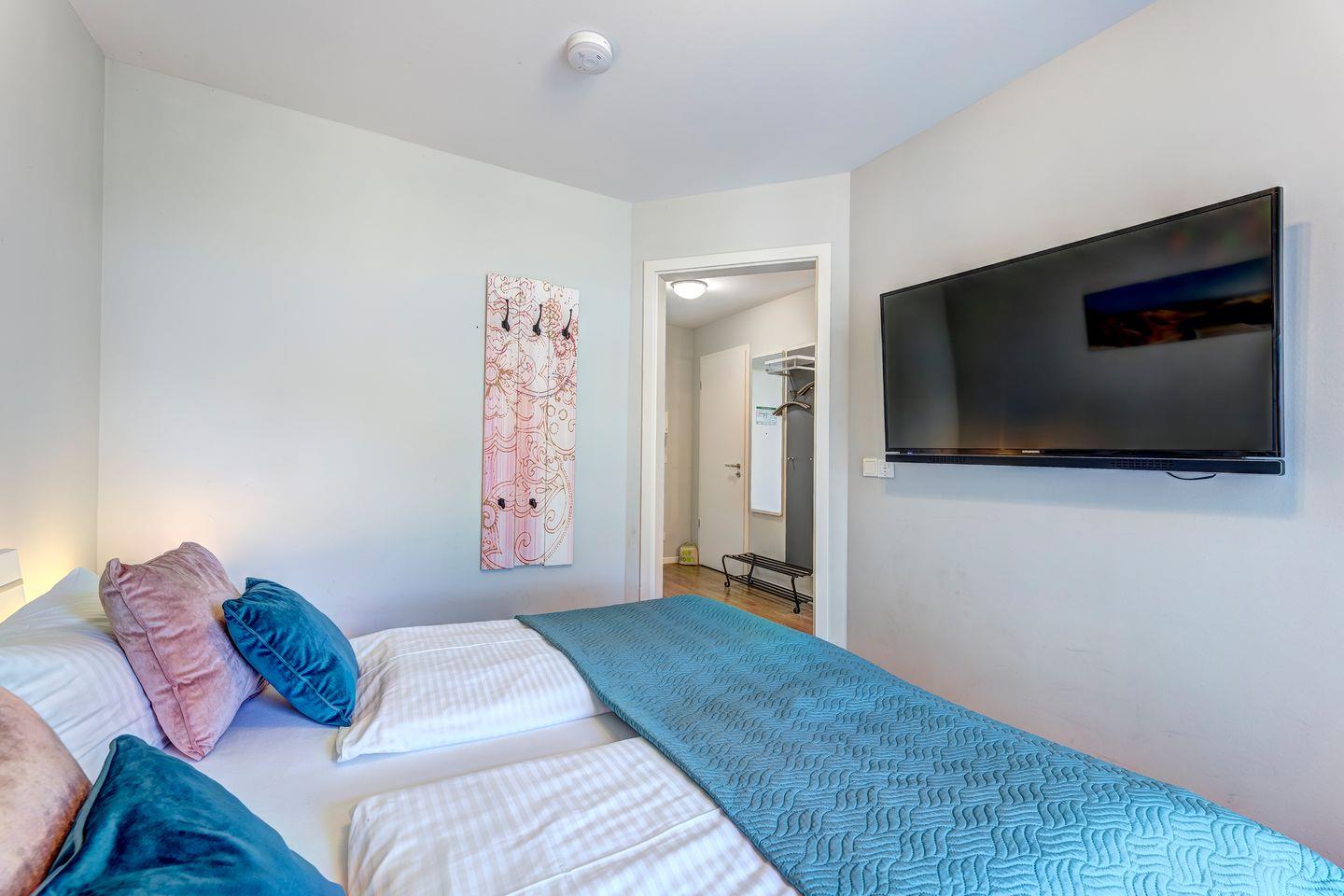 Das vollwertige Schlafzimmer mit einem komfortablen Doppelbett und ein Schlafsofa laden zu erholsamen Nächten ein. Ein eigener Fernseher im Schlafzimmer ermöglicht es Ihnen, sich vor dem Schlafengehen zu entspannen oder morgens in Ruhe zu frühstücken.