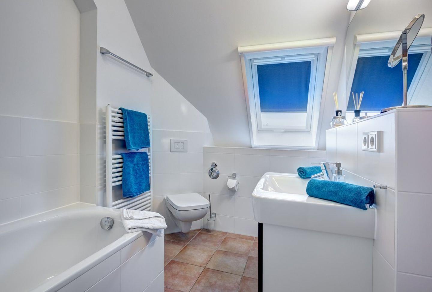 Genießen Sie entspannte Momente auf dem mit einer Markise versehenen Balkon, der einen direkten Blick auf das malerische Achterwasser ermöglicht. Der offene Giebel im Wohnbereich verleiht der Wohnung eine besondere Atmosphäre, während der Elektrokamin für zusätzliche Gemütlichkeit sorgt.