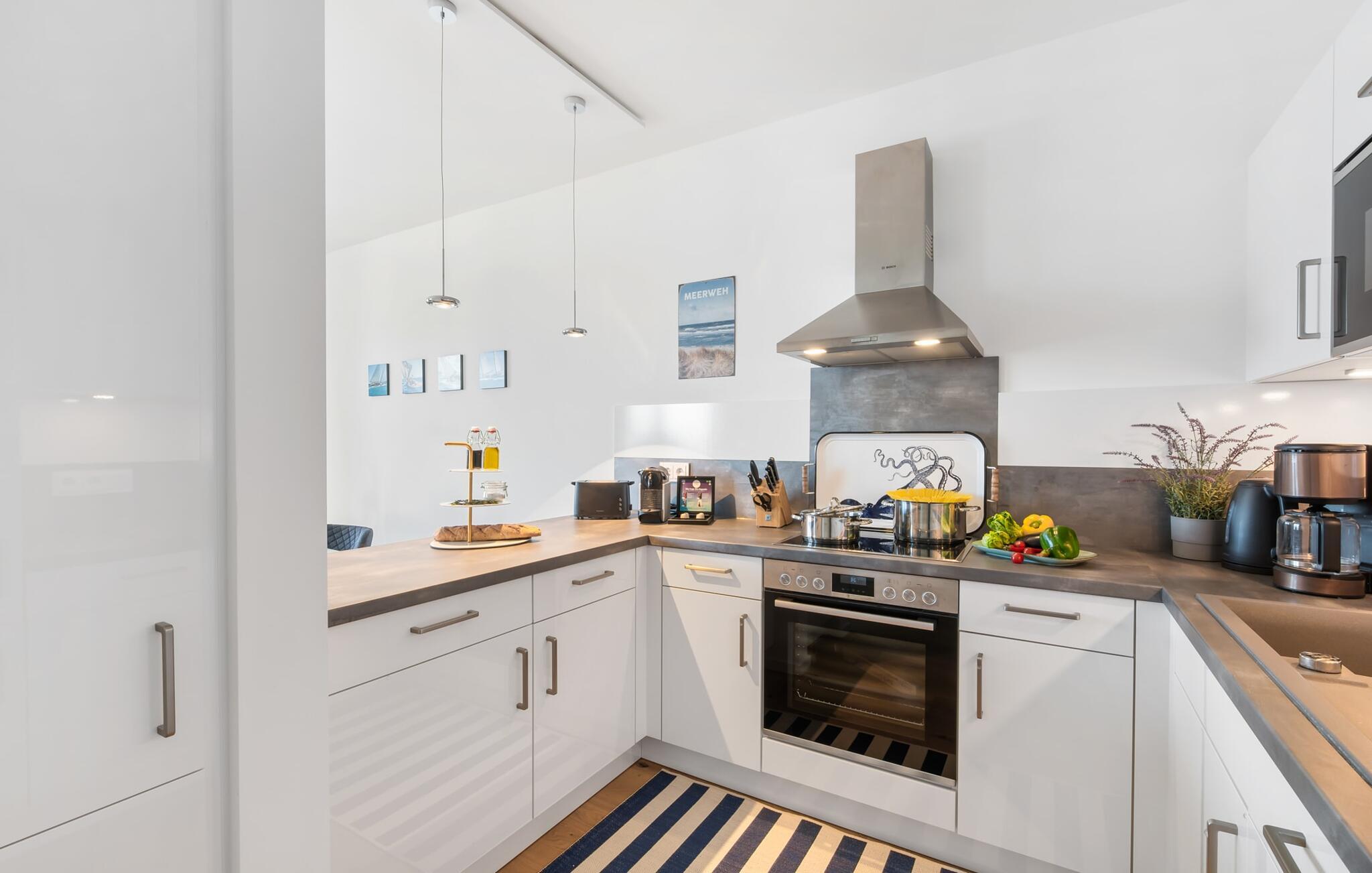Det moderne køkken er veludstyret, at lave mad sammen er sjovt her og kan være en vidunderlig ferieoplevelse.