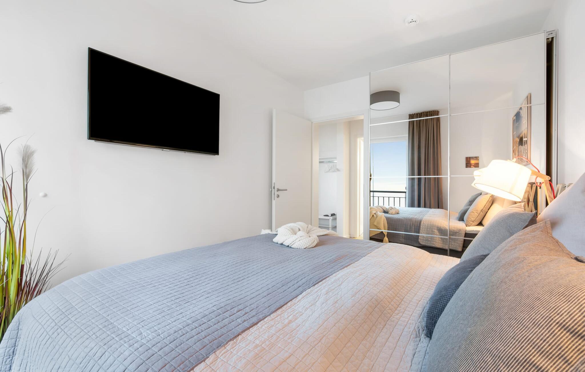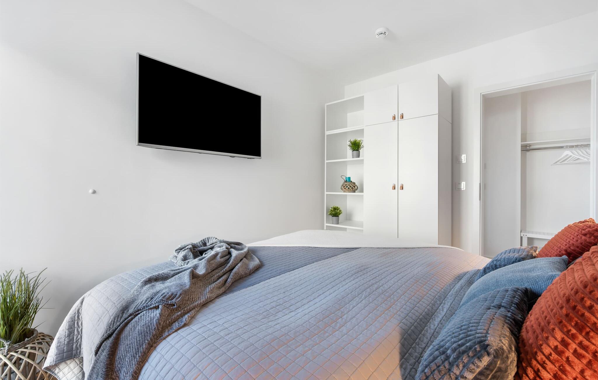 Begge soveværelser er også oversvømmet med lys gennem gulv-til-loft vinduer og er hver udstyret med en komfortabel dobbelt boxmadras og fjernsyn. Afslappende søvn er næsten garanteret.