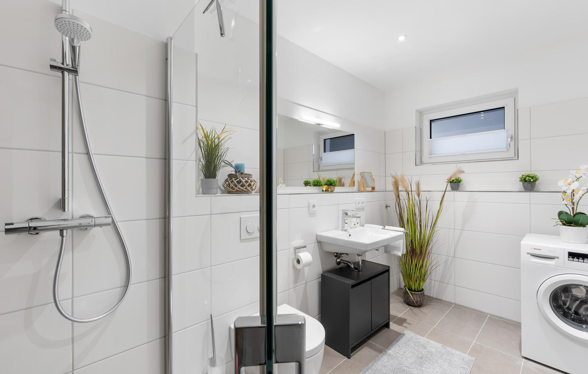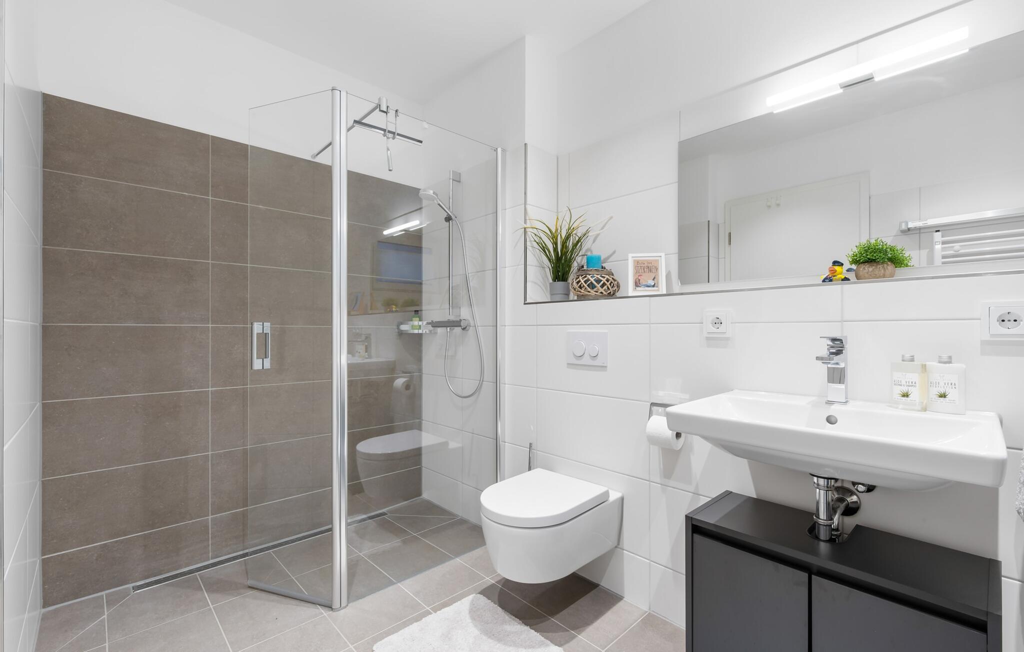 Badeværelset med bruseniche lader intet tilbage at ønske og byder på alt hvad du behøver for at starte en ny feriedag.