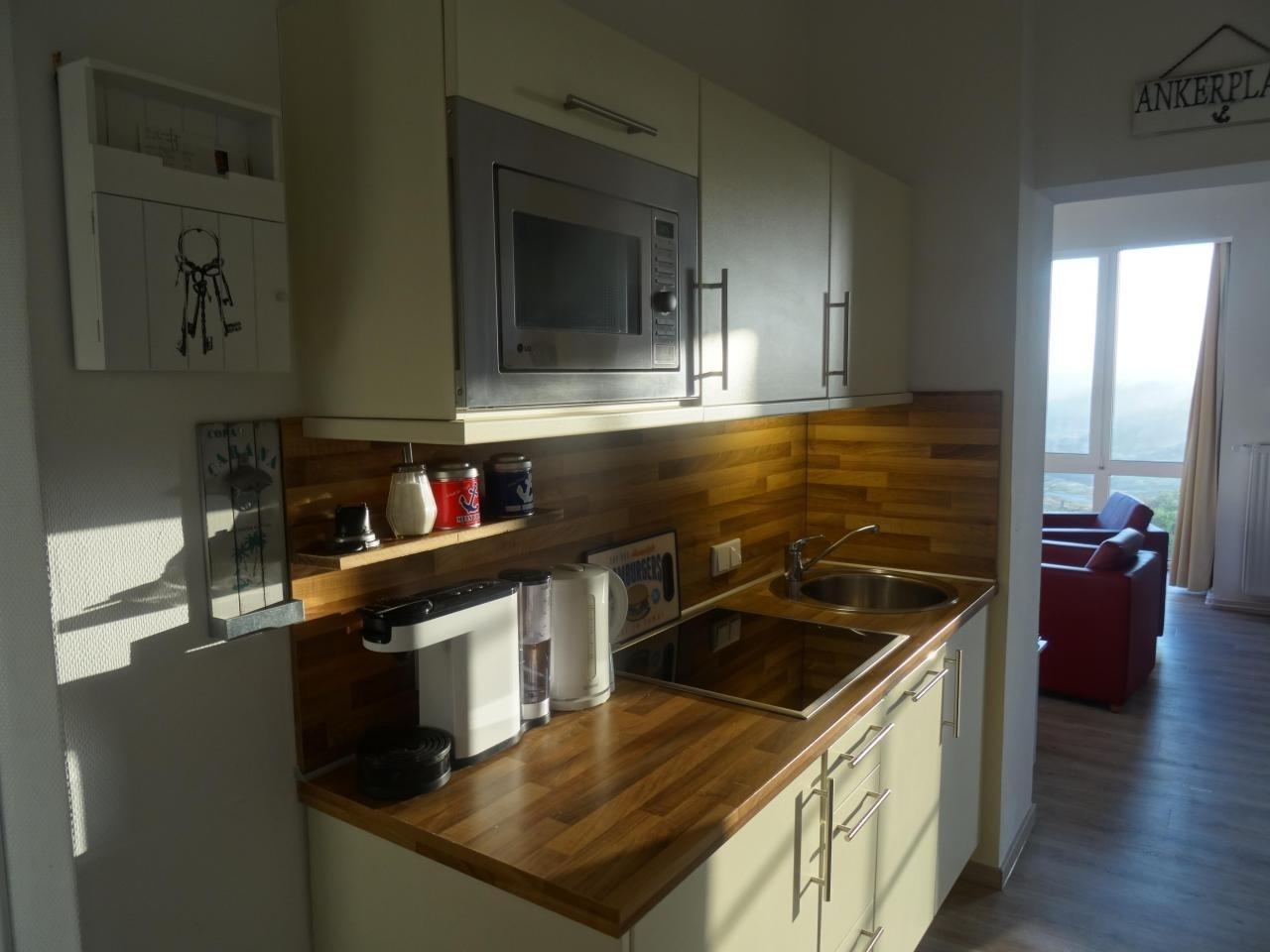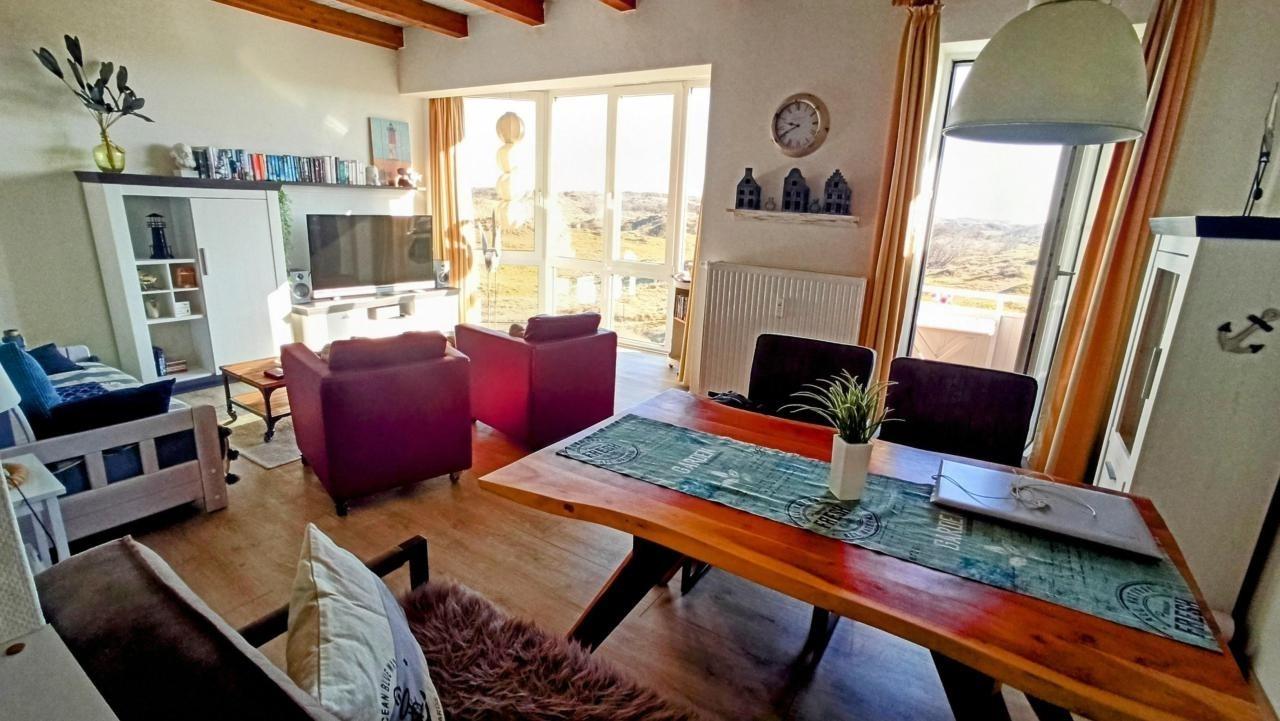 Die FeWo besticht durch Ihre Einrichtg. sowie das großzügige Panoramafenster und einen Balkon mit schöner Aussicht auf die Dünenlandschaft. Die Küche ist vollständig einger. (4-Platten-Cerankochfeld, Geschirrspü., Mikrow., Senseo-Duo-Kaffeem. etc). Für einen gemütl. Abend steht Ihnen ein TV/125 cm einschl. Stereoanlage mit CD/DVD zur Verfügung. Bettwäsche und Handtücher sind i. P. enthalten.