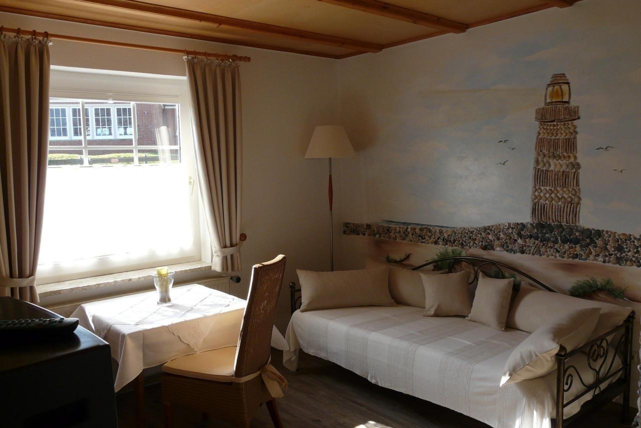 Wohnung für 2 Personen, sonnige Terrasse nach Süden, Doppelzimmer mit Doppelbett, Wohnzimmer mit Tagesbett und Küchenzeile, Naturmuschelwände mit Leuchtturm und Miesmuschelblumen, Dusche/WC, TV-Flachbildschirm & Stereoanlage, Wohnung in zentraler Lage
