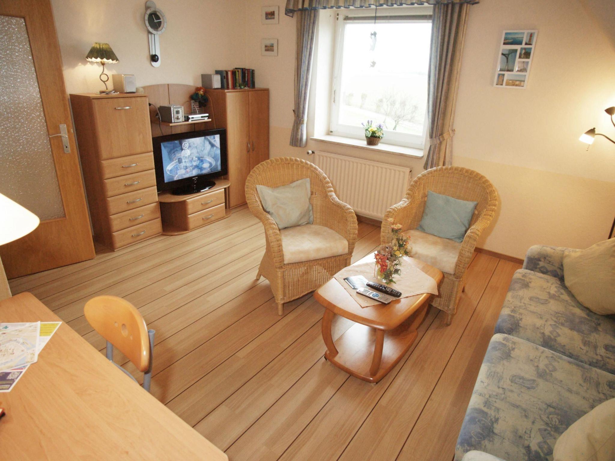 The apartment consists of a bedroom, a living room with the possibility of additional beds and a shower room, as well as a kitchen. This apartment was renovated and modernised in winter 2012. The bedroom has a double bed with an adjustable slatted frame. There is plenty of space in the living room for cosy hours in front of the TV, with a sofa and two armchairs. The kitchen is separate. The bathroom has a shower. There are no carpeted floors.