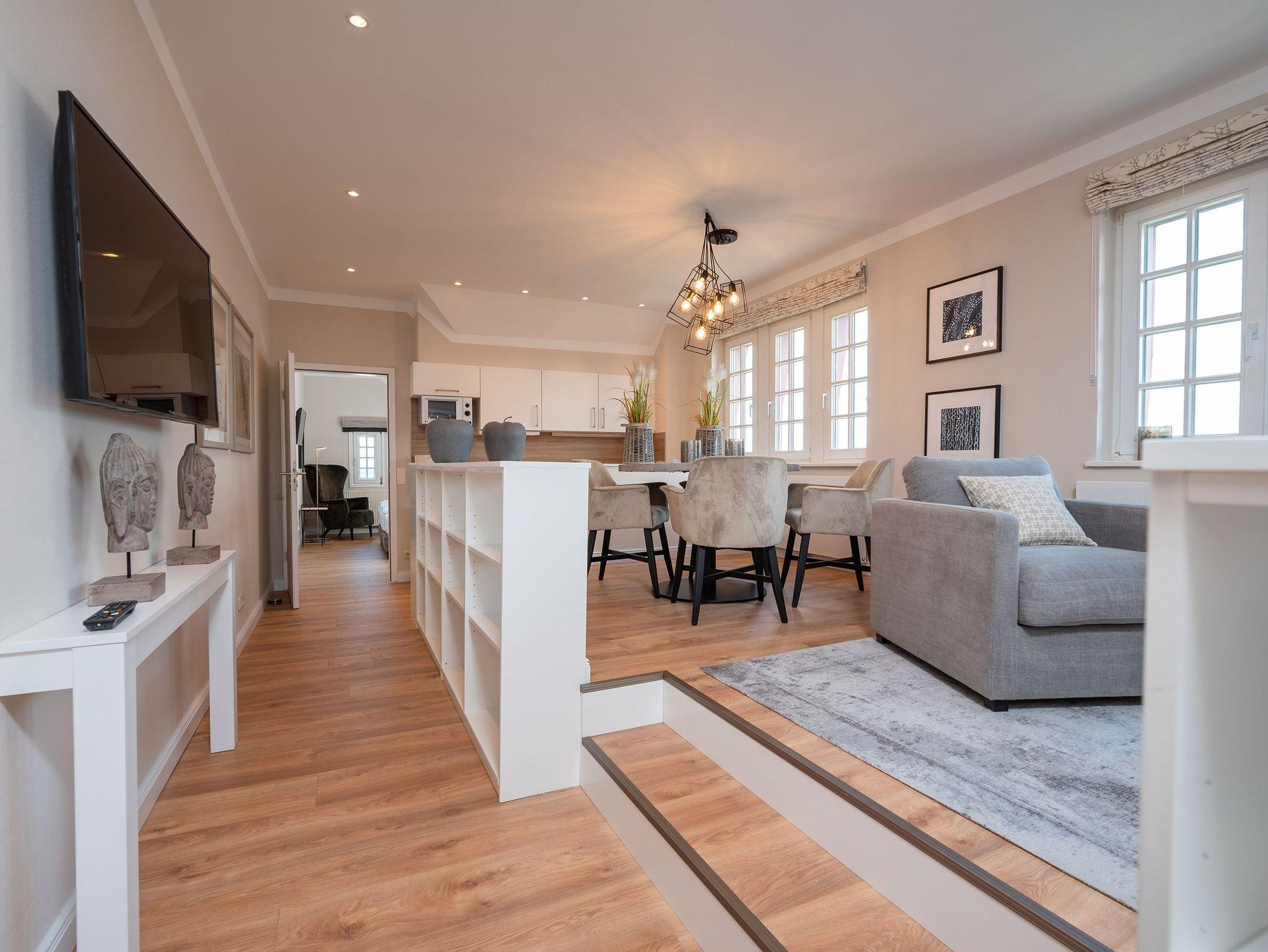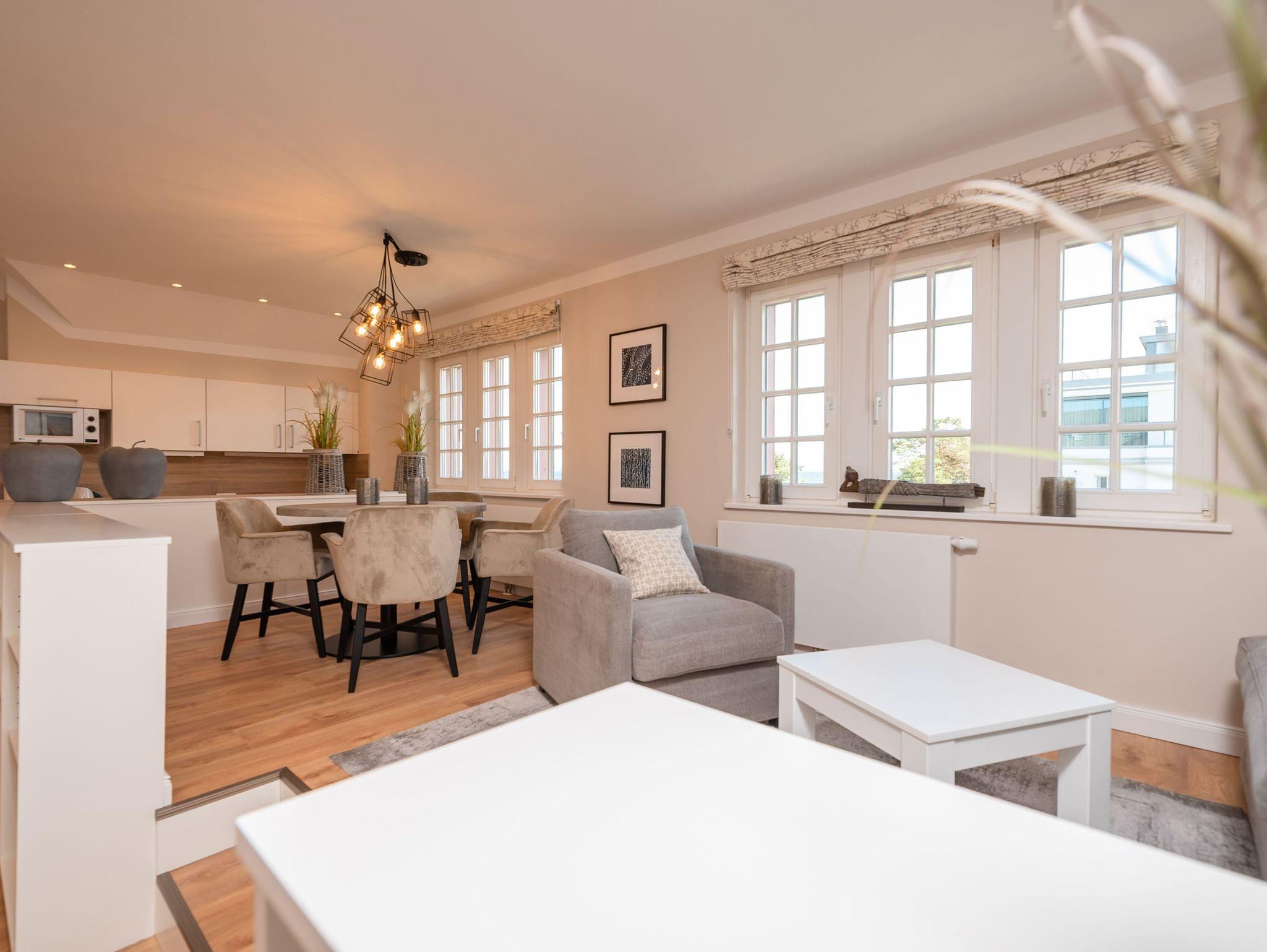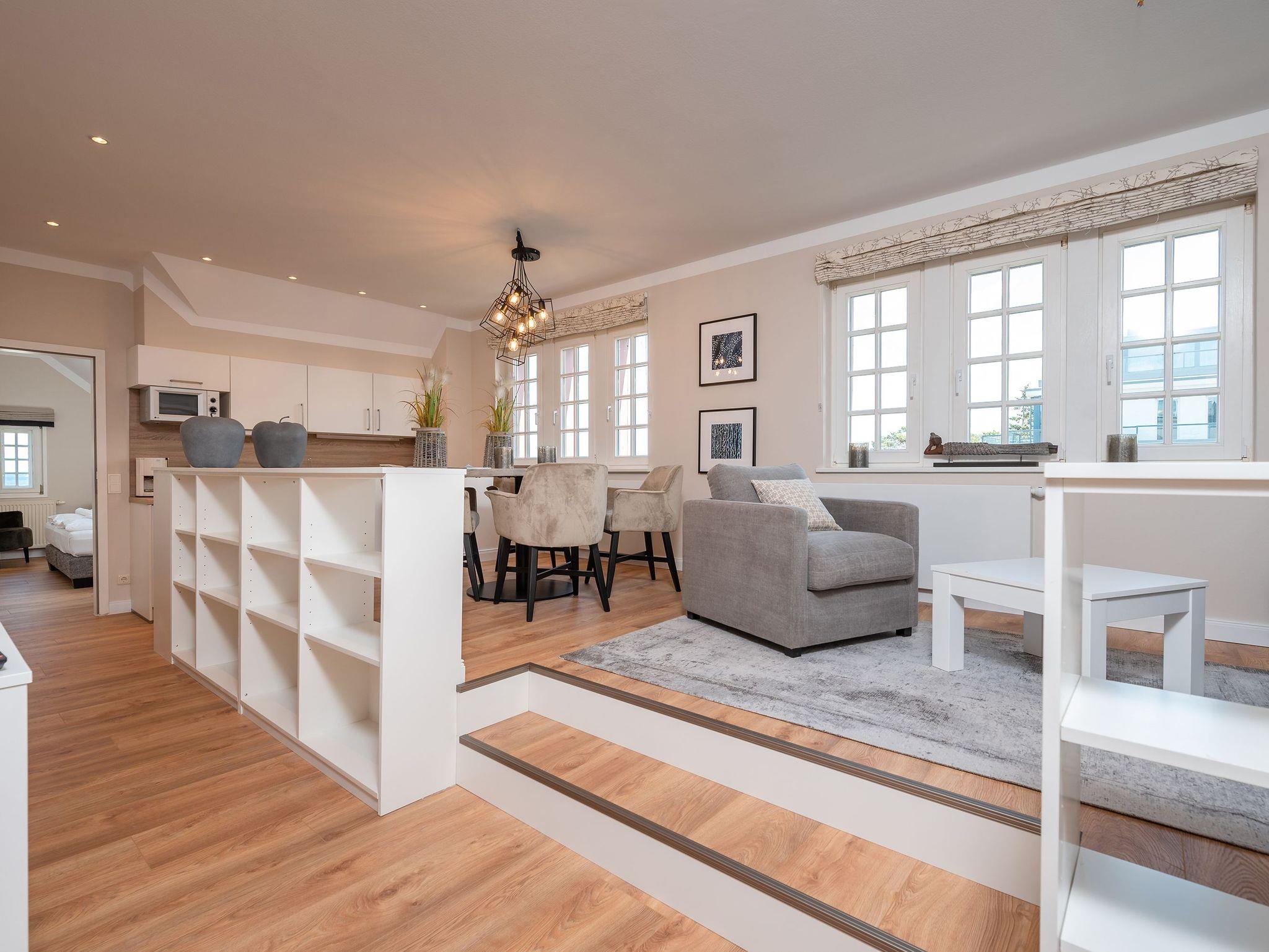 Die Wohnung ist stilvoll eingerichtet und bietet Platz für bis zu 4 Personen. Im gemütlichen Wohn- und Essbereich mit Seeblick können Sie entspannte Momente genießen. Die vollausgestattete Küchenzeile lädt zu gemeinsamen Kochabenden ein. Zwei komfortable Schlafzimmer garantieren ruhige Nächte: eines mit einem Doppelbett und das andere mit zwei Einzelbetten. Das moderne Badezimmer ist mit einer großen Dusche, WC und ausreichend Platz für Ihre Urlaubsutensilien ausgestattet.