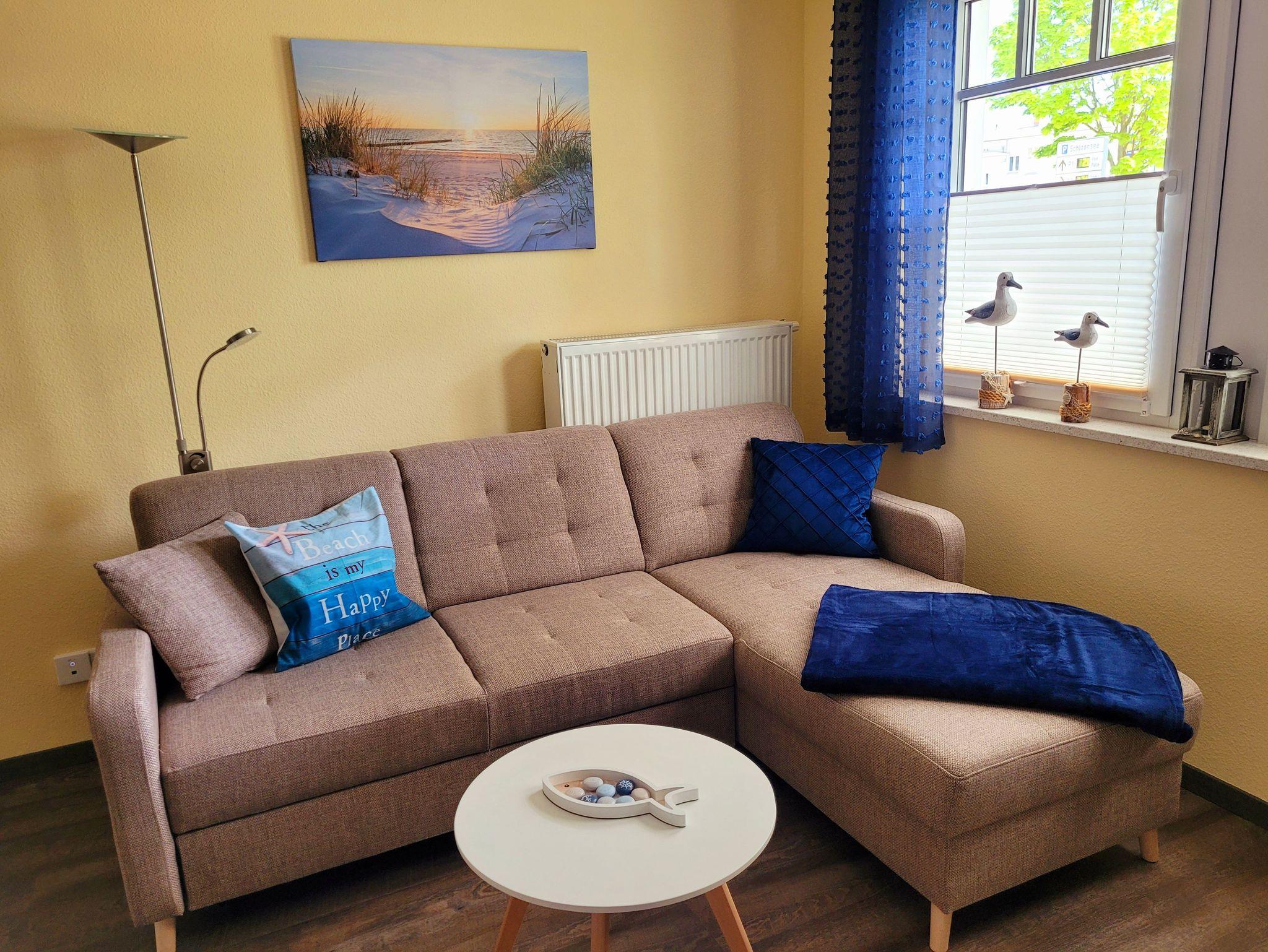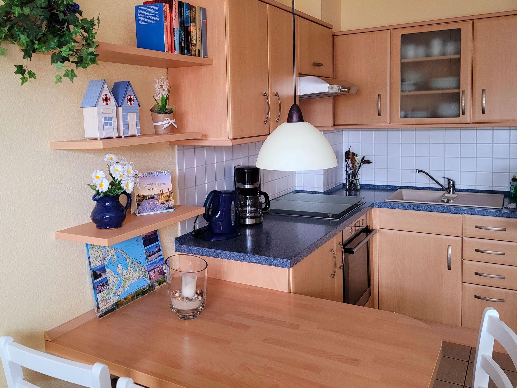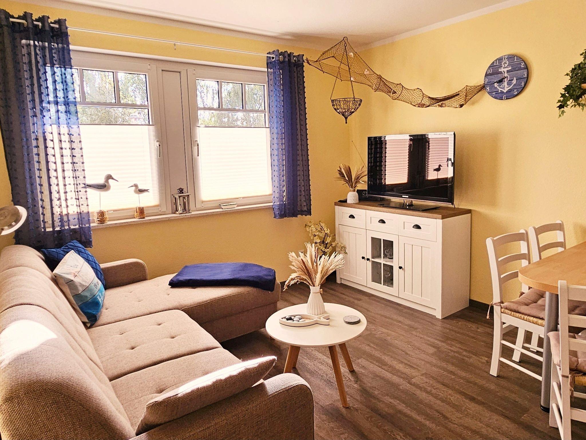 Die gemütliche maritime Ferienwohnung ist 32 qm und liegt im Erdgeschoß. Der kombinierte Wohnraum verfügt über eine gemütliche Couch, Couchtisch, Kabel-TV, Radio mit CD-Player, DVD-Player sowie eine Küchenzeile mit 4 Platten-Induktionsherd, Backofen, Spüle, Kühlschrank mit Gefrierfach, Kaffeemaschine, Toaster, Wasserkocher, Mikrowelle und einen Esstisch mit 3 Stühlen.