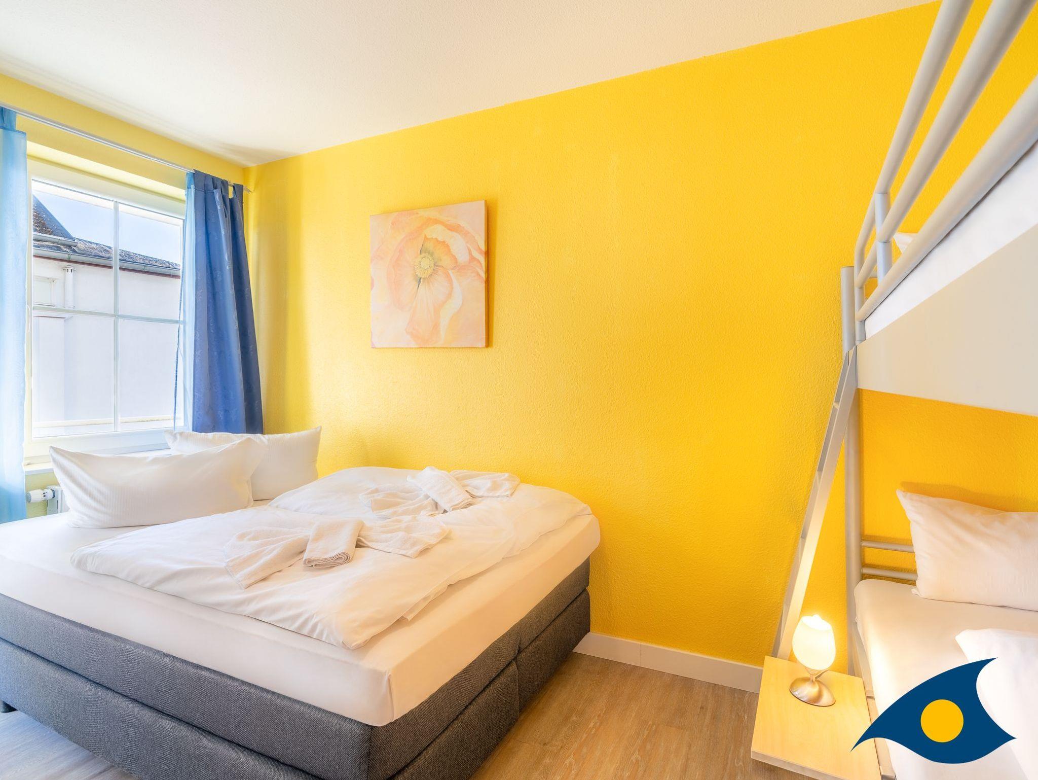 Zu der Wohnung gehören ein Wohnzimmer mit Küchenzeile und Essecke, ein Schlafzimmer mit Doppelbett, ein weiteres Schlafzimmer mit Doppel- und Etagenbett, ein Badezimmer mit Dusche und WC inkl. Kosmetikspiegel sowie ein Gäste WC.
