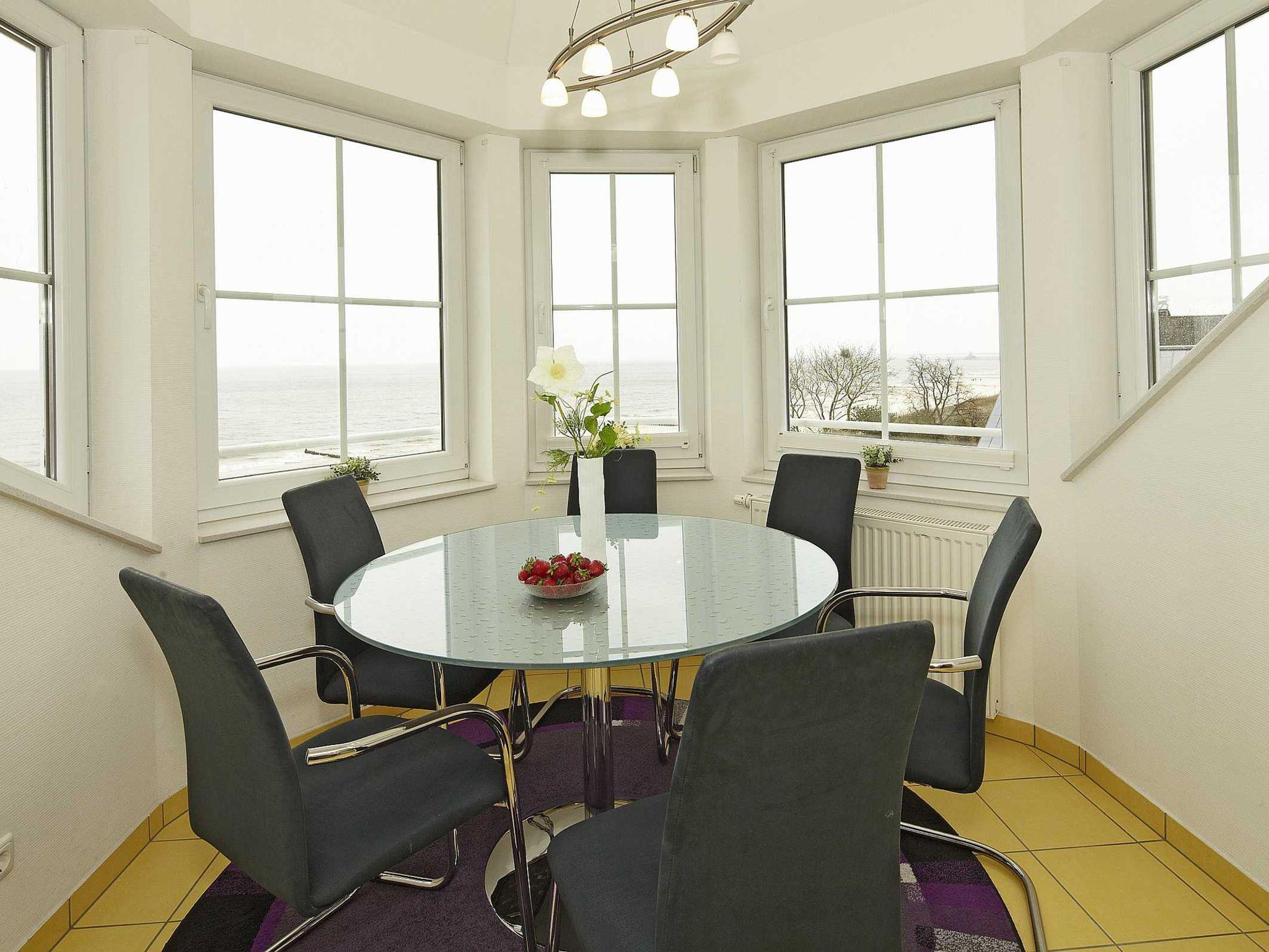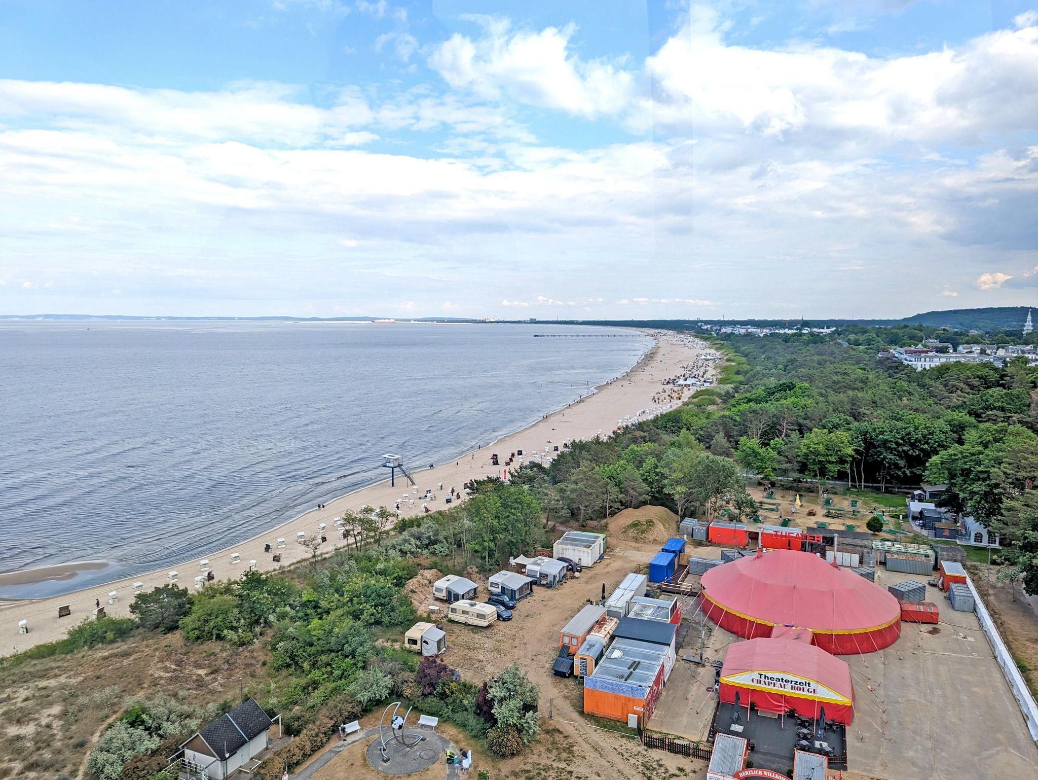 Panorama Meerblick bis Wollin, auch von dem sonnigen nicht einsehbaren großem Süd-West Balkon. Die modern und komfortabel eingerichtete 3-Zimmer Ferienwohnung im Dachgeschoß der Dünenresidenz ist bequem mit dem Fahrstuhl, auch von der kostenfreien Tiefgarage, zu erreichen. Die 75m² große Ferienwohnung besteht aus einem Schlafzimmer mit Doppelbett, einem 2. Schlafzimmer mit einem Einzelbett und einem Etagenbett für 2 Personen, einem Badezimmer mit Duschkabine und Eckbadewanne (keine Whirlpoolfunktion), einem Wohnraum mit großem Balkon und einer voll ausgestatteten Küchenzeile im Esszimmer. Das Esszimmer befindet sich im verglasten Eckturm mit traumhaftem Blick über die Ostsee und den Schlonsee. Ein WLAN Netzwerk und ein Tiefgaragenplatz (Nummer 22) steht Ihnen kostenfrei zur Verfügung.