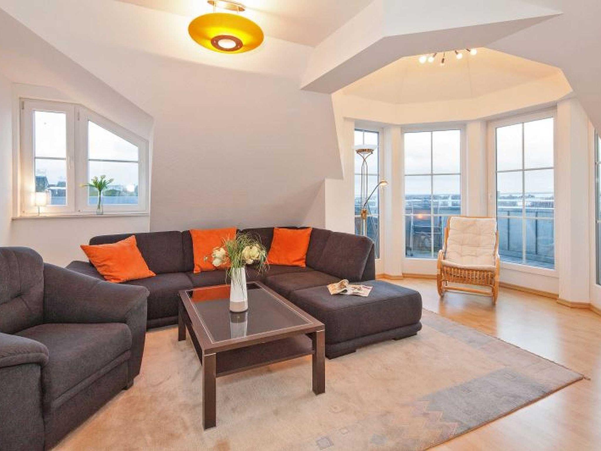 Panorama Meerblick bis Wollin, auch von dem sonnigen nicht einsehbaren großem Süd-West Balkon. Die modern und komfortabel eingerichtete 3-Zimmer Ferienwohnung im Dachgeschoß der Dünenresidenz ist bequem mit dem Fahrstuhl, auch von der kostenfreien Tiefgarage, zu erreichen. Die 75m² goße Ferienwohnung besteht aus einem Schlafzimmer mit Doppelbett, einem 2. Schlafzimmer mit einem Einzelbett und einem Etagenbett für 3 Personen, einem Duschbad, einem Wohnraum mit großem Balkon und einer voll ausgestatteten Küchenzeile im Esszimmer. Das Esszimmer befindet sich im verglasten Eckturm mit traumhaftem Blick über die Ostsee und den Schlonsee. Ein Tiefgaragenplatz (Nummer 22) steht kostenfrei zur Verfügung