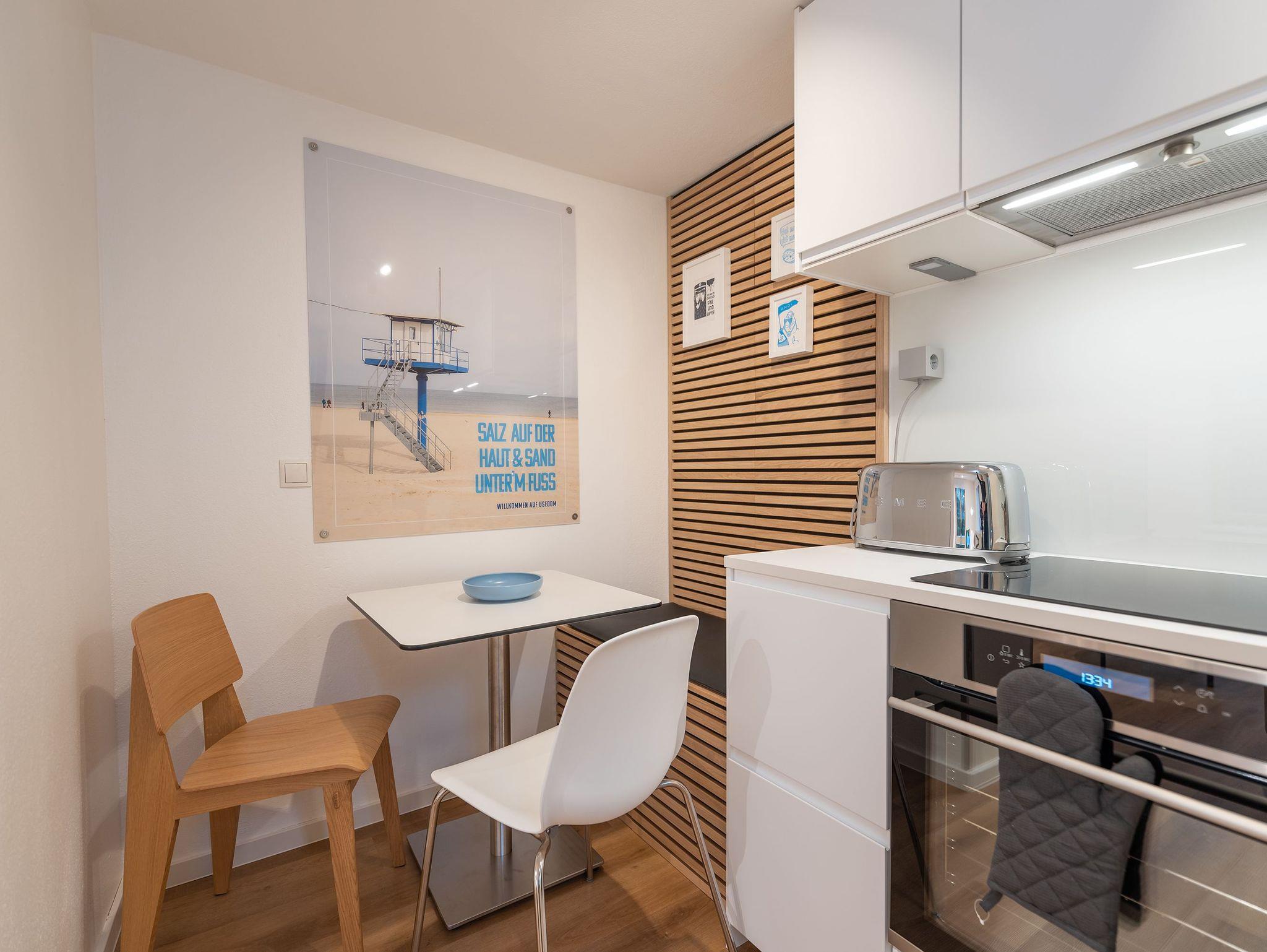 Das Appartement empfängt Sie mit einem offenen Wohn- und Essbereich, der modernen Komfort und Gemütlichkeit vereint. In der gut ausgestatteten Küche mit Esstisch lassen sich mühelos kleine und große Mahlzeiten zubereiten. Die angrenzende Wohnlandschaft verfügt über eine Schlafcouch und einen Flachbild-TV perfekt für entspannte Stunden oder eine zusätzliche Schlafgelegenheit.