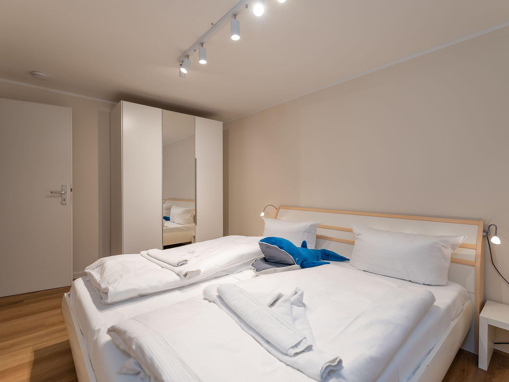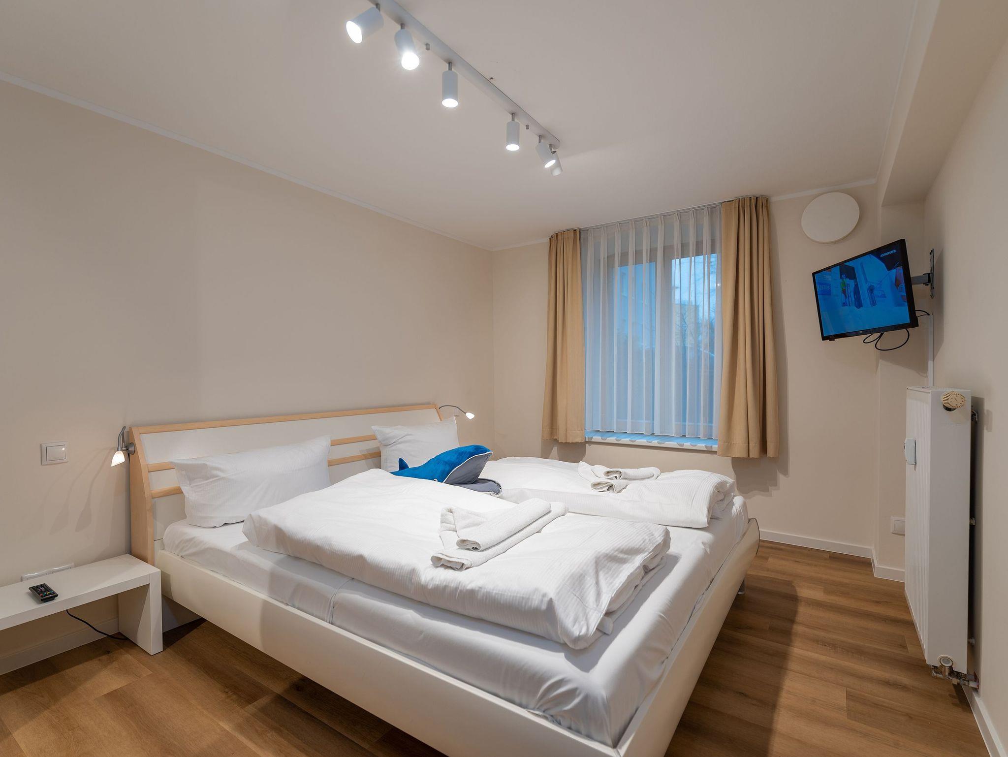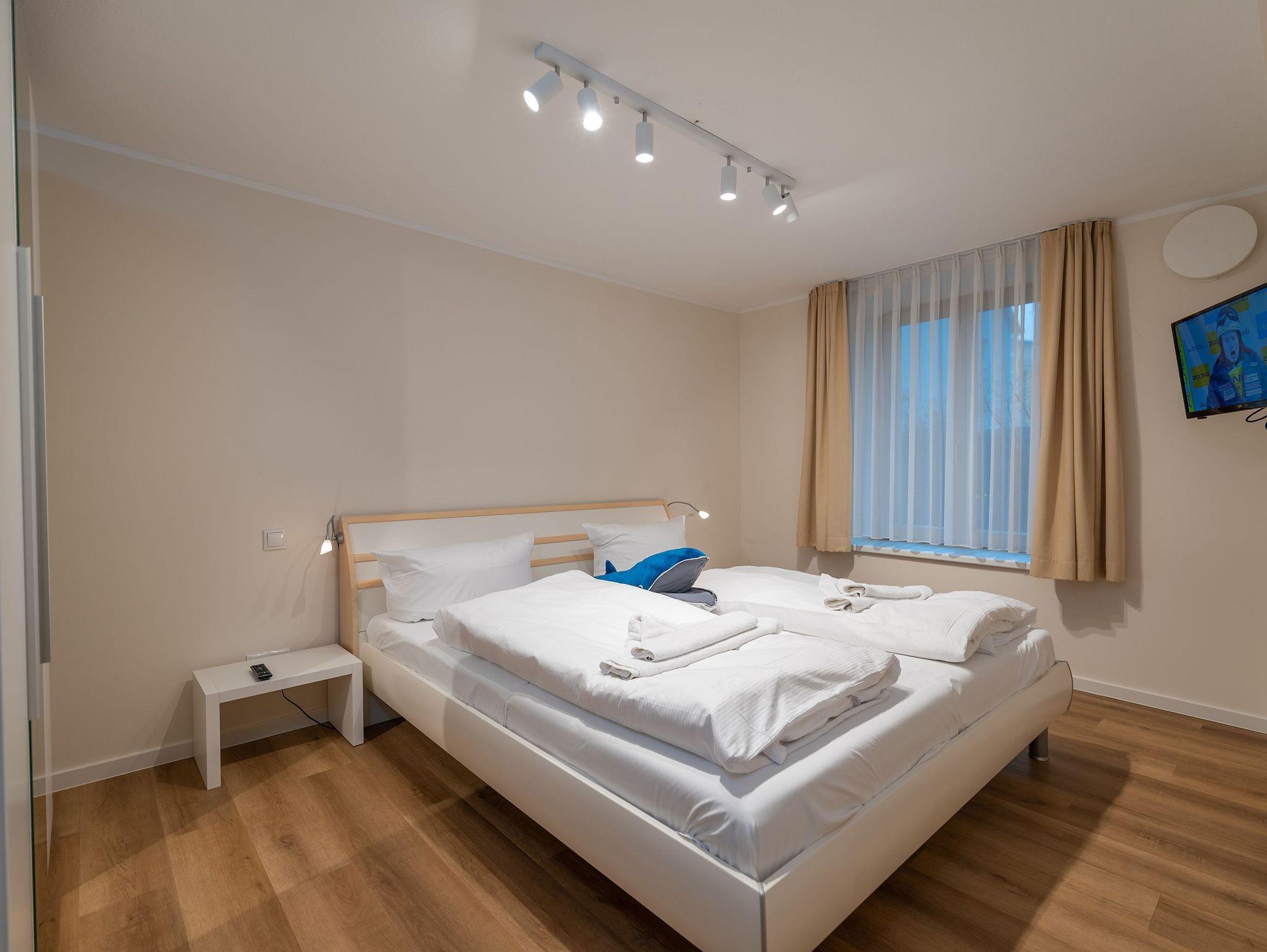 Das separate Schlafzimmer bietet ein gemütliches Doppelbett, einen wandmontierten Flachbild-TV und einen geräumigen Kleiderschrank ? ideal für längere Aufenthalte. Im modernen Tageslicht-Badezimmer mit Eckdusche, Waschbecken und WC sorgt ein großes Fenster für angenehmes Licht und frische Luft.