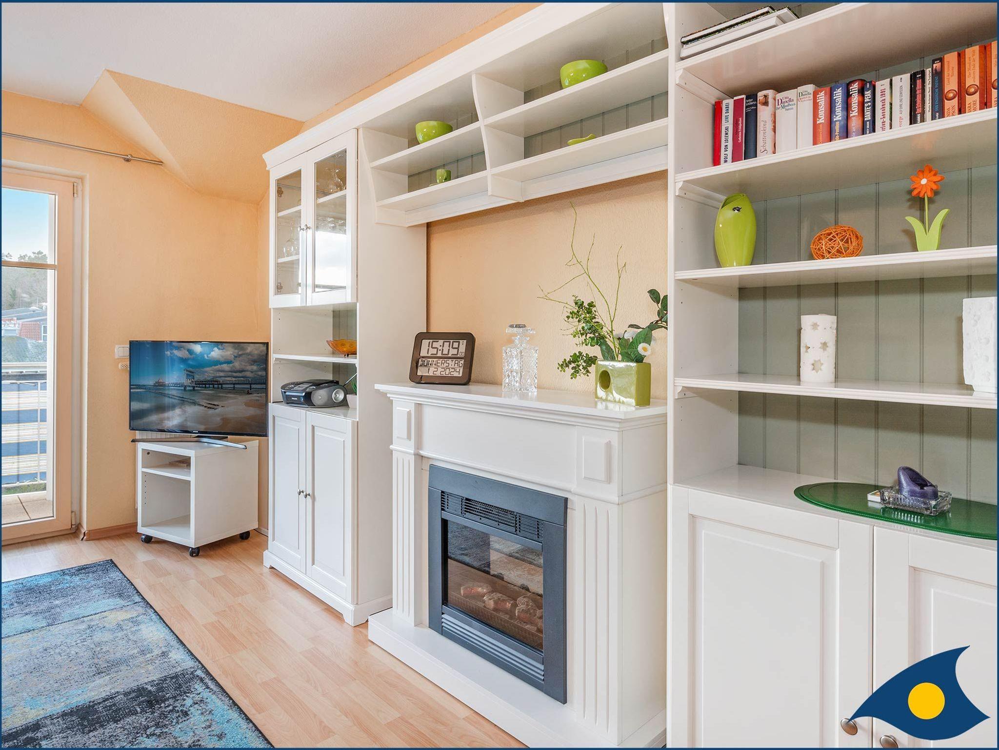 Das Appartement verfügt über ein gemütliches Wohnzimmer mit einer integrierten, gut ausgestatteten Küchenzeile mit Essbereich, zwei Schlafzimmer mit bequemen Doppelbetten, ein Duschbad mit Tageslicht und einen kleinen, sonnigen Balkon. Der elektrische Kamin im Wohnzimmer sorgt für eine gemütliche Atmosphäre.