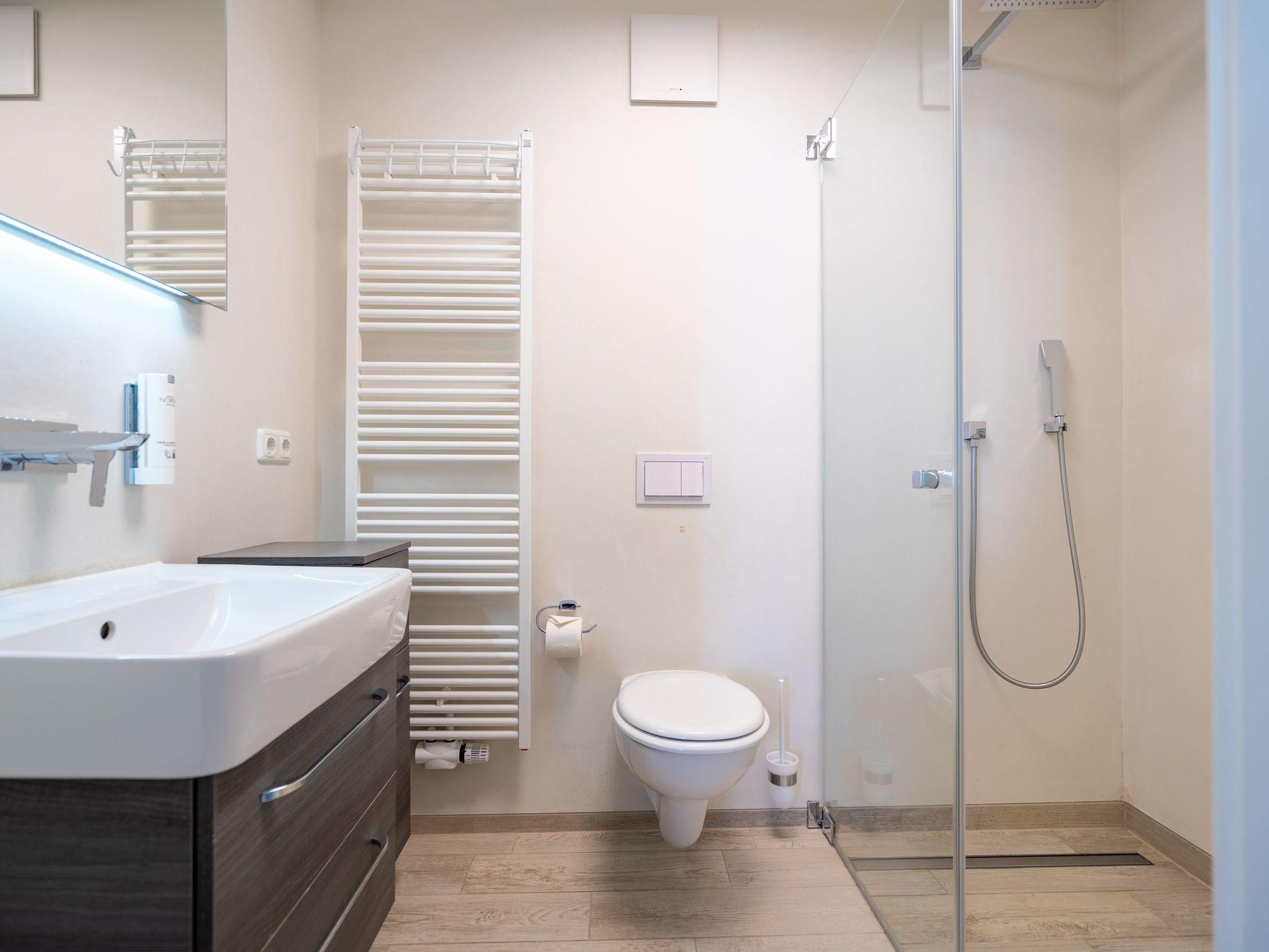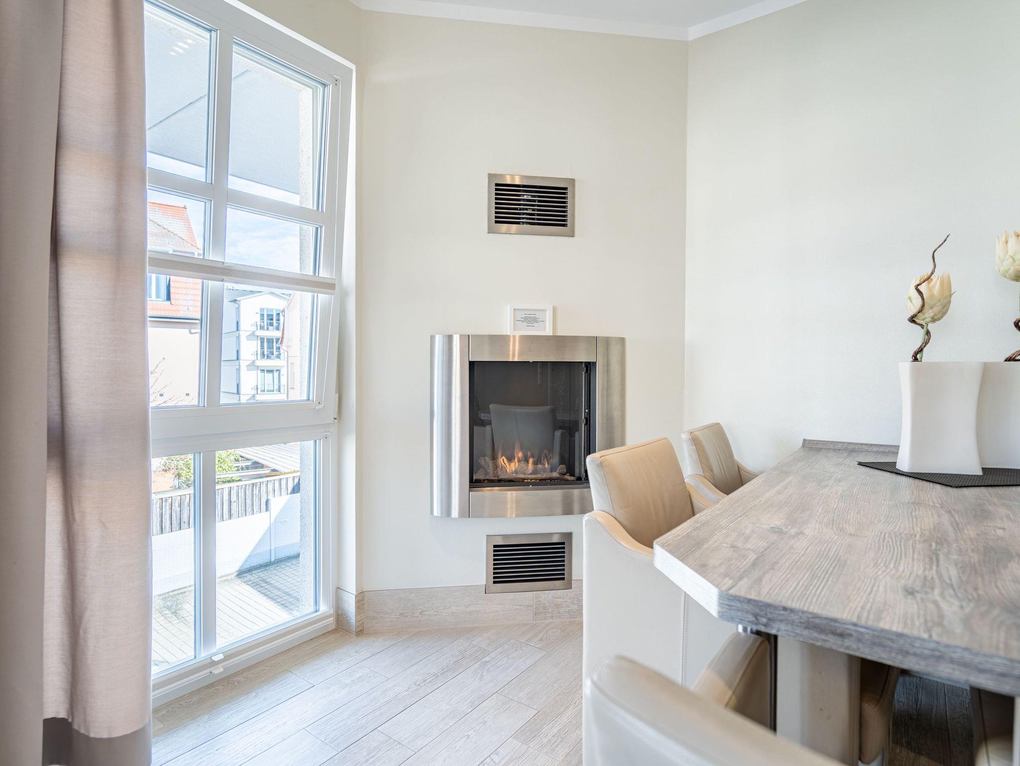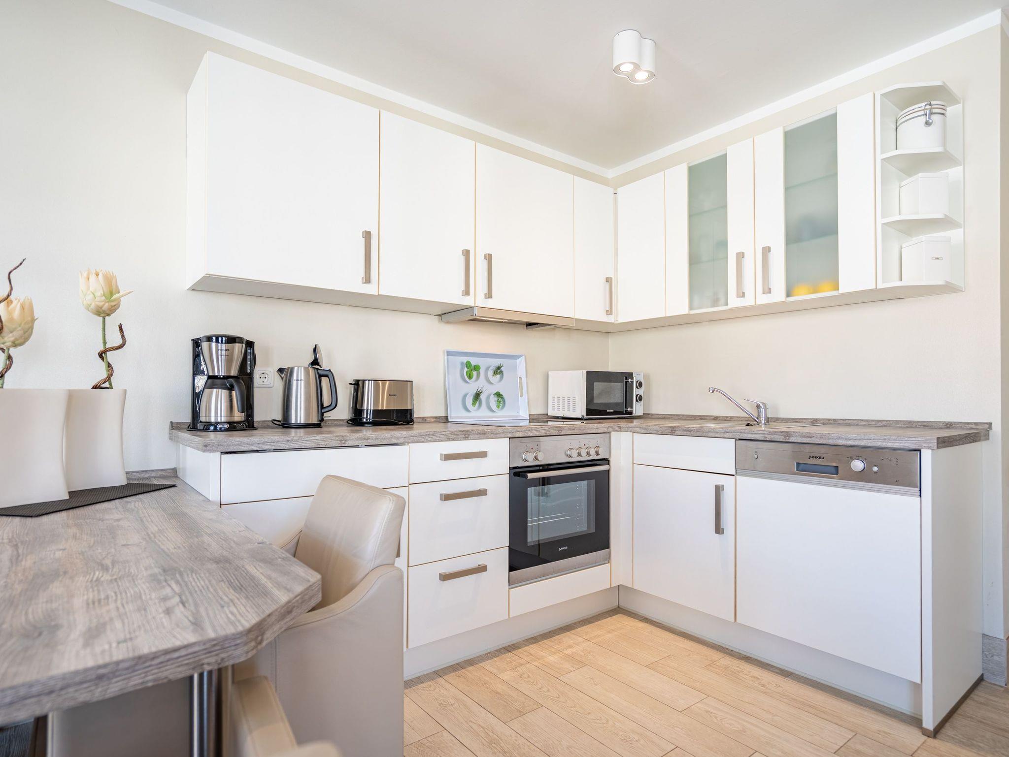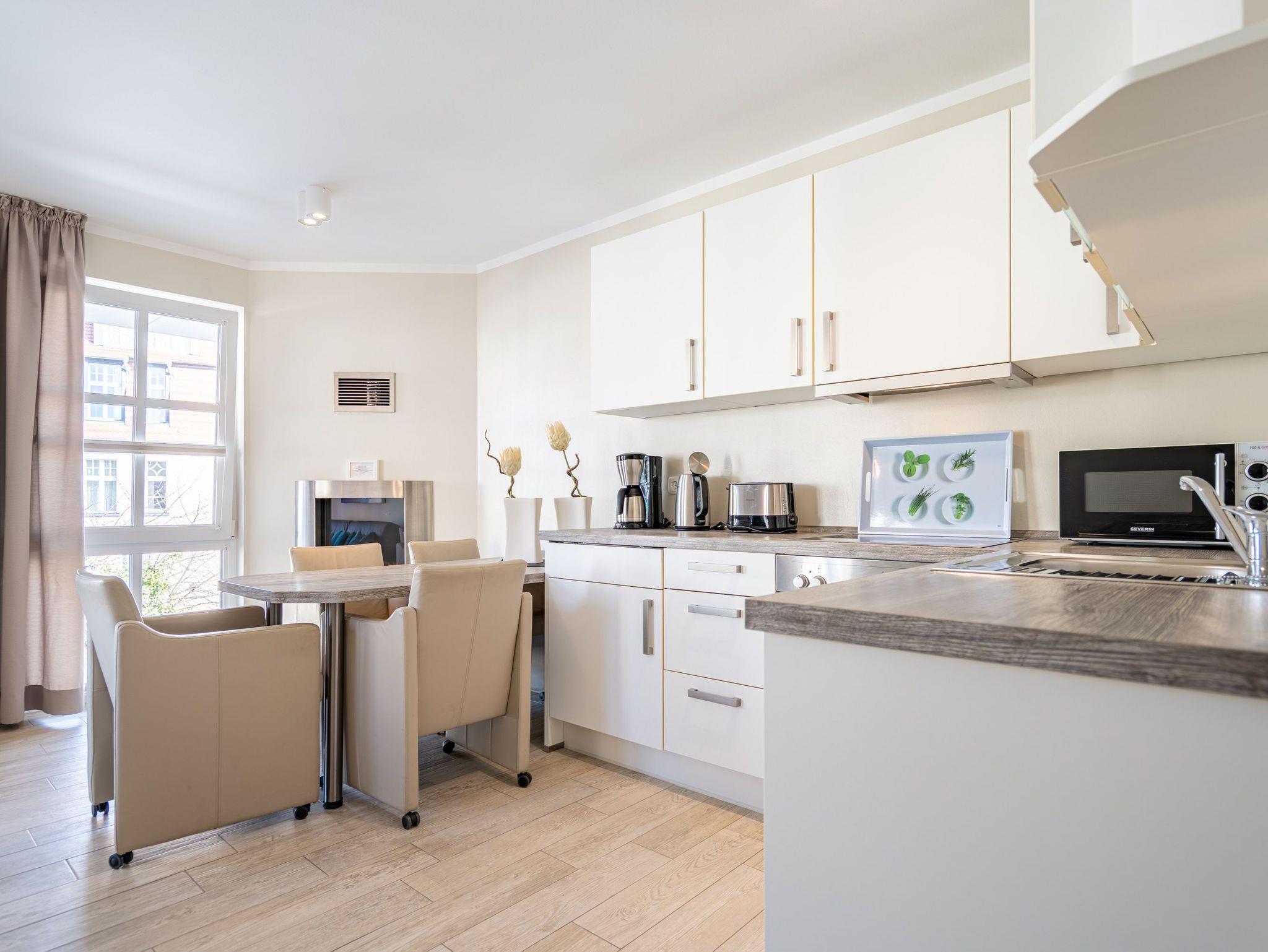 Diese stilvolle 3-Raum-Ferienwohnung (58 qm) im 2. Obergeschoss bietet Platz für bis zu 4 Personen. Helle, modern eingerichtete Räume mit harmonisch abgestimmten Farben und Materialien schaffen eine gemütliche Atmosphäre. Der offene Wohnbereich verfügt über eine komfortable Couch, einen Flat-TV und einen stimmungsvollen Gas-Kamin. Direkt angrenzend befindet sich die voll ausgestattete Küche mit integriertem Essbereich. Zwei separate Schlafzimmer mit hochwertigen Boxspringbetten (1,80 m x 2,00 m) und jeweils eigenem Flat-TV garantieren erholsame Nächte. Für Kleinkinder können ein Kinderreisebett und ein Hochstuhl gegen einen Aufpreis hinzugebucht werden. Das Badezimmer überzeugt mit einer Echtglasdusche und WC. Ein besonderes Highlight ist der großzügige Balkon (Nord- und Westseite), der mit Gartenmöbeln ausgestattet ist und zum Entspannen einlädt zugänglich direkt vom Wohnbereich. Zusätzlicher Komfort: kostenfreies WLAN, ein eigener Pkw-Stellplatz (Nr. 3.3) auf dem Grundstück sowie ein separater Abstellraum für Fahrräder.