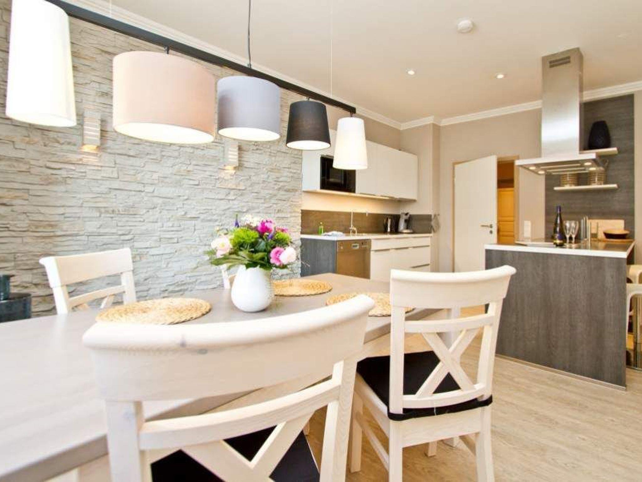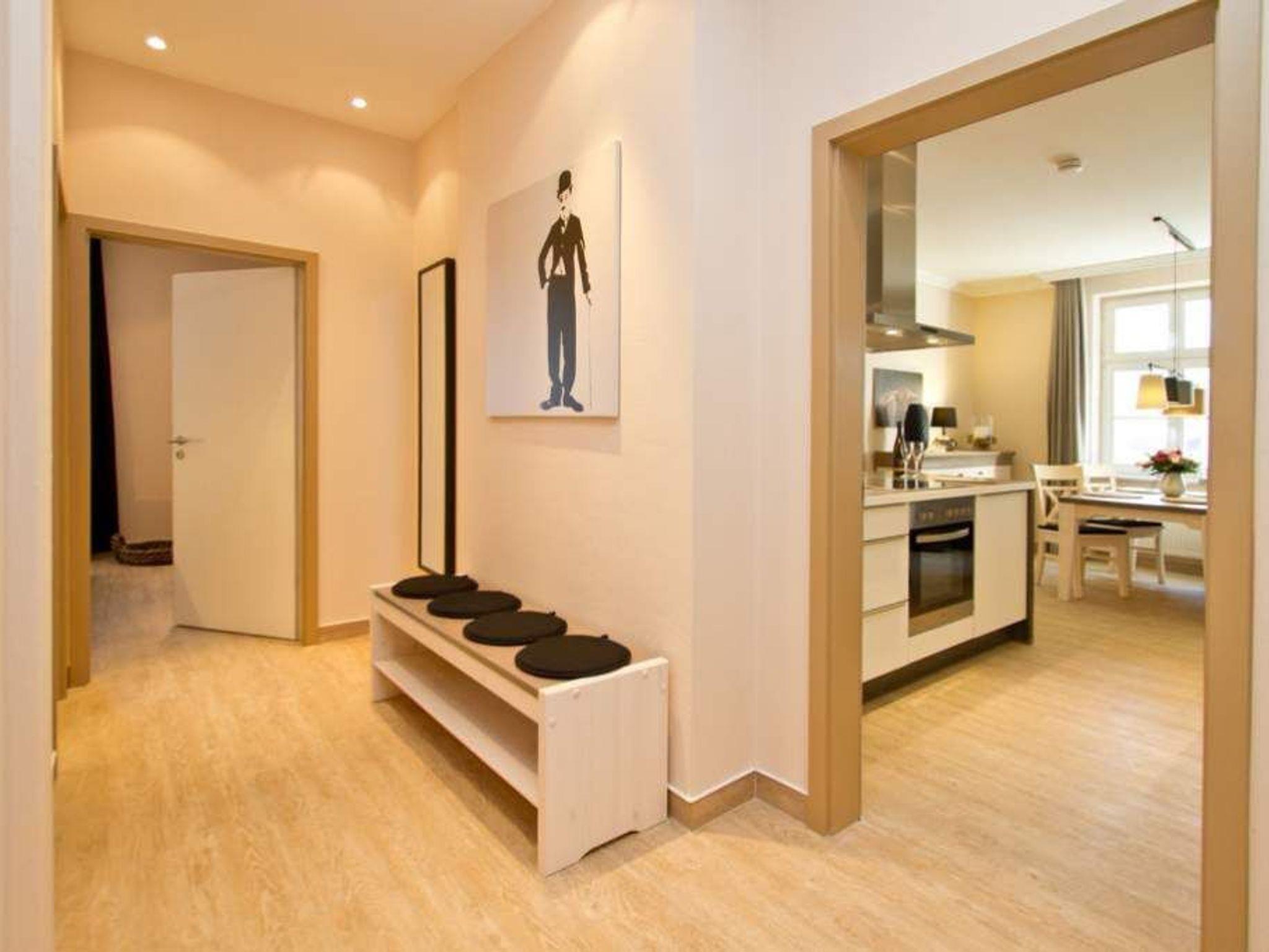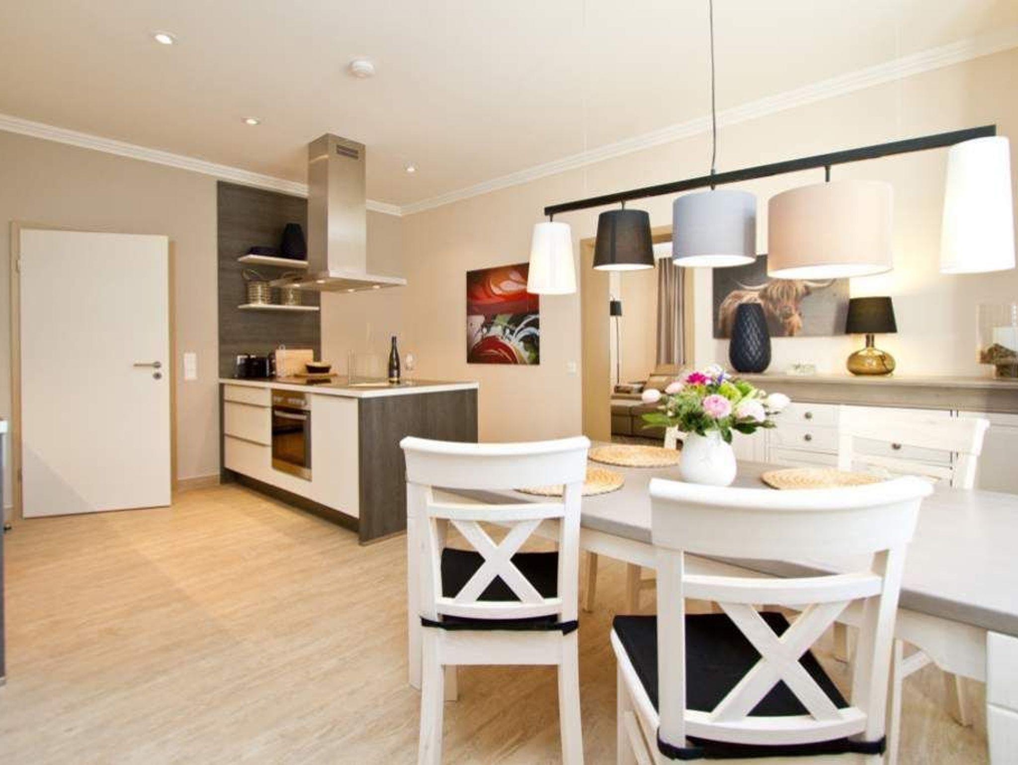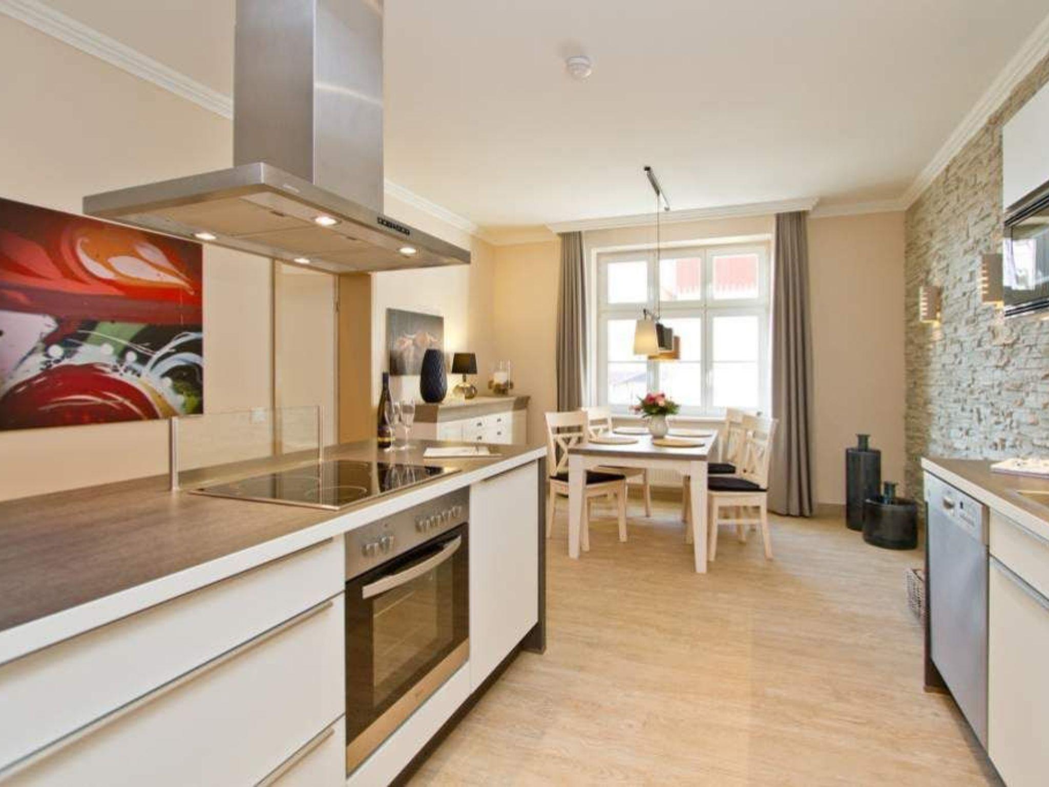Gekonnt, modern, stylisch - die neu gestaltete 2-Raum-Ferienwohnung im Hochparterre (64 qm für 2 Erwachsene und 1 Kleinkind bis 3 Jahre) wird Sie sicher begeistern. Die hochwertige neue Einrichtung lässt keine Urlaubswünsche offen. Ein großzügiges Wohnzimmer mit Ledersitzgruppe und Flat-TV, eine separate Küche mit schönem Essplatz und das Schlafzimmer mit Doppelboxspringbett (1,80m x 2,00 m) und Flat-TV werden durch ein Bad mit Dusche und WC ergänzt. Pkw-Stellplatz Nr. 25 (nur für PKW - kein Kombi!) in der Doppelparker Garage oben (max. PKW-Höhe 1,50 m, PKW Länge max. 5,00m/ Gewicht max. 2t). Auf Wunsch stellen wir für unsere kleinen Gäste ein Kinderreisebett (ohne zusätzliche Matratze [&] Bettzeug) und einen Kinderhochstuhl ( gegen einen Aufpreis) zur Verfügung. Für Ihren Komfort sind die Betten bei der Anreise bezogen und Handtücher liegen bereit.
