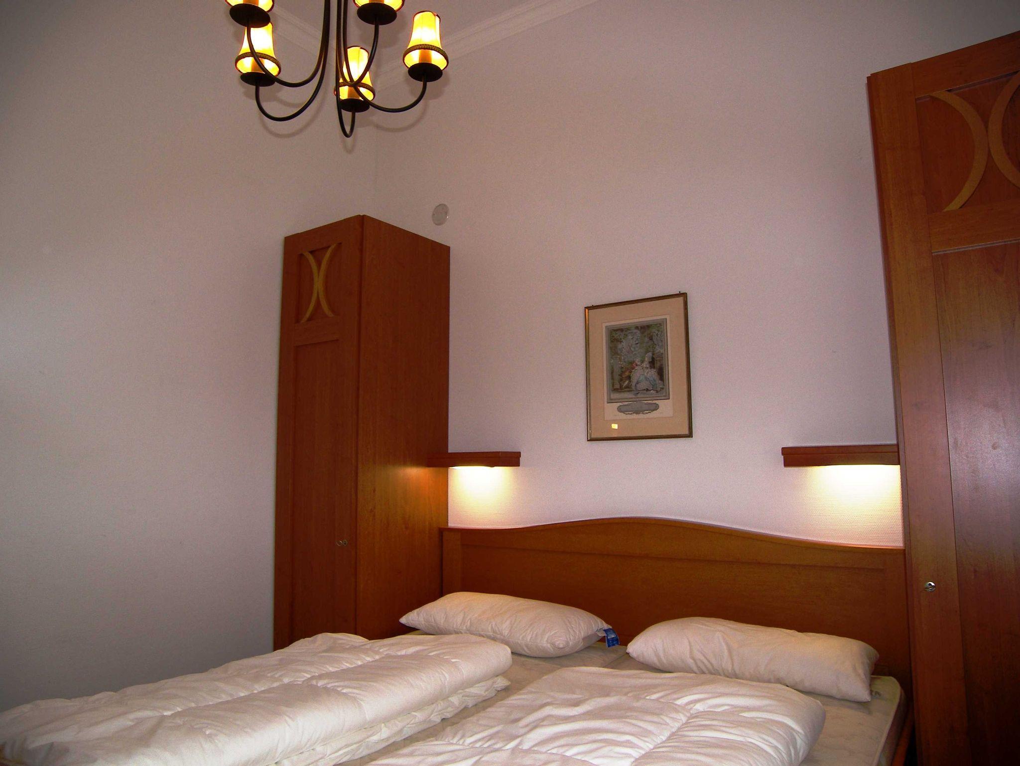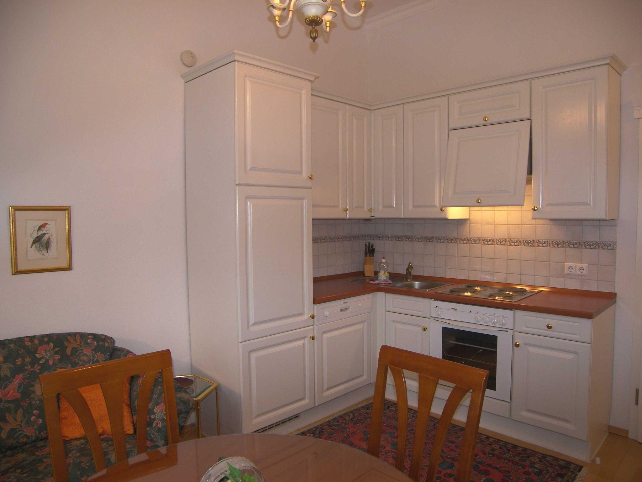 Die Wohnung ist exklusiv mit Stilmöbeln in Kirschbaum, hochwertigem Bucheparkett, Stuckdecken und Kassettentüren eingerichtet. Der stillvolle Wohn-Essbereich ist mit einer Couch, Esstisch sowie Flachbild-TV und DVD-Player sowie einer Stereo-Anlage eingericht. Die offene Einbauküche ist mit Backofen, Spülmaschine, Kühlschrank mit Gefrierfach, Kaffeemaschine, Wasserkocher und Toaster ausgestattet. Das separate Schlafzimmer verfügt über ein Doppelbett. Im hochwertigen Bad mit Glasdusche müssen sie außerdem auf Haartrockner und Schminkspiegel nicht verzichten. Die Wohnung besitzt eine sonnige Terrasse mit entsprechenden Möbeln. W-LAN steht Ihnen kostenfrei zur Verfügung.