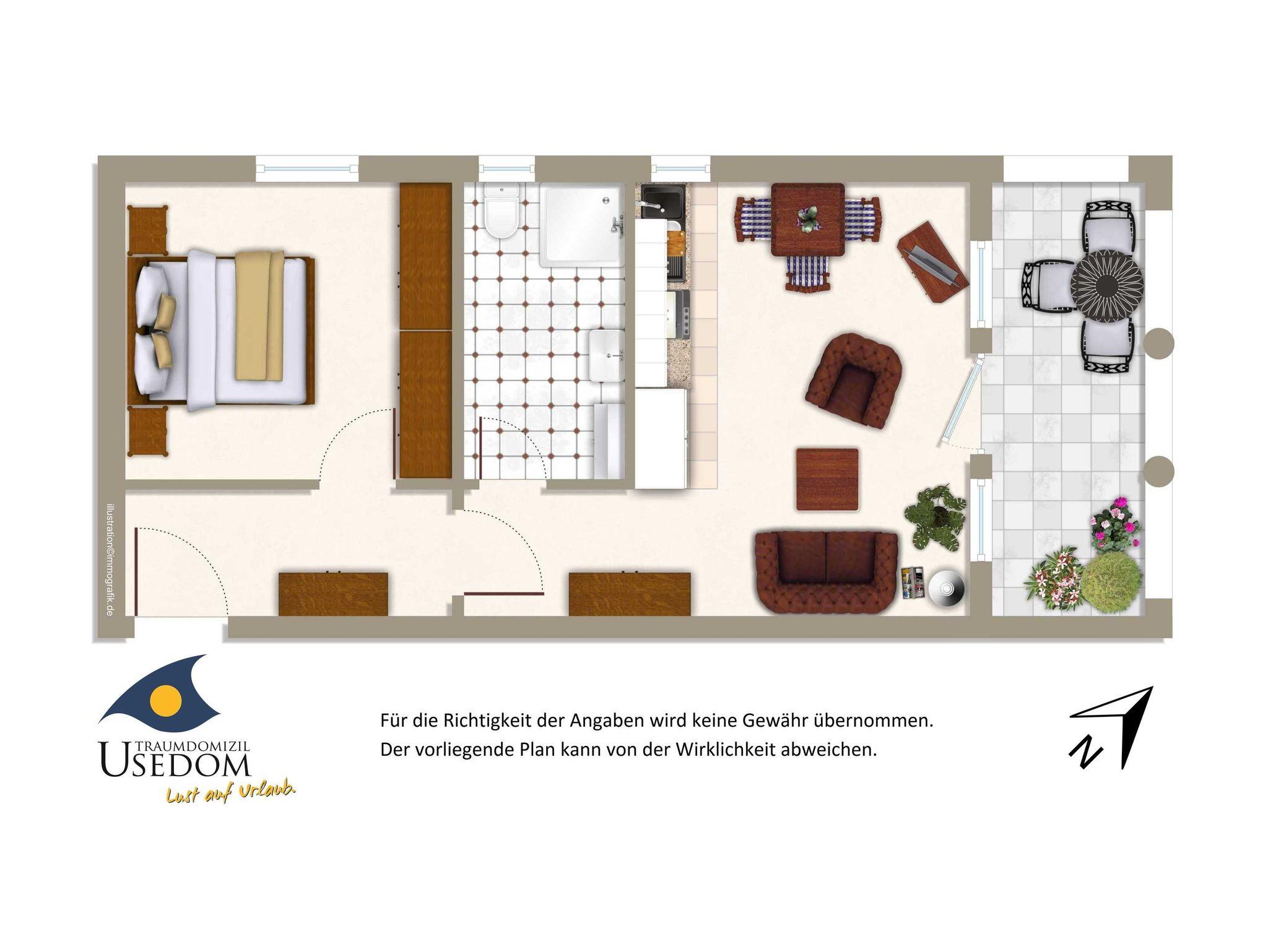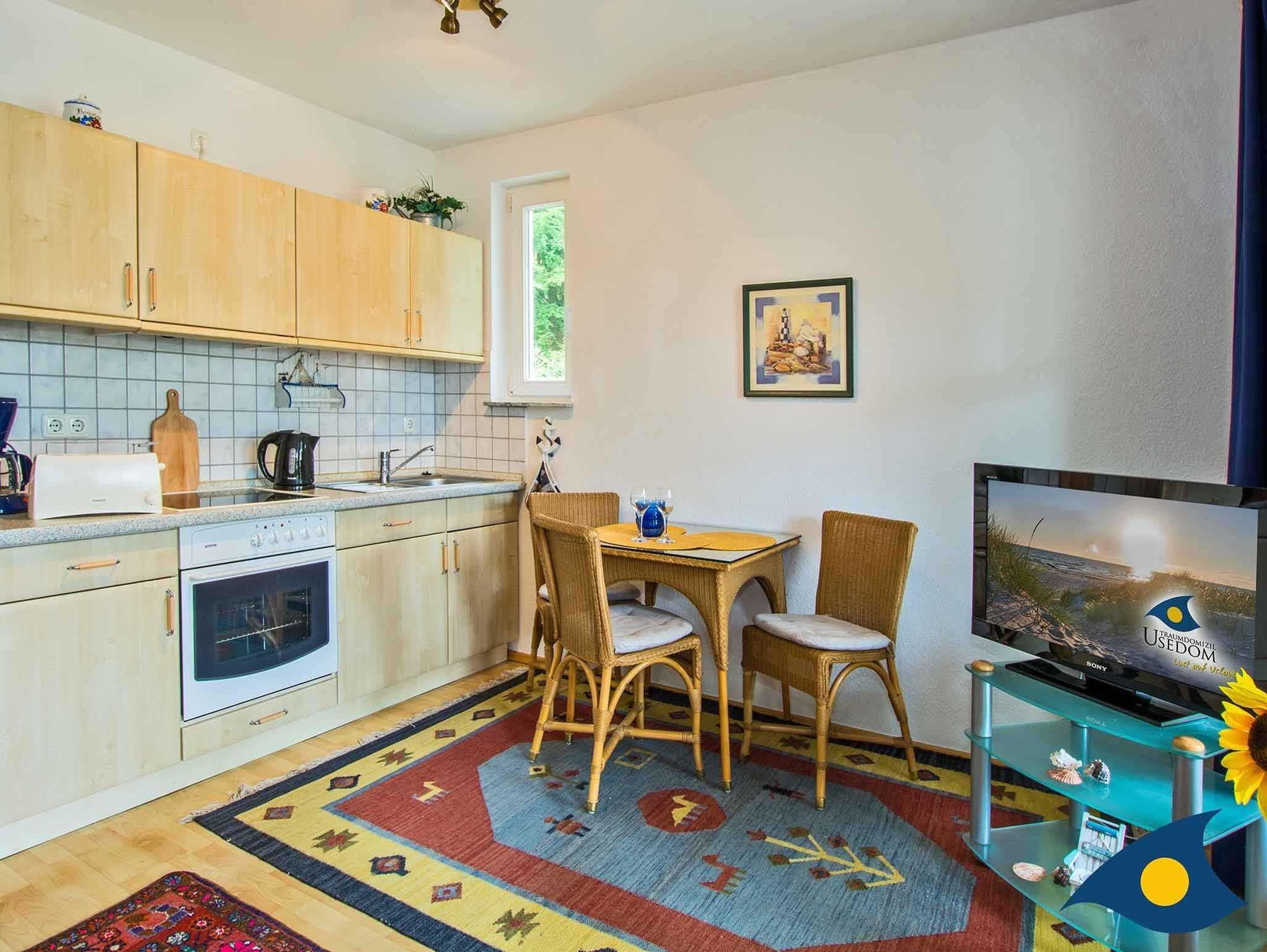 Zu diesem schönen Appartement gehören ein Wohnzimmer mit komfortabler Küchenzeile und separatem Esstisch, ein Schlafzimmer mit Doppelbett und ein Badezimmer mit Dusche.