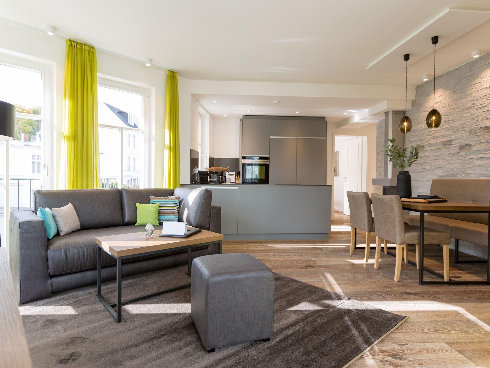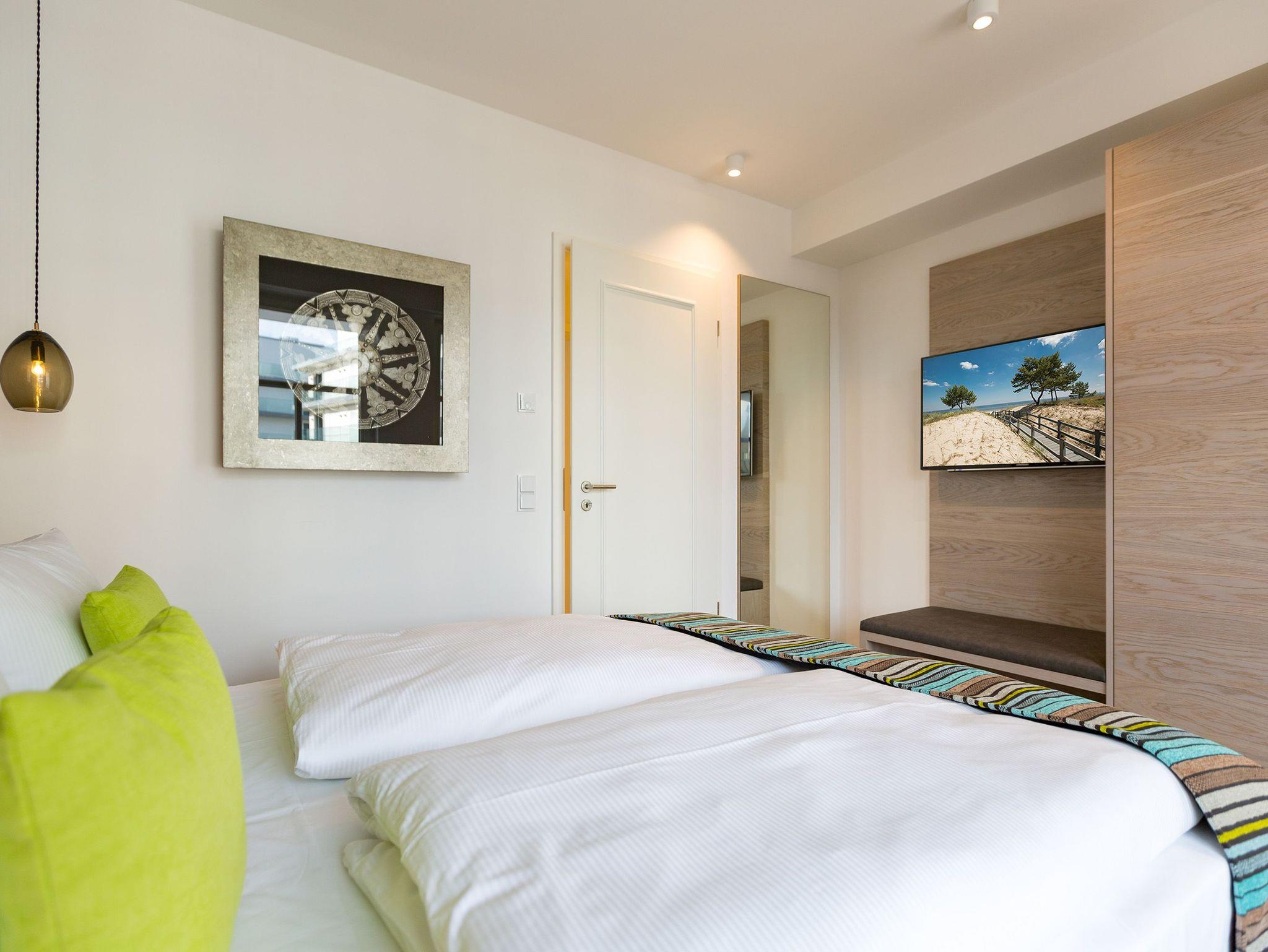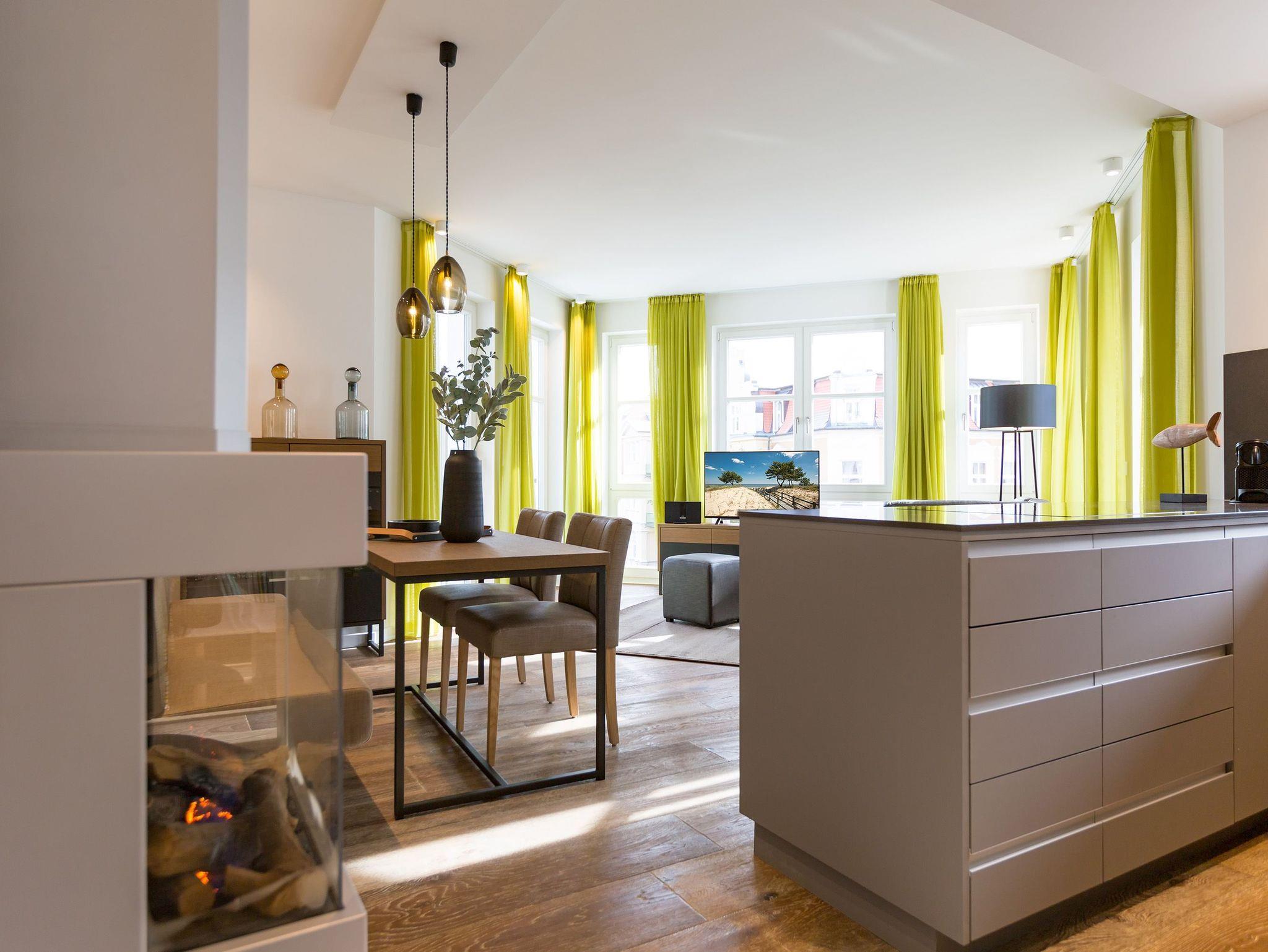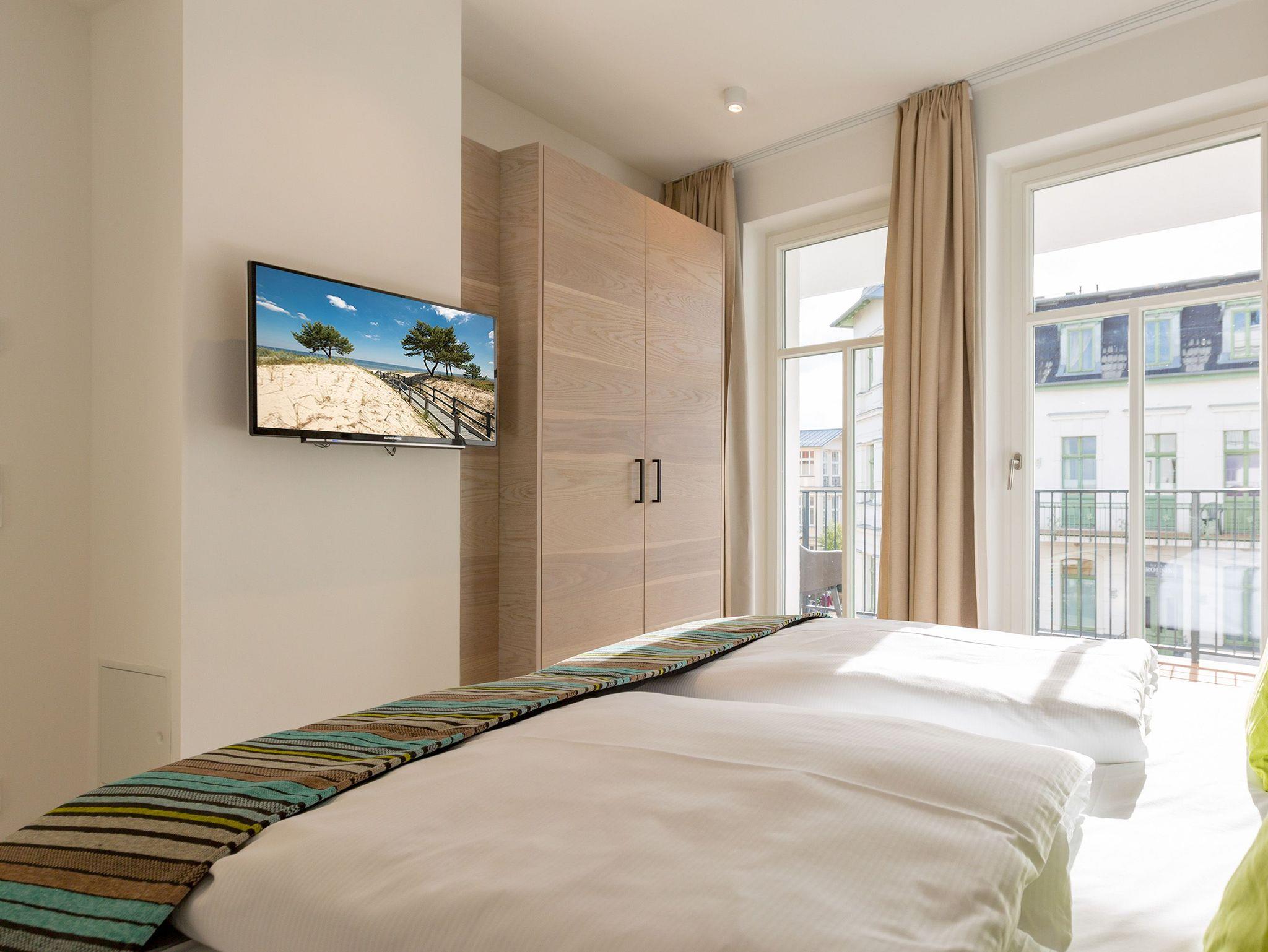 Frische, helle Farben empfangen die Ostseeauszeitler in diesem schönen und großzügigen Ferienappartement im 2. Stock des ganz neuen Beachhouses. Aus den 69 elegant eingerichteten Quadratmetern wollen die bis zu vier Personen und ein Kleinkind (bis drei Jahre im Kinderreisebett) am Ende garantiert gar nicht wieder ausziehen. Denn die Wirkung, die dieses Ferienparadies auf seine Gäste hat, ist absolut entspannend und erholsam. Mitten im Herzen des Kaiserbades und über allen anderen Urlaubern können Sie auf den beiden Balkonen ihres Appartements (8 und 9 Quadratmeter groß) jeglichen Stress vergessen und beim Blick über die Ostsee vom Süd-Ost-Balkon aus oder auf die wunderschönen alten Villen der Bergstraße vom Süd-West-Balkon aus neue Energie tanken. Und nicht vergessen: Die gesundheitsfördernde Meeresluft tief einatmen. Doch nicht nur auf den Balkonen lässt es sich wunderbar aushalten. Auch das geräumige Wohn-Esszimmer lädt zum ausgiebigen Faulenzen ein. Eine schöne Sofa-Sitz-Gruppe ist der beste Platz zum Fernsehgucken auf dem großen Flat-TV, zum Musik hören über die Bluetooth-Hi-Fi-Anlage oder einfach nur zum entspannten Schauen auf das Flammenspiel des Gas-Kamins. Den können Sie sogar per Knopfdruck ein und ausschalten. In der zum Wohnzimmer gehörenden, offenen Küche ist alles vorhanden, was Sie für Frühstück, Mittagessen oder Abendbrot brauchen können. Die Geräte wie Herd, Backofen, Kaffeemaschine oder Geschirrspüler sind allesamt hochwertige Markengeräte. Edles Design-Geschirr und Gläser finden Sie in den Küchenschränken und in der stylischen Vitrine. Hier steht auch ein gemütlicher Esstisch, an dem es Spaß macht, gemeinsam zu essen und zu erzählen. Vergnügen bereitet in dieser Wohnung aber nicht nur das Wohnzimmer, sondern eigentlich alles. Ganz besonders das Schlafen. Denn in den bequemen Boxspringdoppelbetten (einmal 1,60 m x 2,00 m und einmal 1,80 m x 2,00 m) in den beiden Schlafzimmern schläft es sich einfach himmlisch. Ein Flat-TV und ein Schrank gehören ebenfalls zur Ausstattung. Jedes Schlafzimmer hat zudem Zugang zu einem der Balkone. Wellness für alle Sinne ? so könnte man das Motto des Appartements beschreiben. Im Masterbad erwartet Sie nämlich eine Finnische Sauna, die Ihre Gesundheit mittels Schwitzen mächtig auf Trapp bringt. Apropos Bäder. Von denen gibt es in der Nummer 14 gleich zwei. Beide sind mit Regendusche, Waschtisch und WC ausgestattet. Handtücher liegen bei Anreise für Sie bereit und die Betten sind bezogen. In der Küche steht ein Wasch-Trockner zu Ihrer Verfügung. Das WLAN ist kostenfrei. In der modernen Tiefgarage ist für Sie der Stellplatz Nr. 14 im Doppelparker unten (max. Höhe 1,85 m, max. Länge 5,10 m, max. Breite 2,50 m, max. Last 2.600 kg) reserviert.