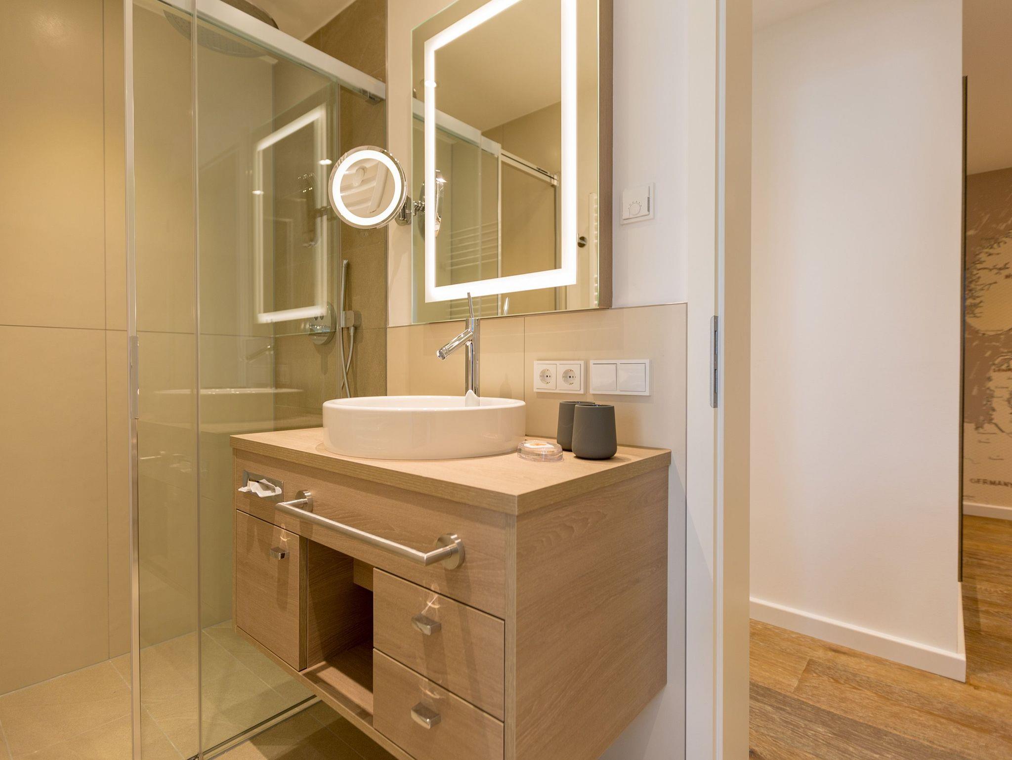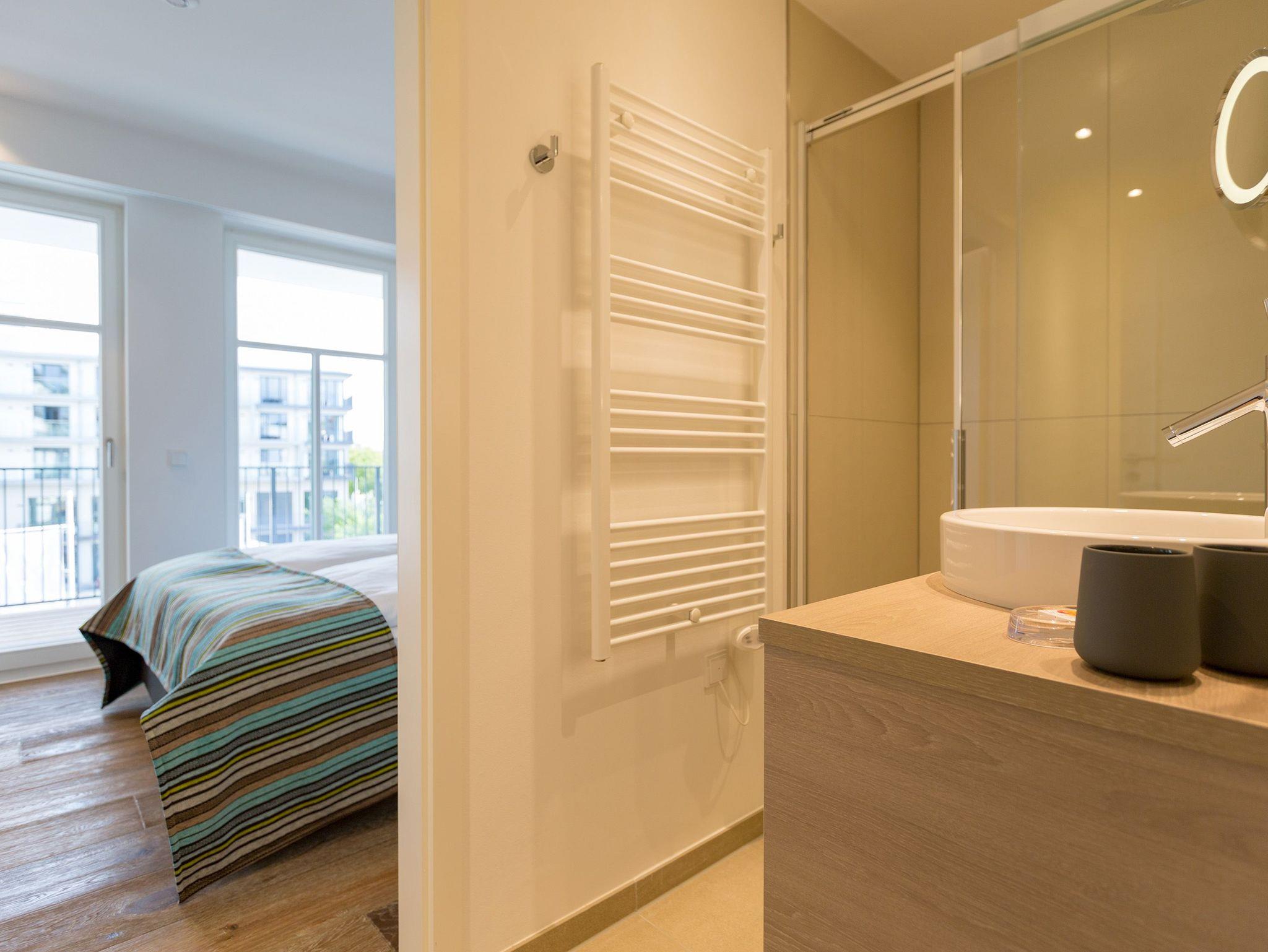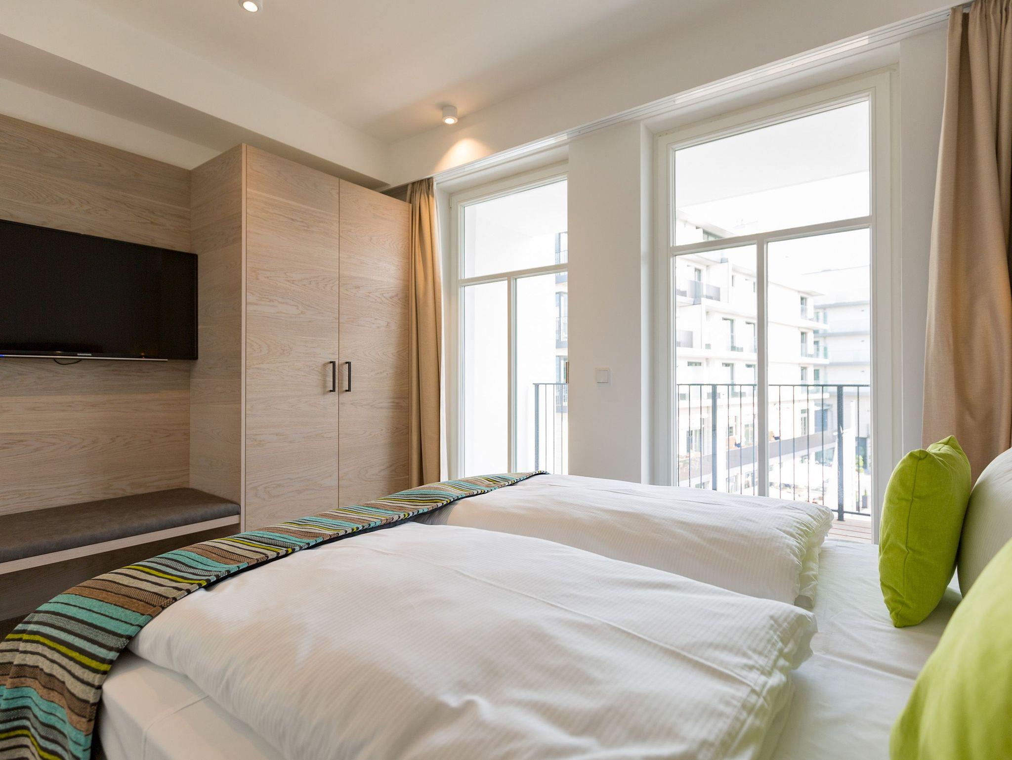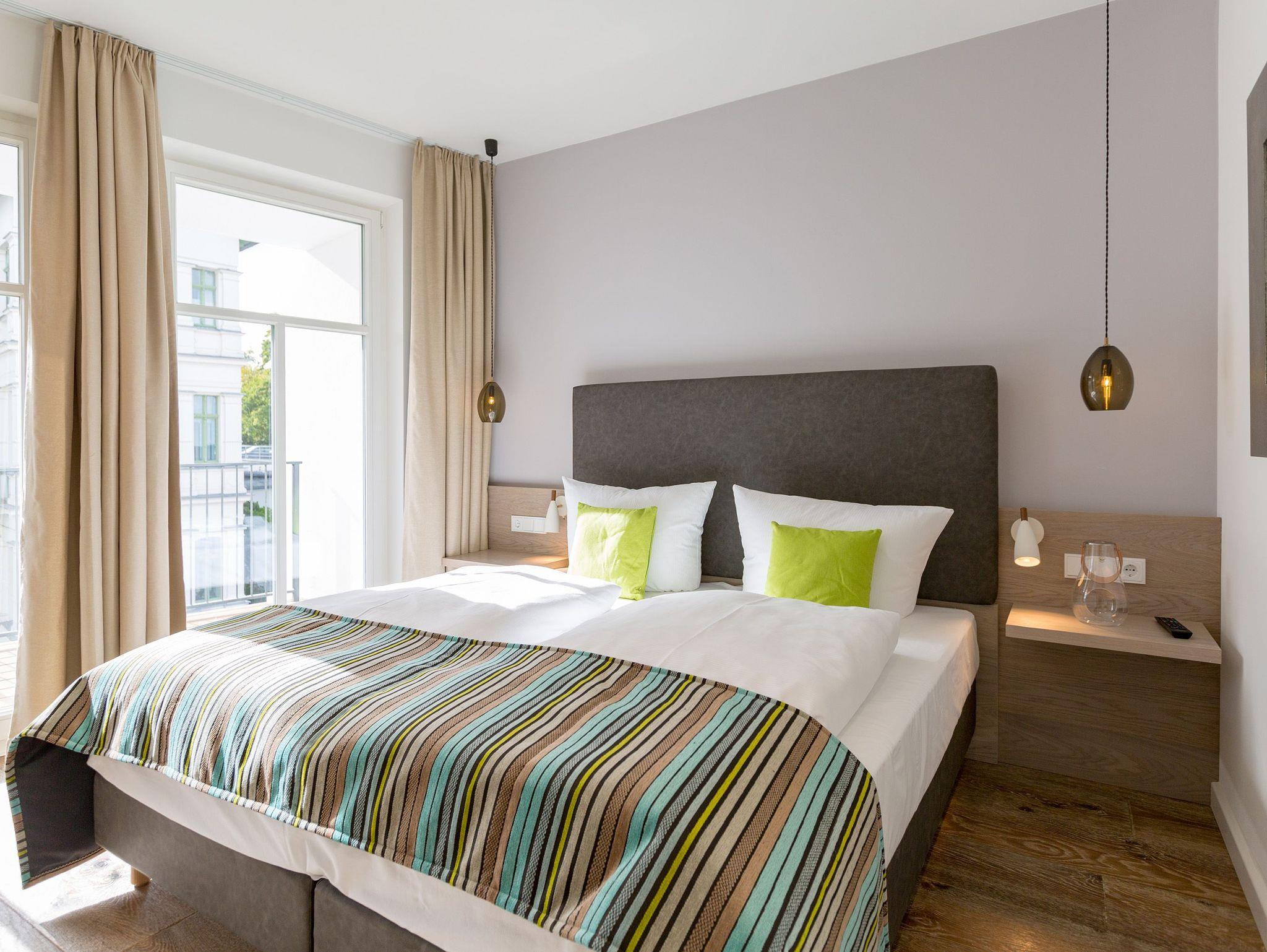 Frische, helle Farben empfangen die Ostseeauszeitler in diesem schönen und großzügigen Ferienappartement im 2. Stock des ganz neuen Beachhouses. Aus den 69 elegant eingerichteten Quadratmetern wollen die bis zu vier Personen und ein Kleinkind (bis drei Jahre im Kinderreisebett) am Ende garantiert gar nicht wieder ausziehen. Denn die Wirkung, die dieses Ferienparadies auf seine Gäste hat, ist absolut entspannend und erholsam. Mitten im Herzen des Kaiserbades und über allen anderen Urlaubern können Sie auf den beiden Balkonen ihres Appartements (8 und 9 Quadratmeter groß) jeglichen Stress vergessen und beim Blick über die Ostsee vom Süd-Ost-Balkon aus oder auf die wunderschönen alten Villen der Bergstraße vom Süd-West-Balkon aus neue Energie tanken. Und nicht vergessen: Die gesundheitsfördernde Meeresluft tief einatmen. Doch nicht nur auf den Balkonen lässt es sich wunderbar aushalten. Auch das geräumige Wohn-Esszimmer lädt zum ausgiebigen Faulenzen ein. Eine schöne Sofa-Sitz-Gruppe ist der beste Platz zum Fernsehgucken auf dem großen Flat-TV, zum Musik hören über die Bluetooth-Hi-Fi-Anlage oder einfach nur zum entspannten Schauen auf das Flammenspiel des Gas-Kamins. Den können Sie sogar per Knopfdruck ein und ausschalten. In der zum Wohnzimmer gehörenden, offenen Küche ist alles vorhanden, was Sie für Frühstück, Mittagessen oder Abendbrot brauchen können. Die Geräte wie Herd, Backofen, Kaffeemaschine oder Geschirrspüler sind allesamt hochwertige Markengeräte. Edles Design-Geschirr und Gläser finden Sie in den Küchenschränken und in der stylischen Vitrine. Hier steht auch ein gemütlicher Esstisch, an dem es Spaß macht, gemeinsam zu essen und zu erzählen. Vergnügen bereitet in dieser Wohnung aber nicht nur das Wohnzimmer, sondern eigentlich alles. Ganz besonders das Schlafen. Denn in den bequemen Boxspringdoppelbetten (einmal 1,60 m x 2,00 m und einmal 1,80 m x 2,00 m) in den beiden Schlafzimmern schläft es sich einfach himmlisch. Ein Flat-TV und ein Schrank gehören ebenfalls zur Ausstattung. Jedes Schlafzimmer hat zudem Zugang zu einem der Balkone. Wellness für alle Sinne ? so könnte man das Motto des Appartements beschreiben. Im Masterbad erwartet Sie nämlich eine Finnische Sauna, die Ihre Gesundheit mittels Schwitzen mächtig auf Trapp bringt. Apropos Bäder. Von denen gibt es in der Nummer 14 gleich zwei. Beide sind mit Regendusche, Waschtisch und WC ausgestattet. Handtücher liegen bei Anreise für Sie bereit und die Betten sind bezogen. In der Küche steht ein Wasch-Trockner zu Ihrer Verfügung. Das WLAN ist kostenfrei. In der modernen Tiefgarage ist für Sie der Stellplatz Nr. 14 im Doppelparker unten (max. Höhe 1,85 m, max. Länge 5,10 m, max. Breite 2,50 m, max. Last 2.600 kg) reserviert.