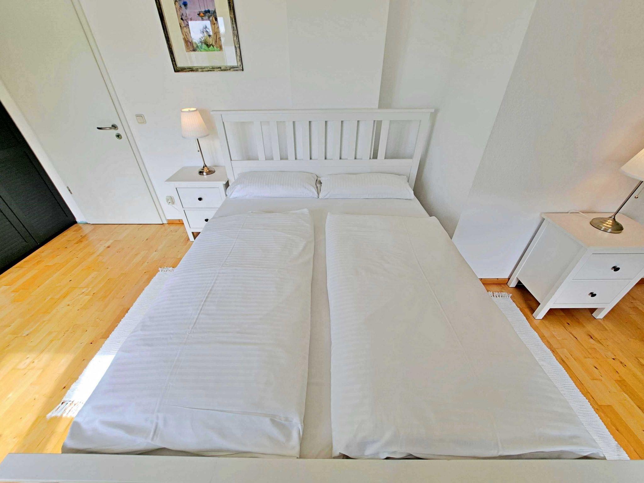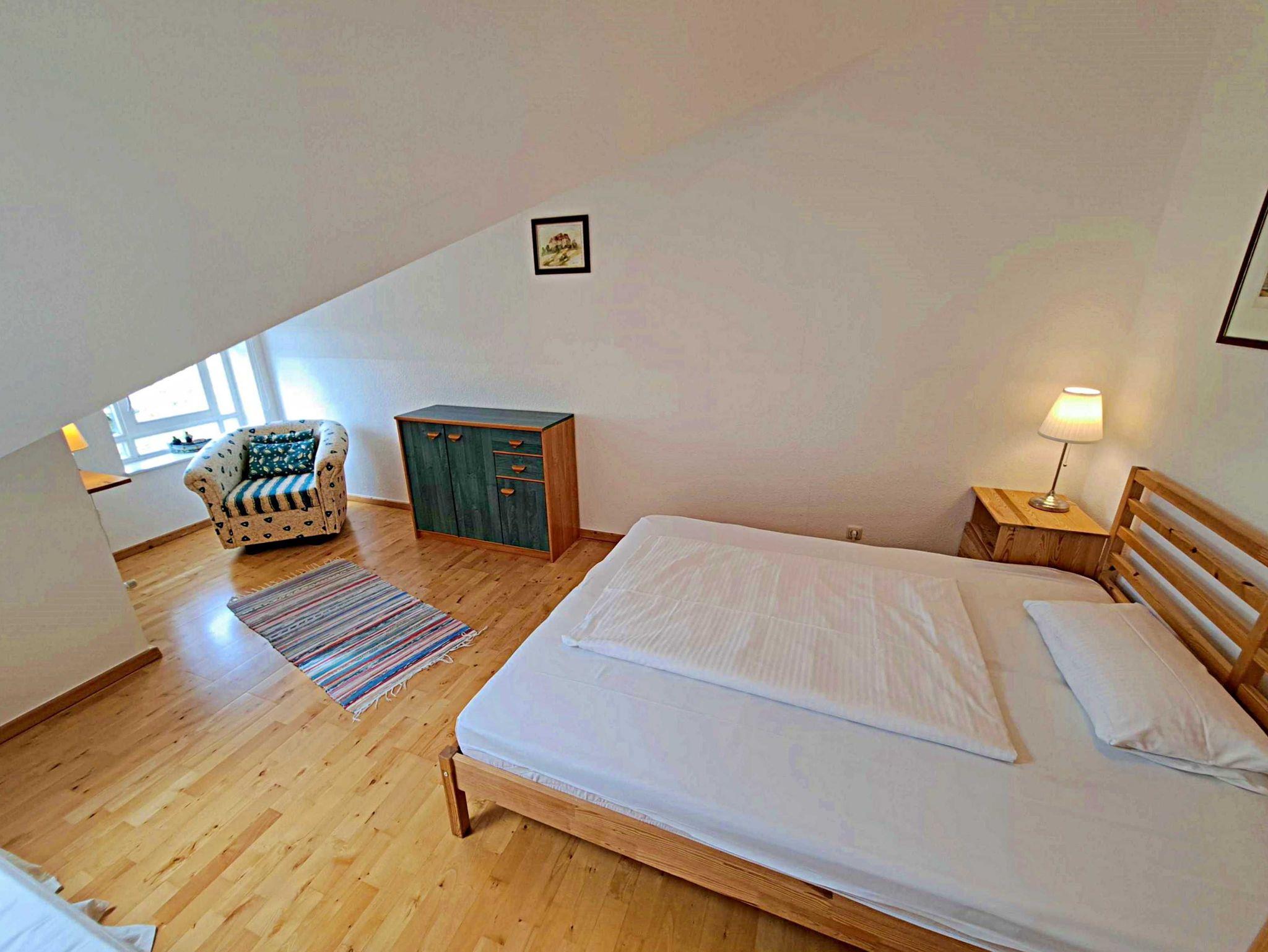 Der separate Eingang führt Sie ins 1. Obergeschoss, wo Sie ein einladendes Wohnzimmer mit einer gemütlichen Couch und einem Flat-TV erwartet. Genießen Sie den Blick auf den idyllischen Schloonsee von Ihrem eigenen Balkon aus. Die voll ausgestattete Küche lässt keine Wünsche offen - hier finden Sie einen Elektroherd, Backofen, Geschirrspüler, Kühlschrank, Mikrowelle, Wasserkocher, Toaster und Kaffeemaschine. Das separate Esszimmer bietet reichlich Platz zum Sitzen und Verweilen und ein Gäste-WC sorgt für zusätzlichen Komfort. Über eine Treppe gelangen Sie in das zweite Obergeschoss, wo sich zwei Schlafzimmer befinden. Das eine Schlafzimmer ist mit einem Doppelbett ausgestattet, während das andere sowohl ein Doppel- als auch ein Einzelbett bietet. Das innenliegende Badezimmer verfügt über eine Badewanne mit Duschfunktion und WC. Abgerundet wird die Wohnung durch eine kleine Galerie, die perfekt als Lese-Ecke genutzt werden kann.