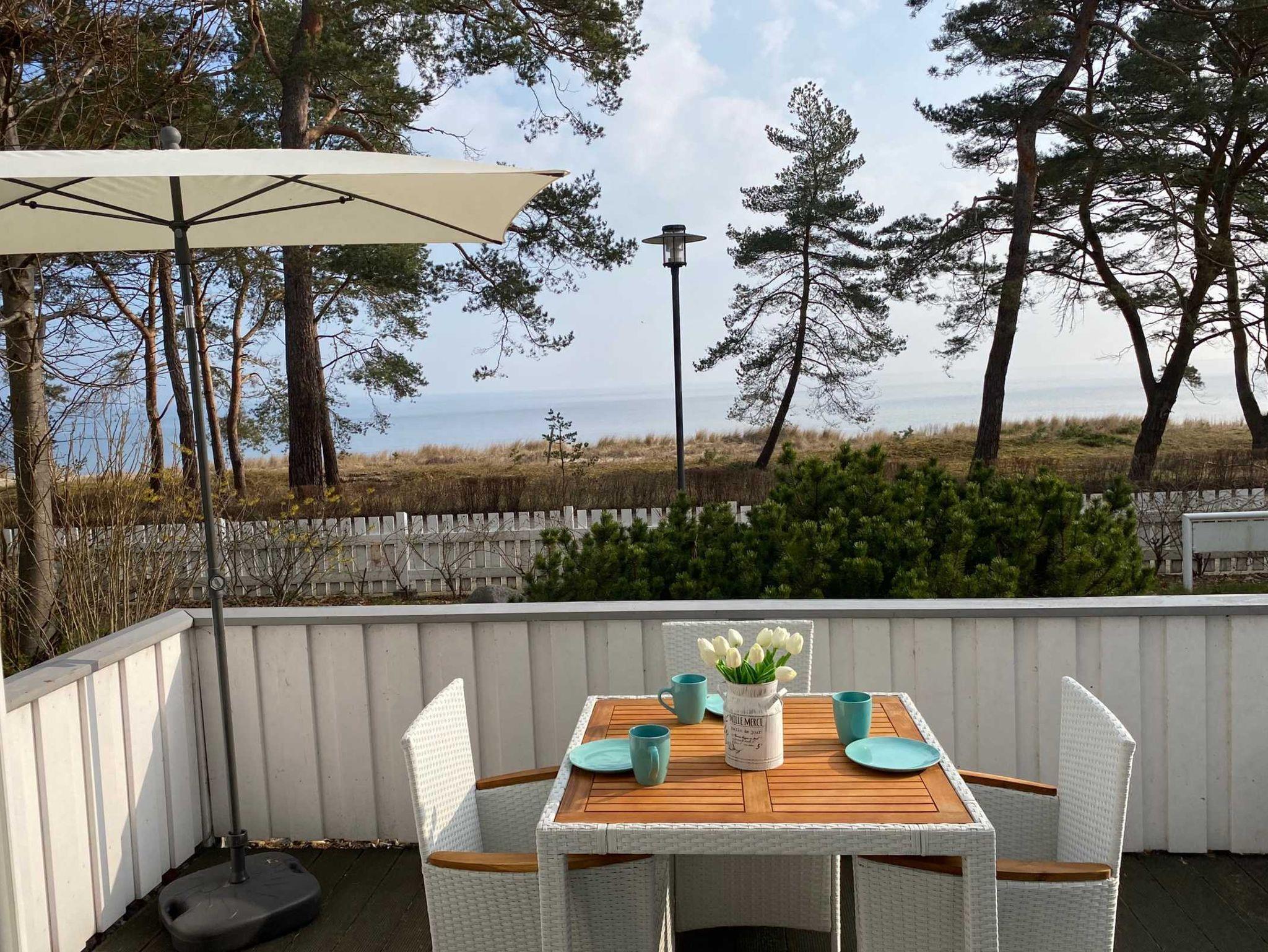 Von der Terrasse aus haben Sie auch einen wunderschönen Blick auf die beiden Seebrücken von Heringsdorf und Bansin, spektakuläre Sonnenaufgänge inclusive. Wenn Sie die beiden Flügelfenster der Terrasse öffnen, verbinden sich Essbereich und Terrasse zu einer Einheit.