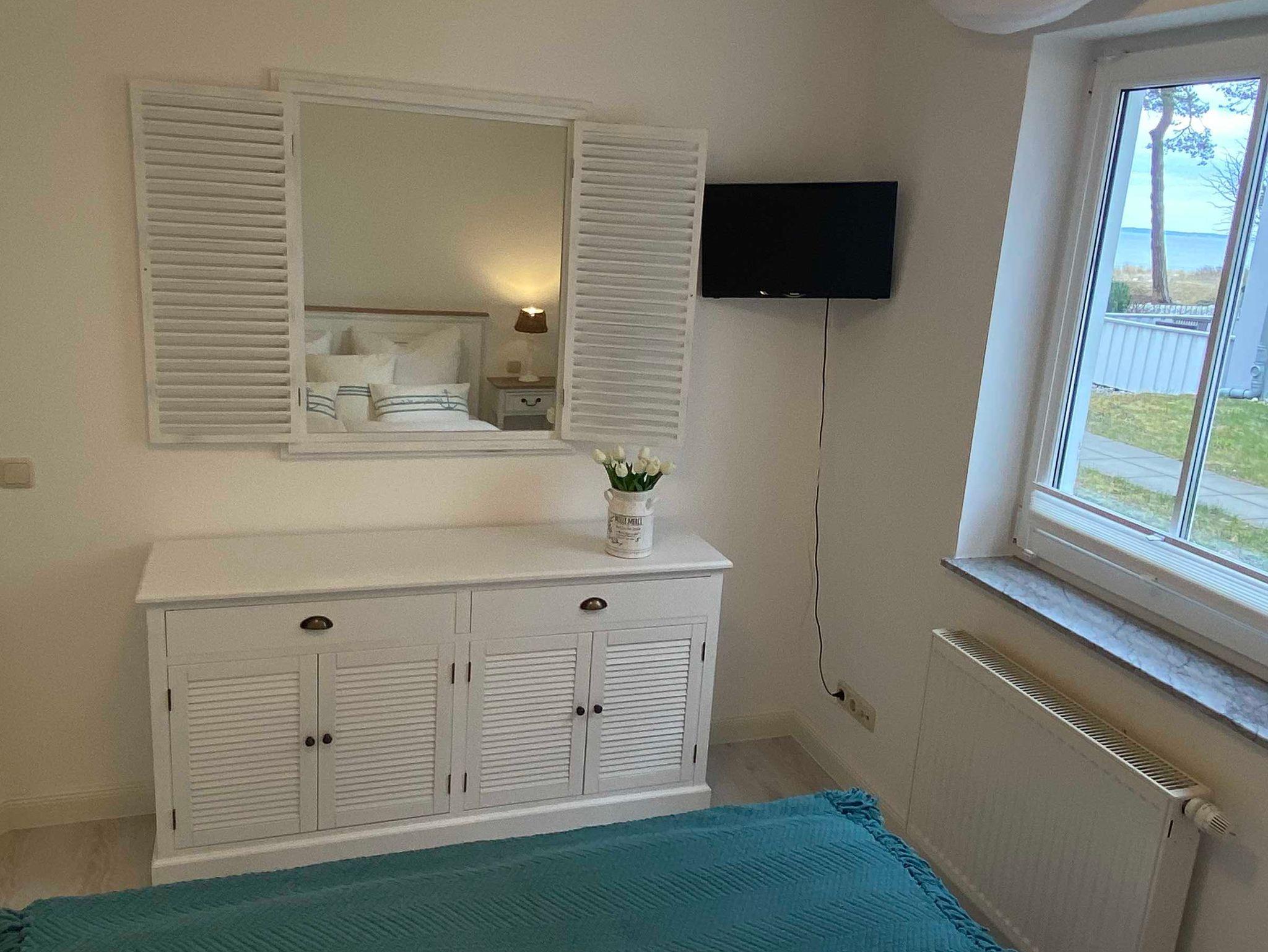 Das zweckmässig eingerichtete Schlafzimmer ist mit einem gemütlichen Doppelbett (200 L x 160 B cm), einem Kleiderschrank, einer Kommode, einem Spiegel, 2 Nachtschränken und einem Fernseher ausgestattet.