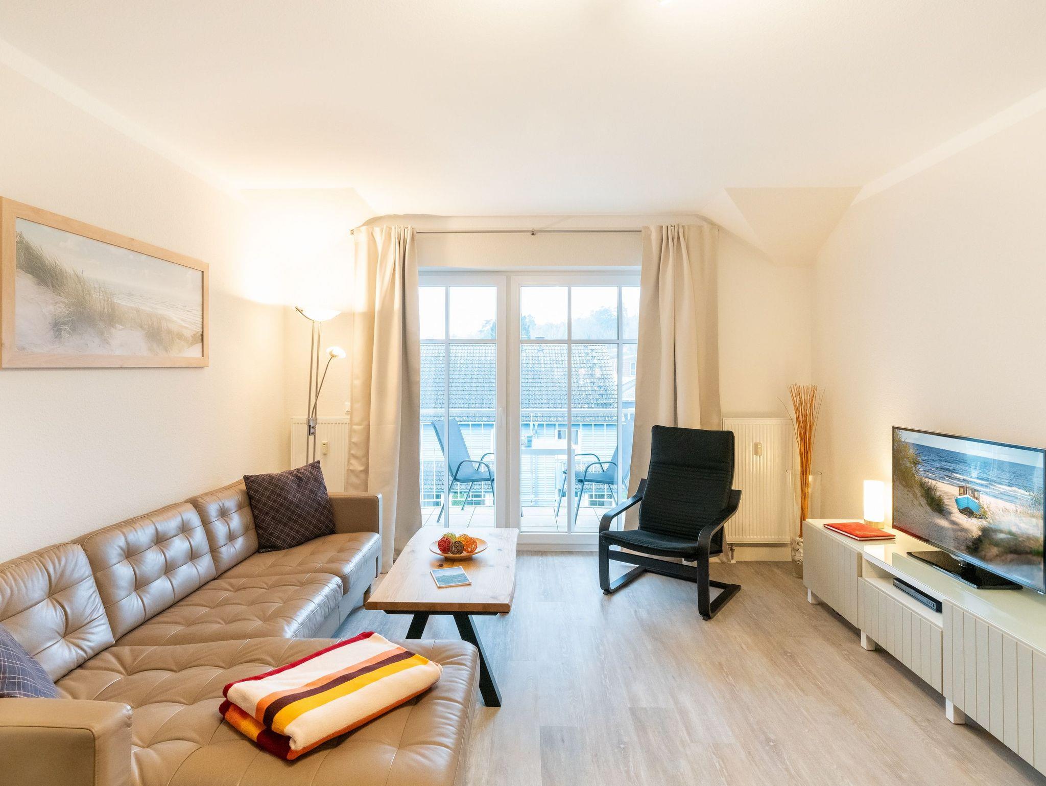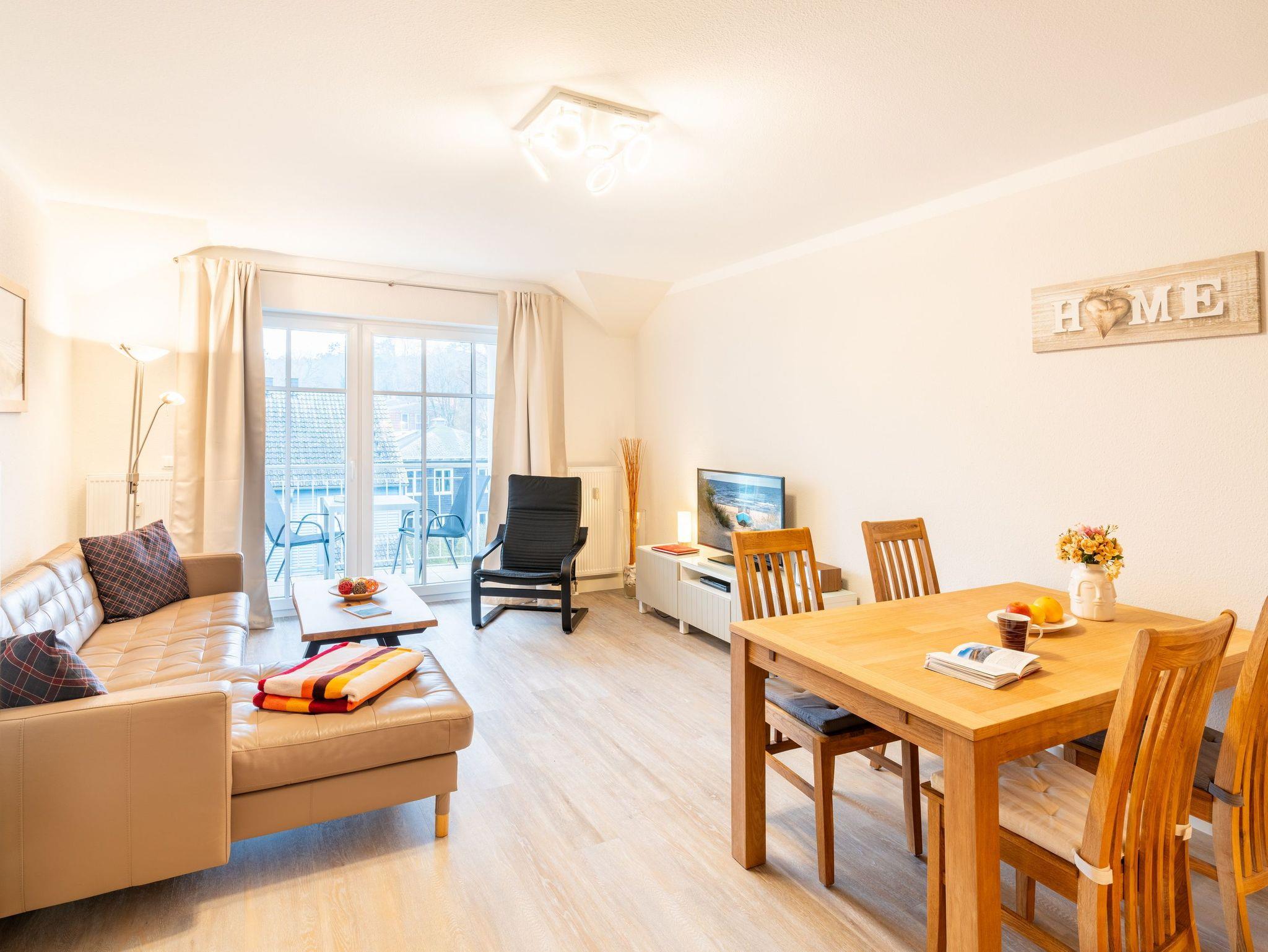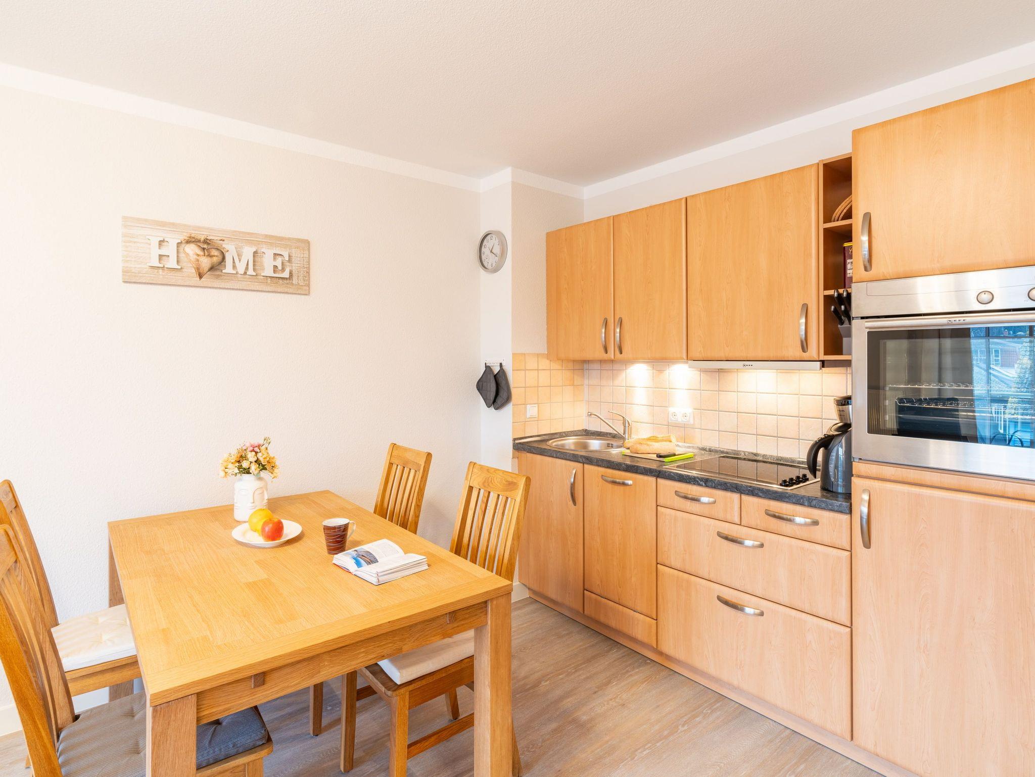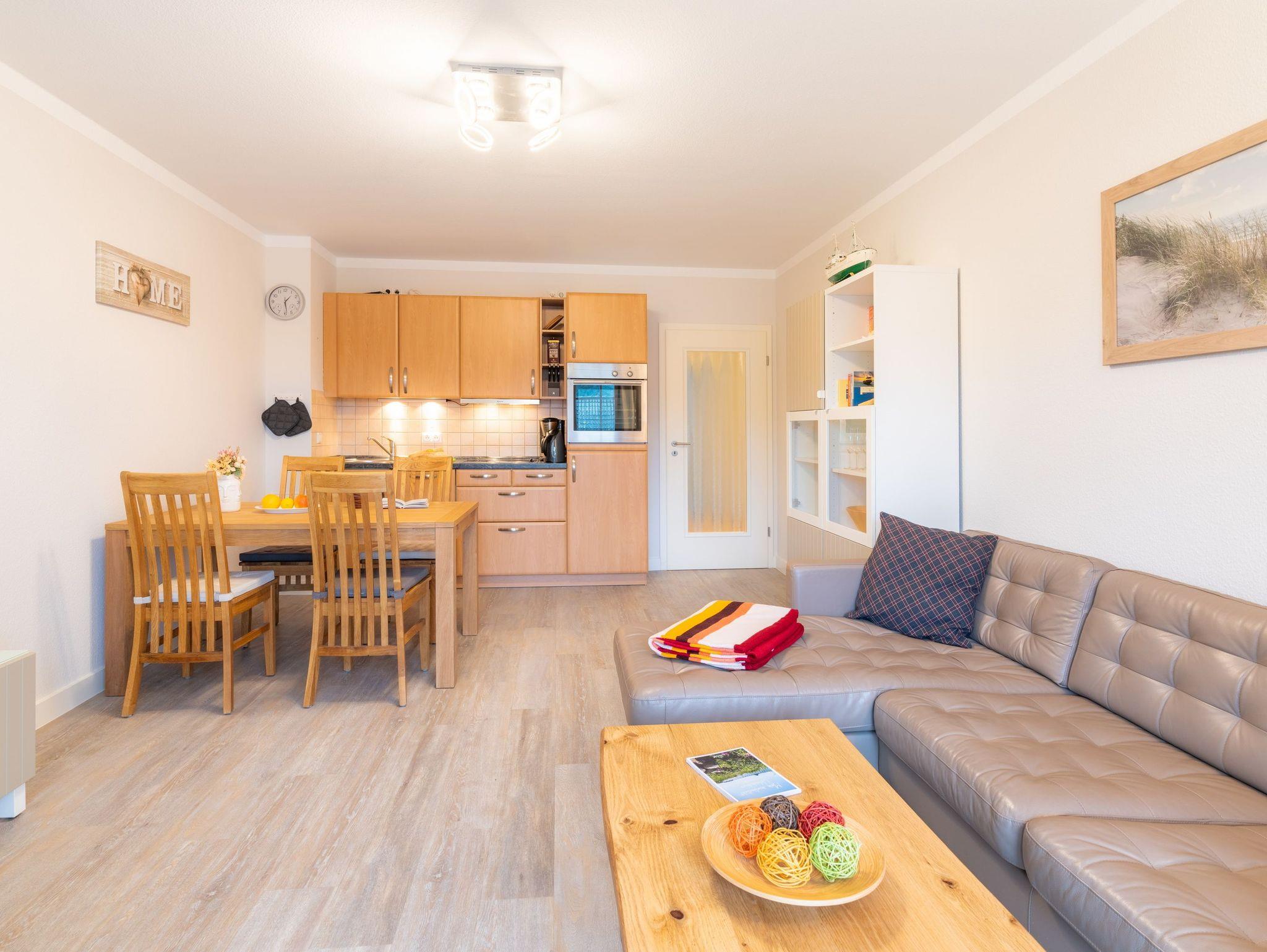 In dem 3-Raum-Appartement im Dachgeschoss können bis zu 4 Personen auf 62 Quadratmetern ihre erholsame Urlaubszeit gemeinsam verbringen. Der gemütliche Wohn-, Koch- und Essbereich ist in warmen Tönen gehalten. Die integrierte Küchenzeile bietet dank Geschirrspüler, Kühlschrank mit Gefrierfach, Backofen, Mikrowelle, Wasserkocher, Toaster, Kaffeemaschine und vielen Extras jeglichen Kochkomfort. Ein bequemes Sofa, ein Sessel, Flat TV sowie ein Esstisch für vier Personen laden zum Entspannen und geselligem Beisammensein ein.