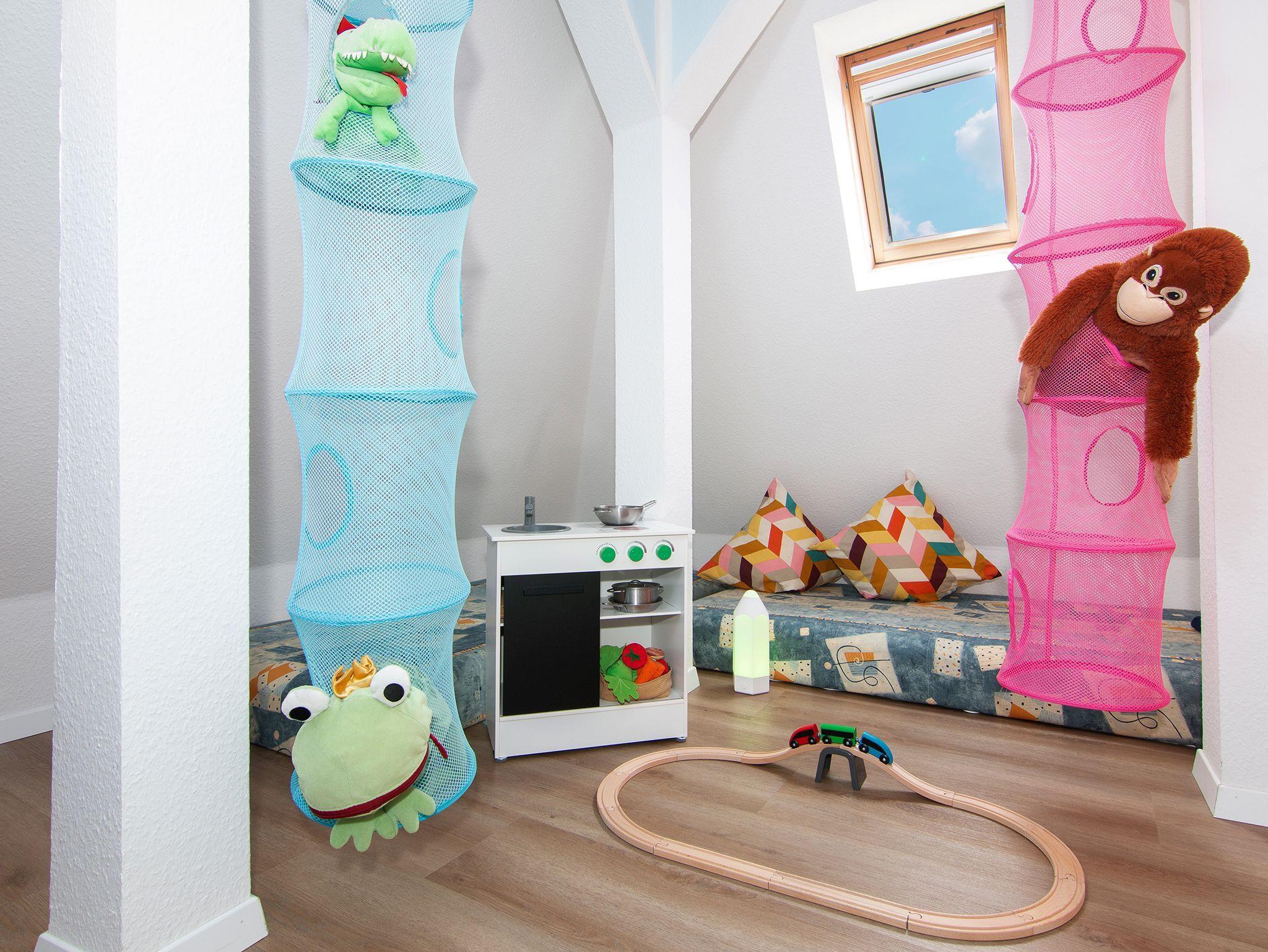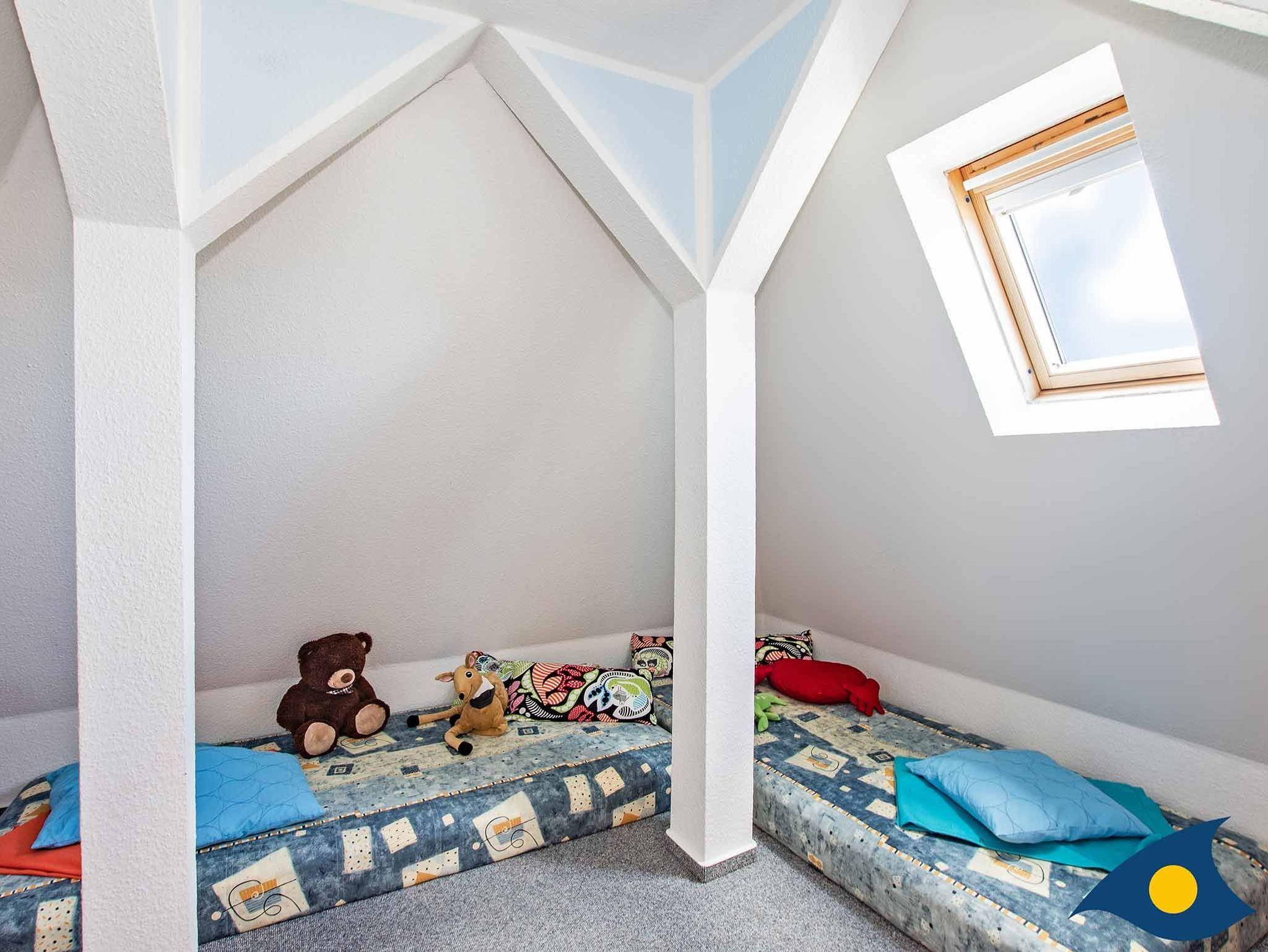 Als Besonderheit verfügt die Ferienwohnung über ein Turmzimmer, welches sich offen an das Schlafzimmer mit Doppelbett anschließt und ideal als Kinderschlafzimmer genutzt werden kann. Hier kann sich Ihr Kind sein eigenes Reich schaffen und ist trotzdem nicht weit weg. Damit Sie nicht zu früh von der Sonne wachgeküsst werden, sind alle Schlafräume sind mit Verdunklungsrollos und Markiesen für den Sonnenschutz ausgestattet.