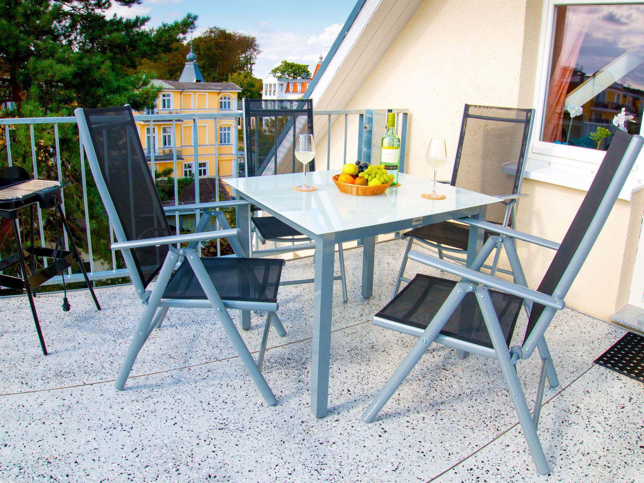 Die Ferienwohnung kann mit vier Erwachsenen und einem Kind belegt werden. 2 Gäste schlafen auf dem bequemen Schlafsofa im Wohnzimmer und für Ihr Kind wird das Turmzimmer aufgebettet. Kinderbett und -stuhl stehen für Sie bereit.