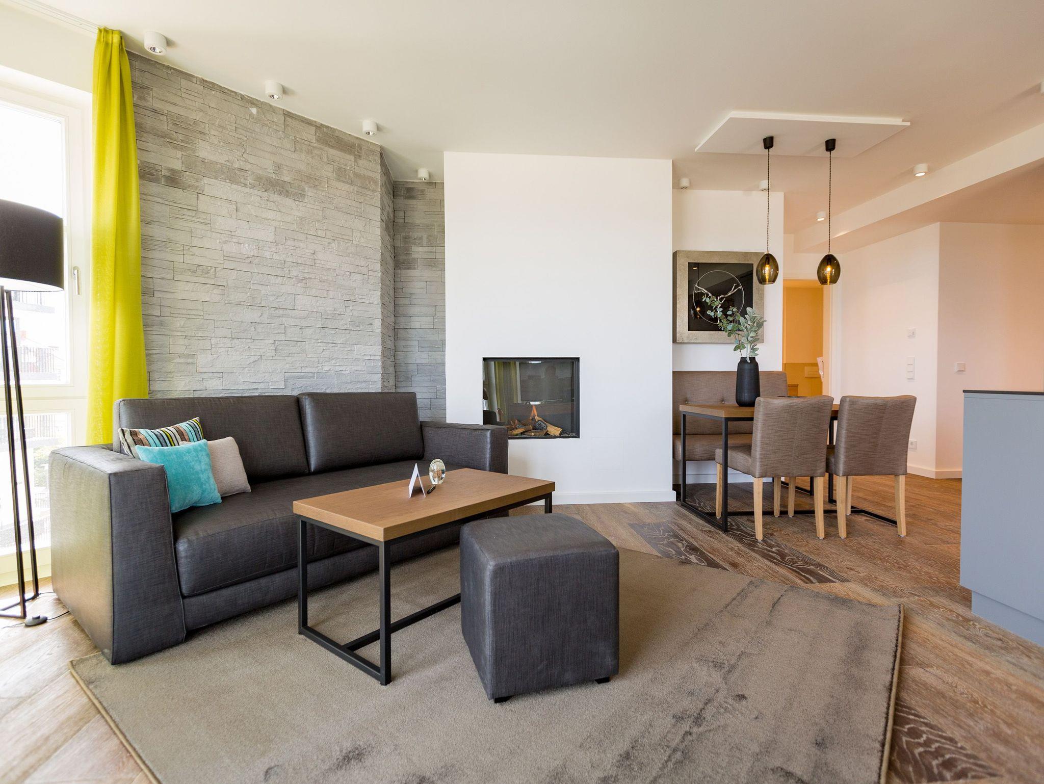 Leiden Sie auch an Meersehnsucht? In diesem Urlaubsparadies im 2. Stock des Beachhouses können Sie auf 74 Quadratmetern mit bis zu vier Personen und einem Kleinkind (bis drei Jahre im Kinderreisebett) Ihre Liebe zur Ostsee mit direktem Blick auf das endlose Blau genießen. Näher dran ist nur noch am Strand. Ob im wunderschön eingerichteten Wohnzimmer oder einem der beiden Schlafzimmer das Meer legt sich Ihnen in allen drei Zimmern zu Füßen. Von den beiden Balkonen (8 und 6 Quadratmeter) können Sie es schon morgens zum Frühstück genießen. Dann glitzert die Sonne auf den Wellen als lägen tausend Diamanten auf dem Wasser. In der offenen Wohnküche finden Sie alles, was Sie zum Zubereiten eines ausgiebigen Frühstückes, aber auch zum Kochen, Braten oder Backen brauchen. Hochwertige Markengeräte wie Geschirrspüler, Backofen, eine Kochinsel, Kühlschrank oder Mikrowelle erleichtern Ihnen das Zubereiten ungemein. Edles Geschirr sorgt für einen noblen Rahmen. Ist das Wetter einmal nicht zum Draußenessen geeignet, lädt der schöne Esstisch zum Einnehmen der Mahlzeiten ein. Das Wohn-Esszimmer strahlt durch seine großen Fenster, die viel Licht einlassen, die angenehmen und wohl temperierten Farbakzente und die exklusiven Design-Möbel eine harmonisierende und entspannende Atmosphäre aus. Auf dem bequemen Sofa lässt es sich wunderbar Relaxen. Für viel Gemütlichkeit sorgt ein Gas-Kamin. Zur Unterhaltung steht Ihnen ein großer Flat-TV sowie eine Hi-Fi-Anlage mit Bluetooth-Funktion zur Verfügung. Das WLAN ist in der Wohnung kostenfrei. Komfortable Boxspringdoppelbetten (1,80 m x 2,00 m und 1,60 m x 2,00 m) werden Ihren Träumen Flügel verleihen und die Urlaubsnächte zu einem echten Vergnügen machen. Ein jedes der beiden Schlafzimmer hat einen eigenen Balkon, einen Flat-TV und einen geräumigen Schrank. Das Appartement verfügt über zwei Bäder, in denen Sie jeweils eine schöne und ebenerdige Regendusche, einen Waschtisch mit großem Spiegel und ein WC vorfinden. Zu einer kleinen Wellness-Auszeit wird Ihr Ostseeurlaub außerdem. Denn im Masterbad erwartet Sie zudem eine Finnische Sauna. Da werden sogar die Schlechtwettertage an der Ostsee zu wunderbar entspannenden Kuscheltagen. Zum Waschen Ihrer Urlaubsgarderobe gibt es in einem separaten Hauswirtschaftsraum einen Wasch-Trockner. Kommen Sie also einfach an und genießen Sie Ihre Auszeit am Meer. Den Rest machen wir. Die Betten sind bei Ihrer Anreise bereits bezogen und Handtücher liegen bereit. In der modernen Tiefgarage ist für Sie der Stellplatz Nr. 11 im Doppelparker unten (max. Höhe 1,85 m, max. Länge 5,10 m, max. Breite 2,50 m, max. Last 2.600 kg) reserviert.