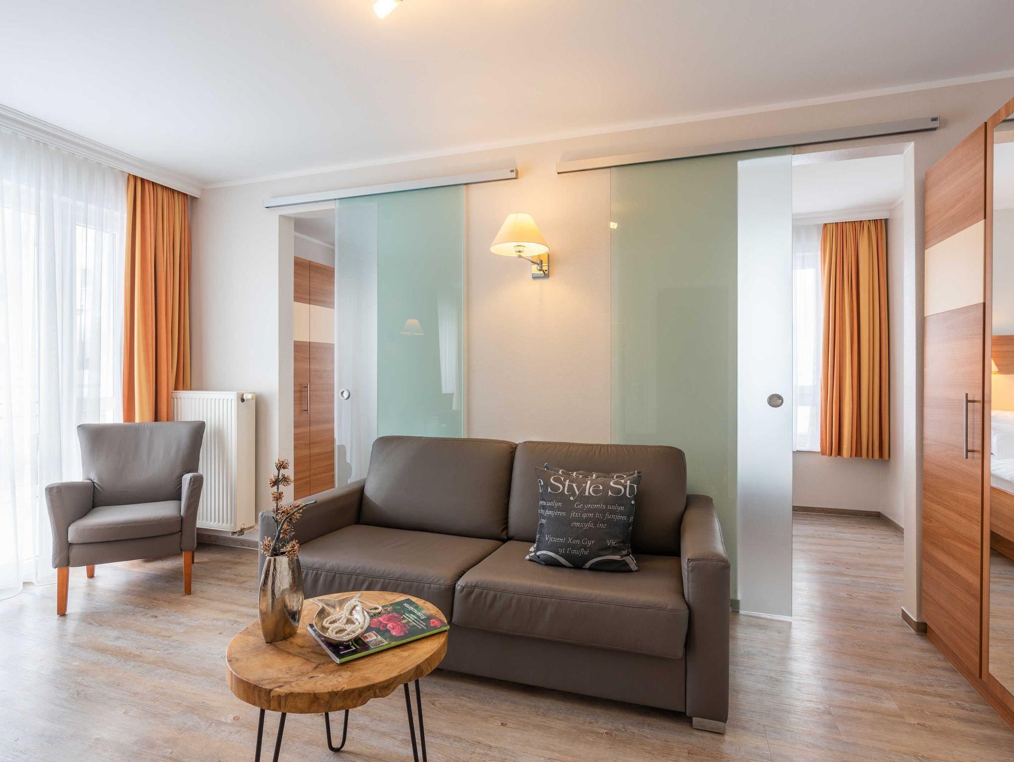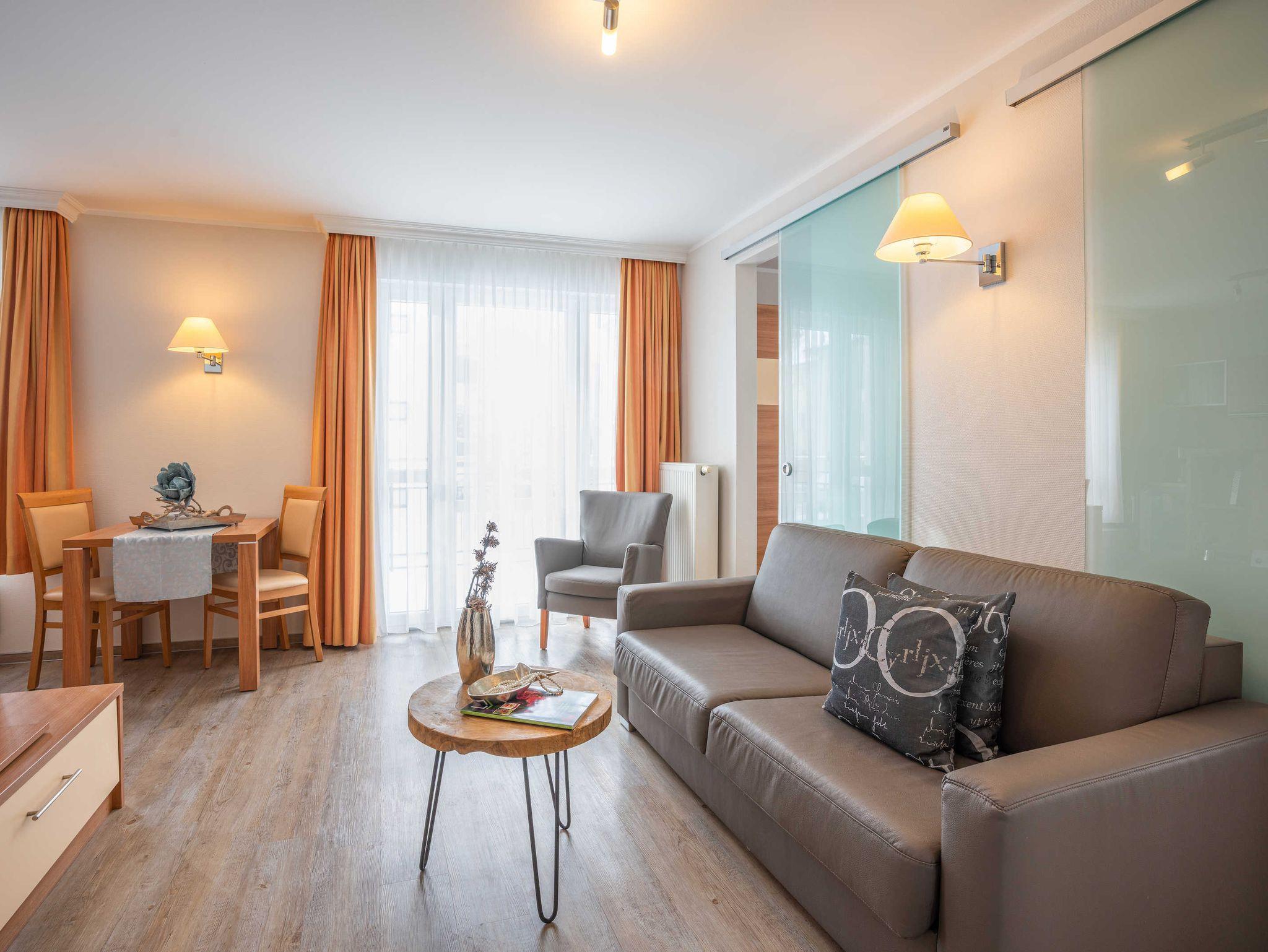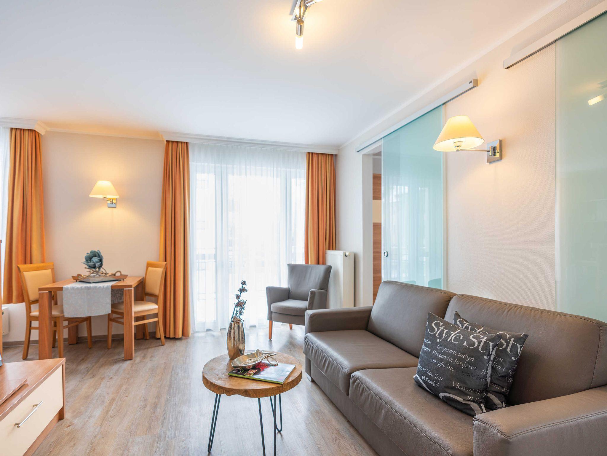Moderne stilvolle 2 Zimmerferienwohnung ca. 2 -3 Personen. Wohnzimmer mit TV, CD Eßplatz und integrierter Vollküche mit Geschirrspüler. Die Wohnung besitzt einen sonnigen Balkon mit Bestuhlung.