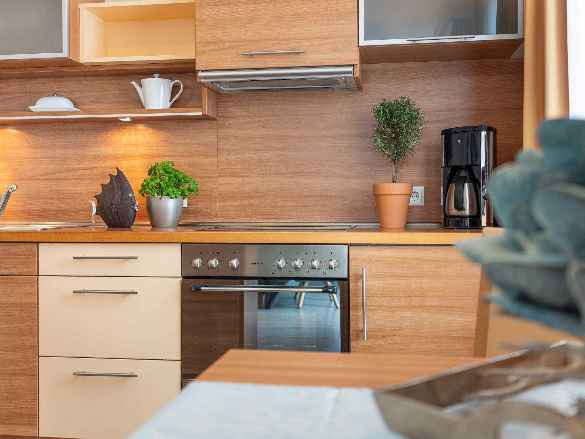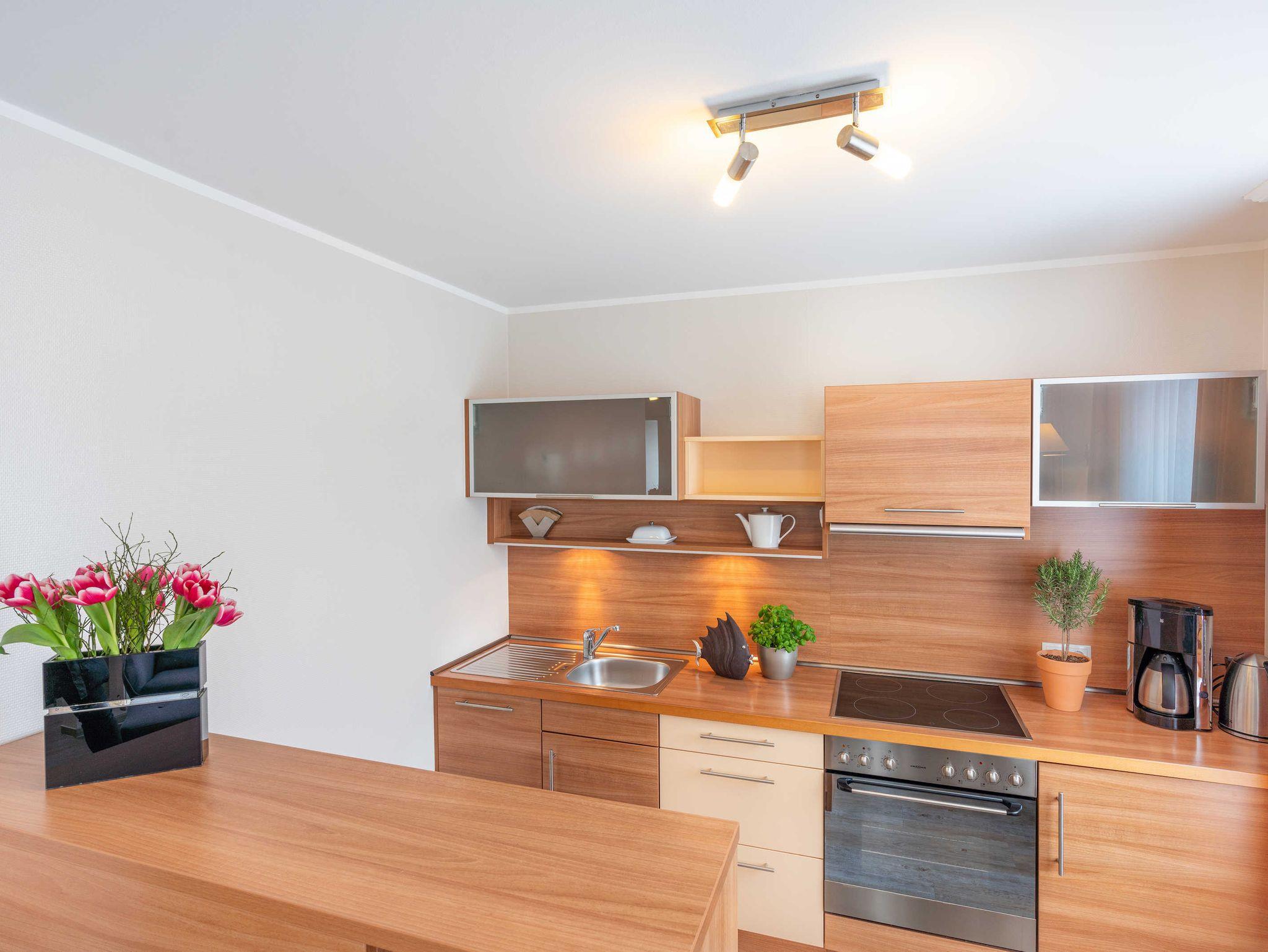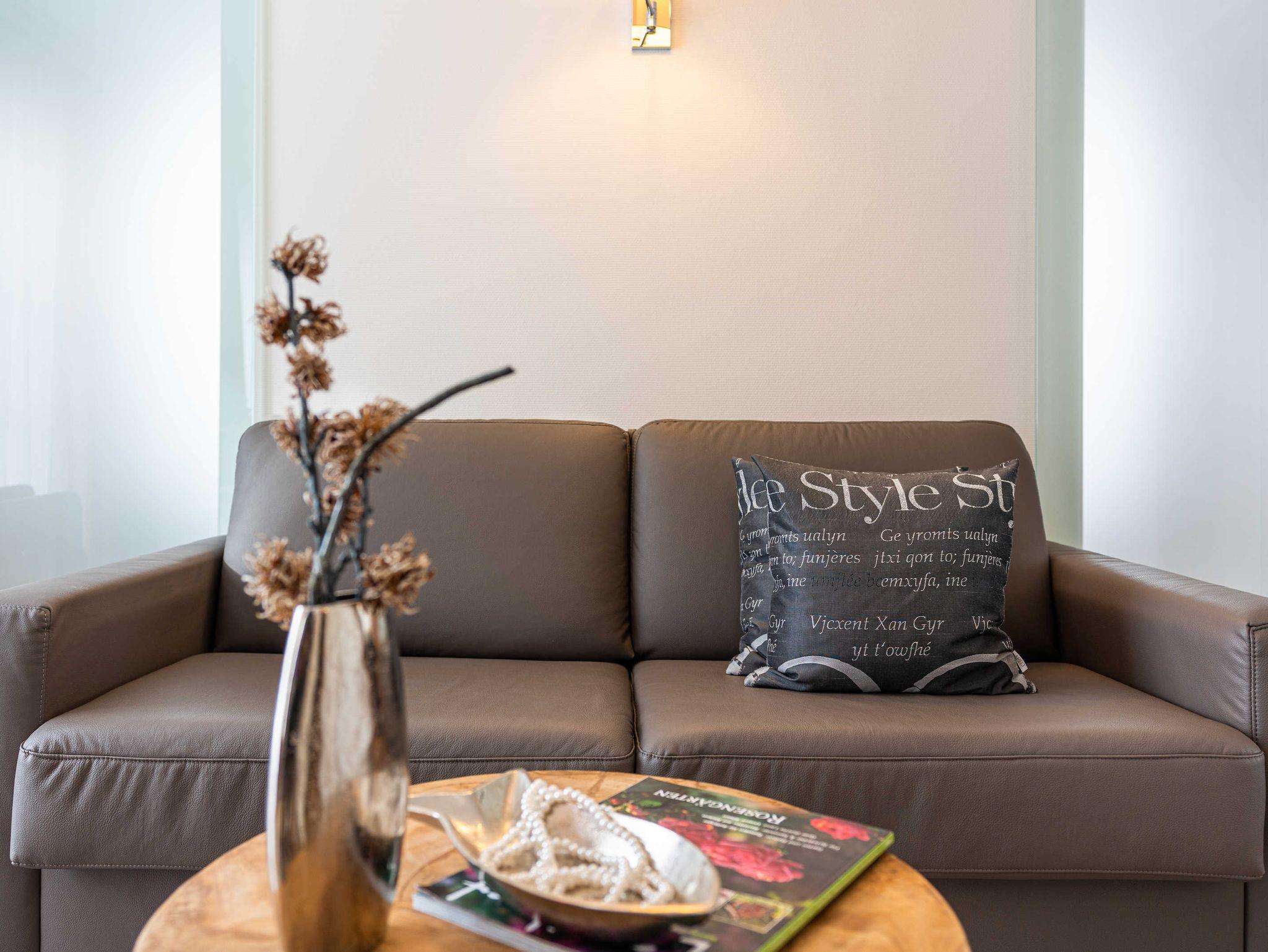 Moderne stilvolle 2 Zimmerferienwohnung ca. 2 -3 Personen. Wohnzimmer mit TV, CD Eßplatz und integrierter Vollküche mit Geschirrspüler. Die Wohnung besitzt einen sonnigen Balkon mit Bestuhlung.