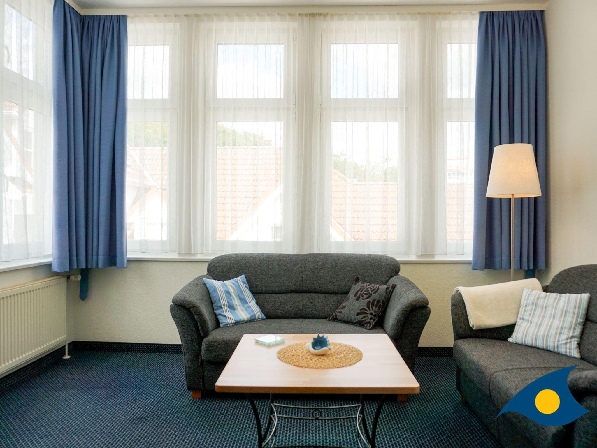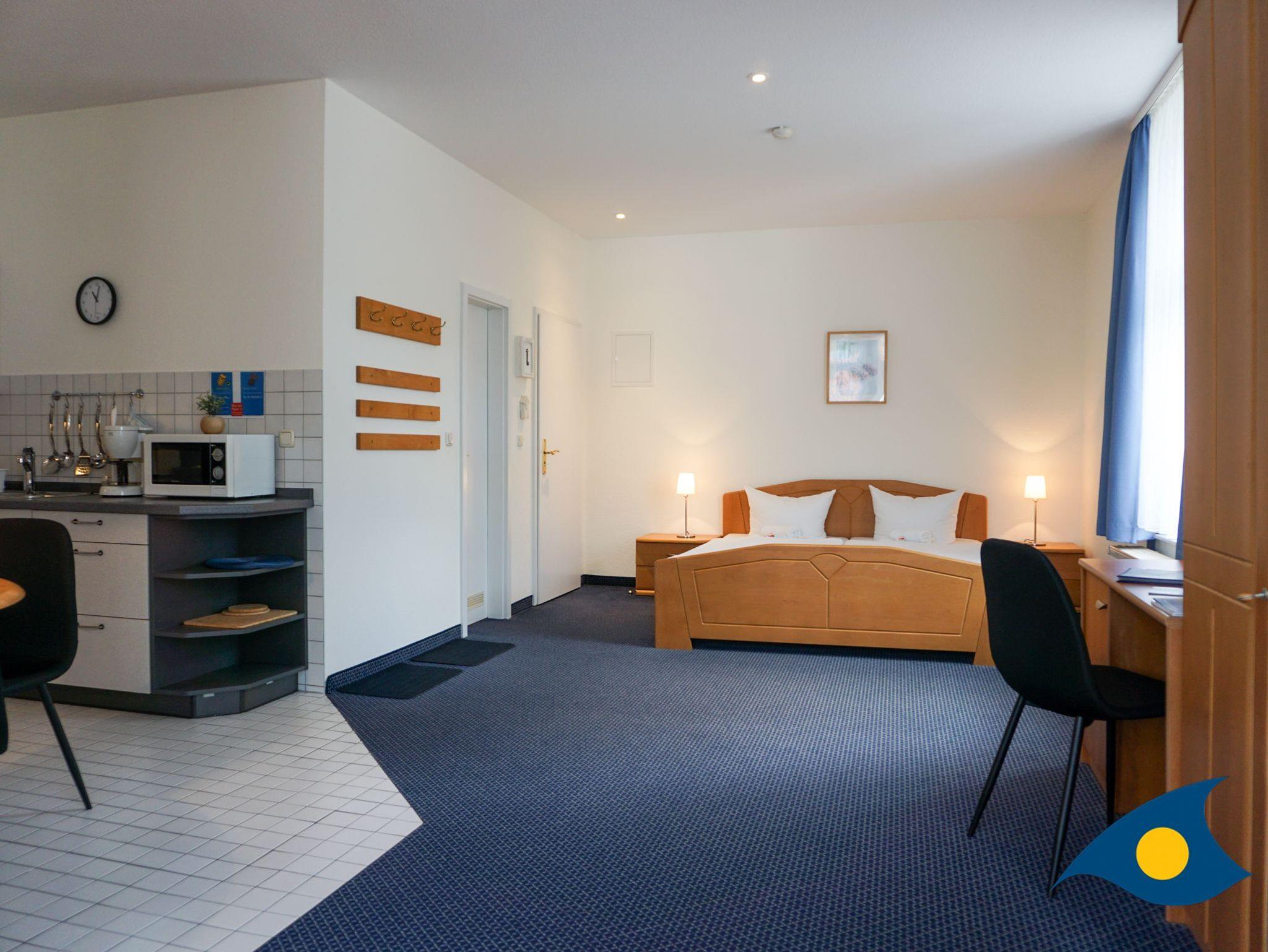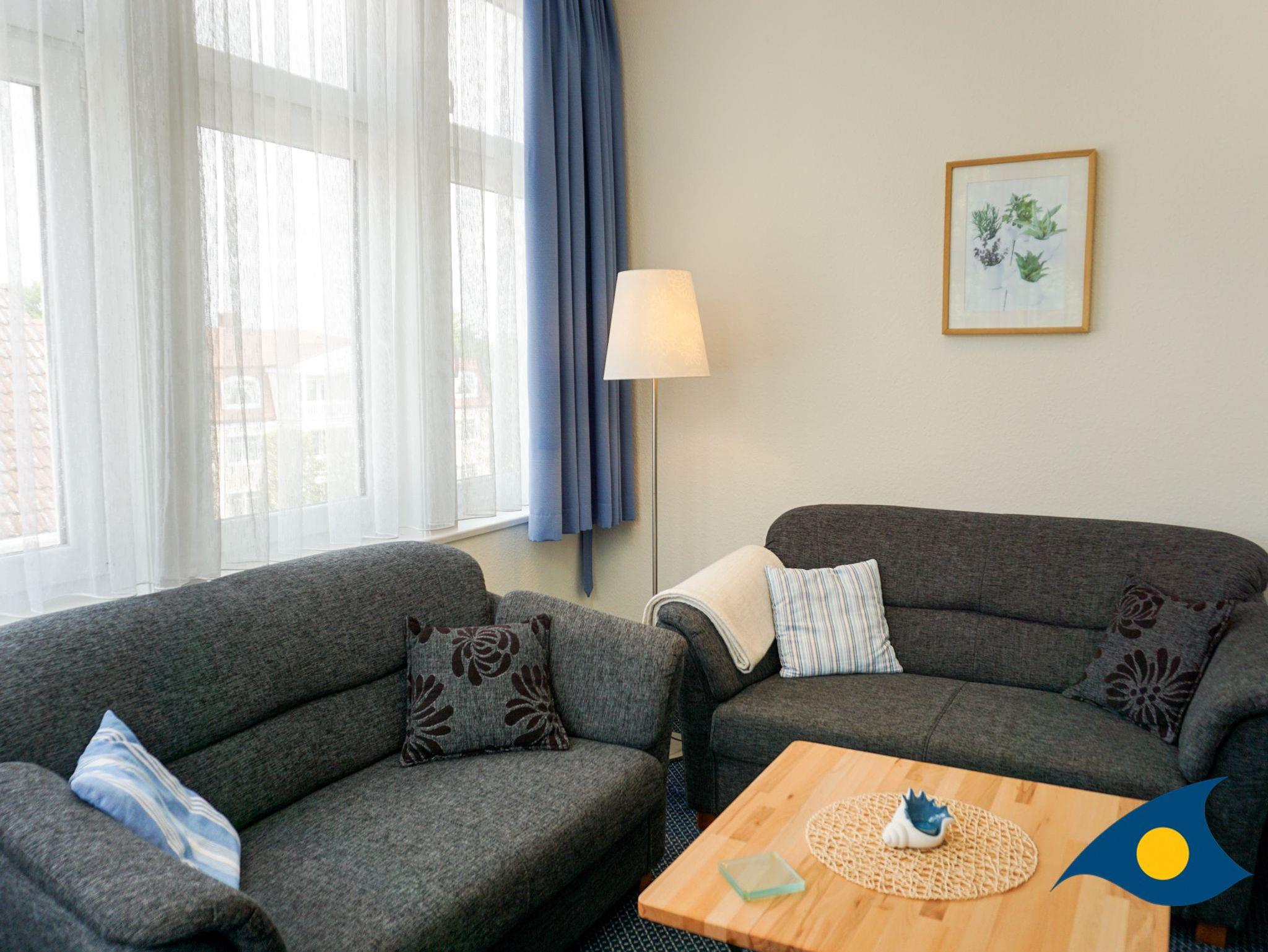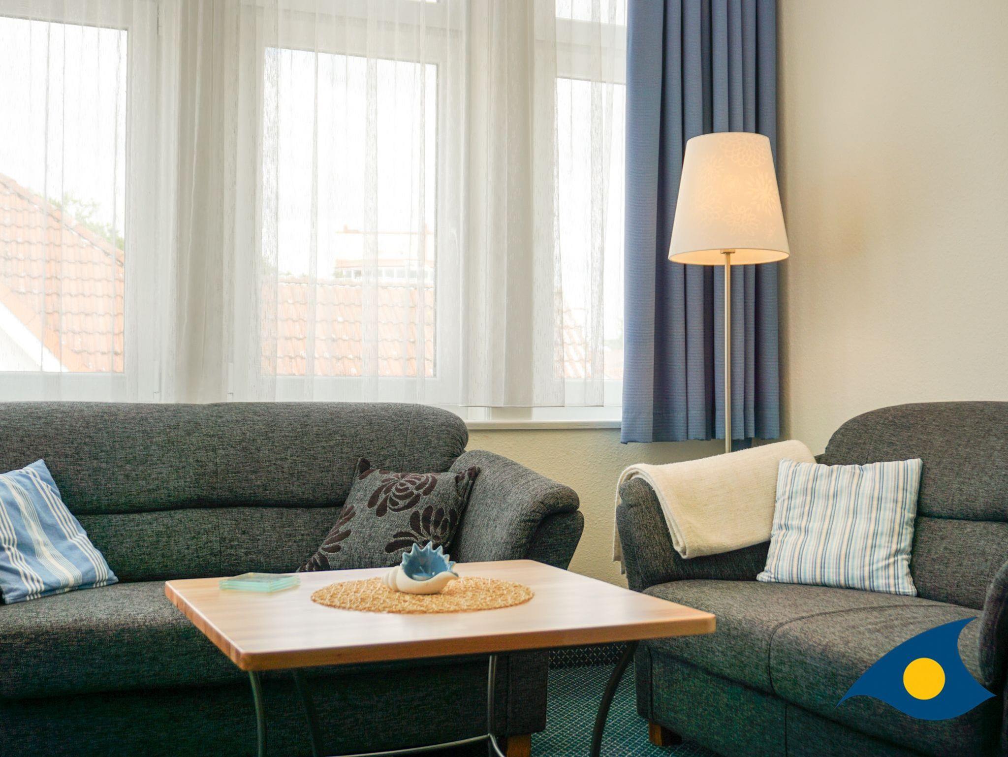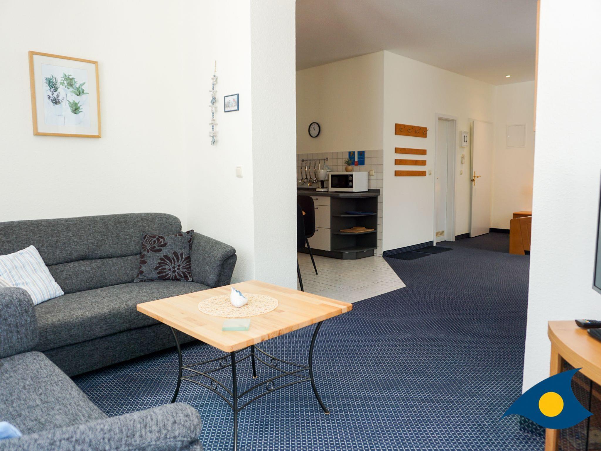 Der kombinierte Wohn- und Schlafbereich besticht durch seinen großzügigen Schnitt. Die gemütliche Couch-Ecke direkt am Fenster, läd zu entspannten Abenden nach langen Strandtagen ein. Für Unterhaltung sorgt ein moderner Smart-TV. Das komfortable Doppelbett (180x200) garantiert ruhige und erholsame Nächte.