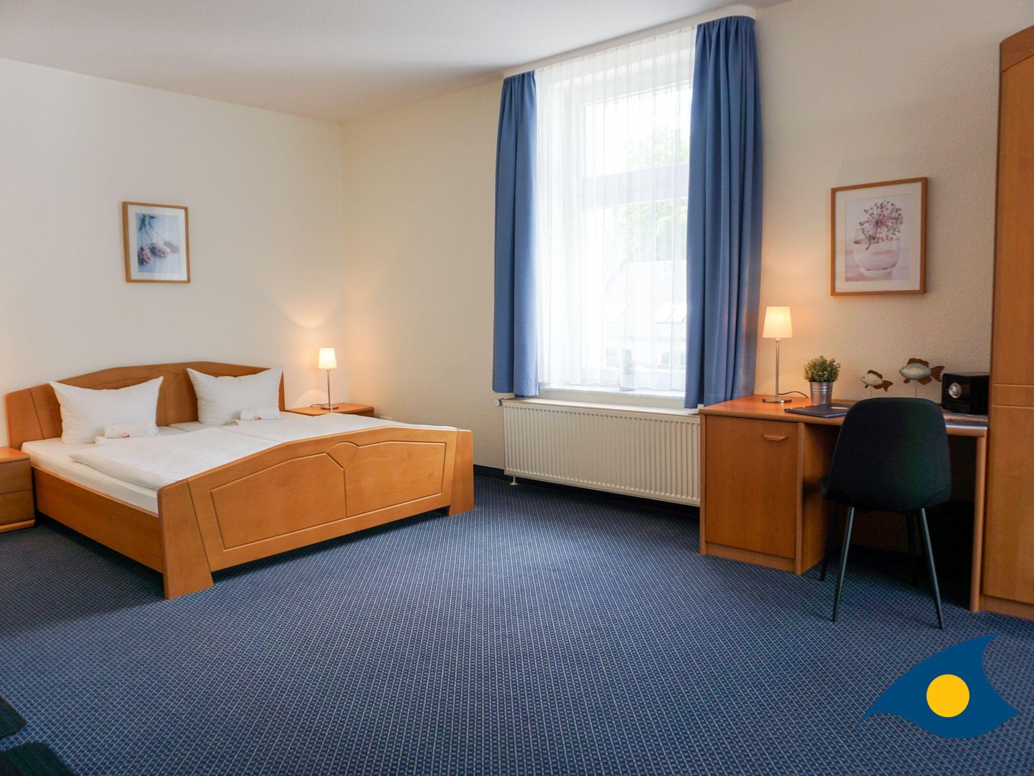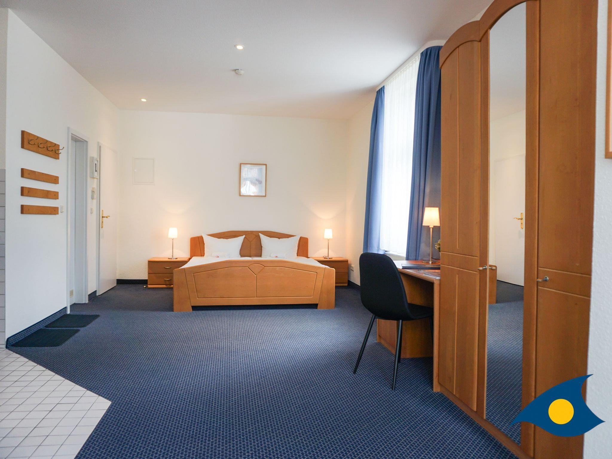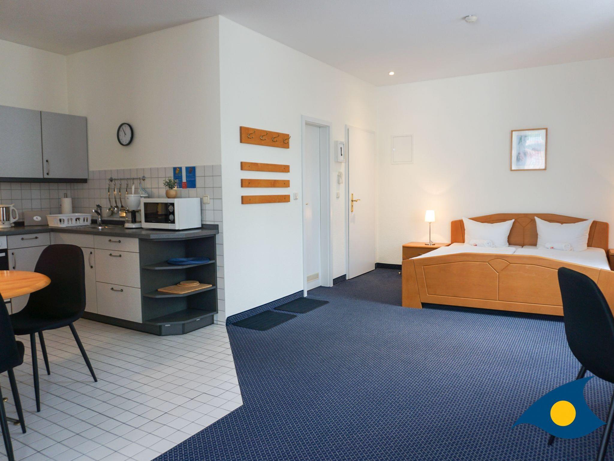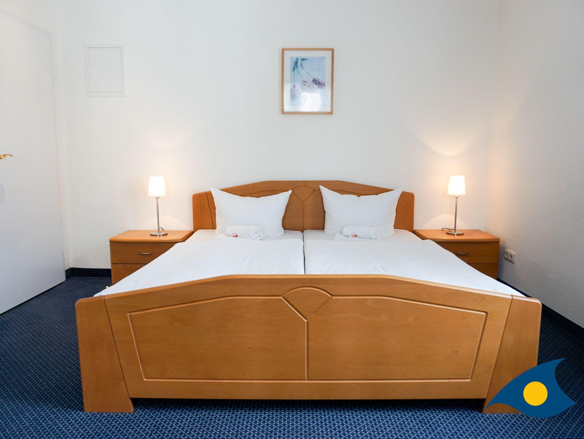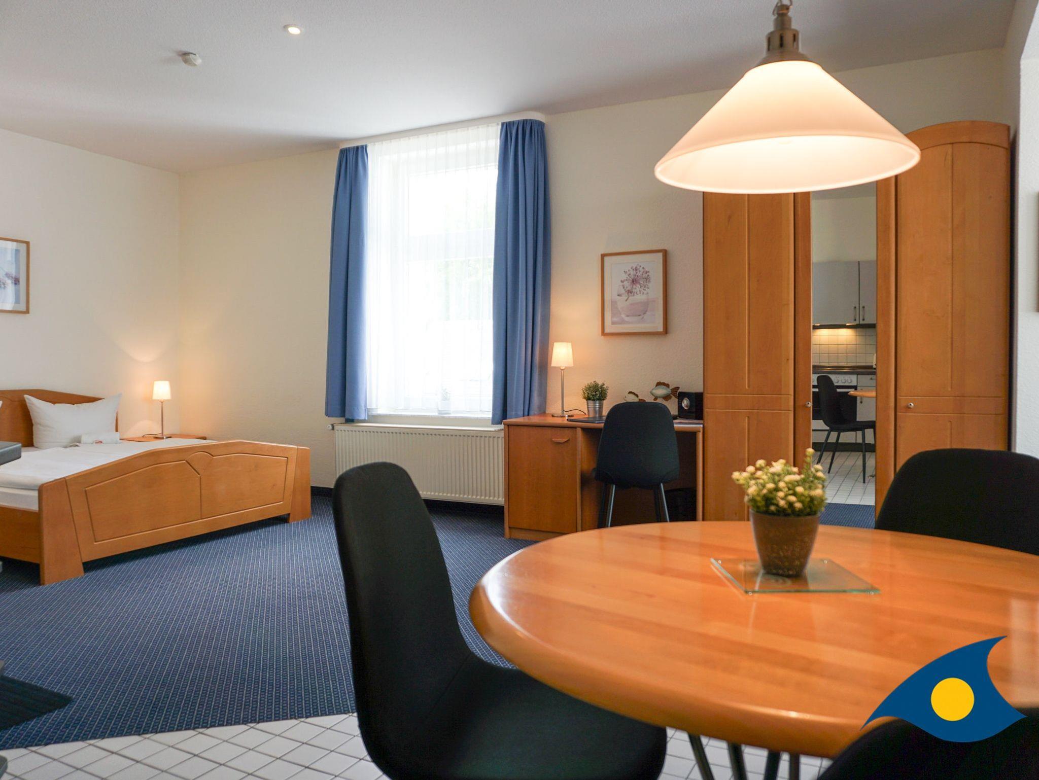 Der kombinierte Wohn- und Schlafbereich besticht durch seinen großzügigen Schnitt. Die gemütliche Couch-Ecke direkt am Fenster, läd zu entspannten Abenden nach langen Strandtagen ein. Für Unterhaltung sorgt ein moderner Smart-TV. Das komfortable Doppelbett (180x200) garantiert ruhige und erholsame Nächte.