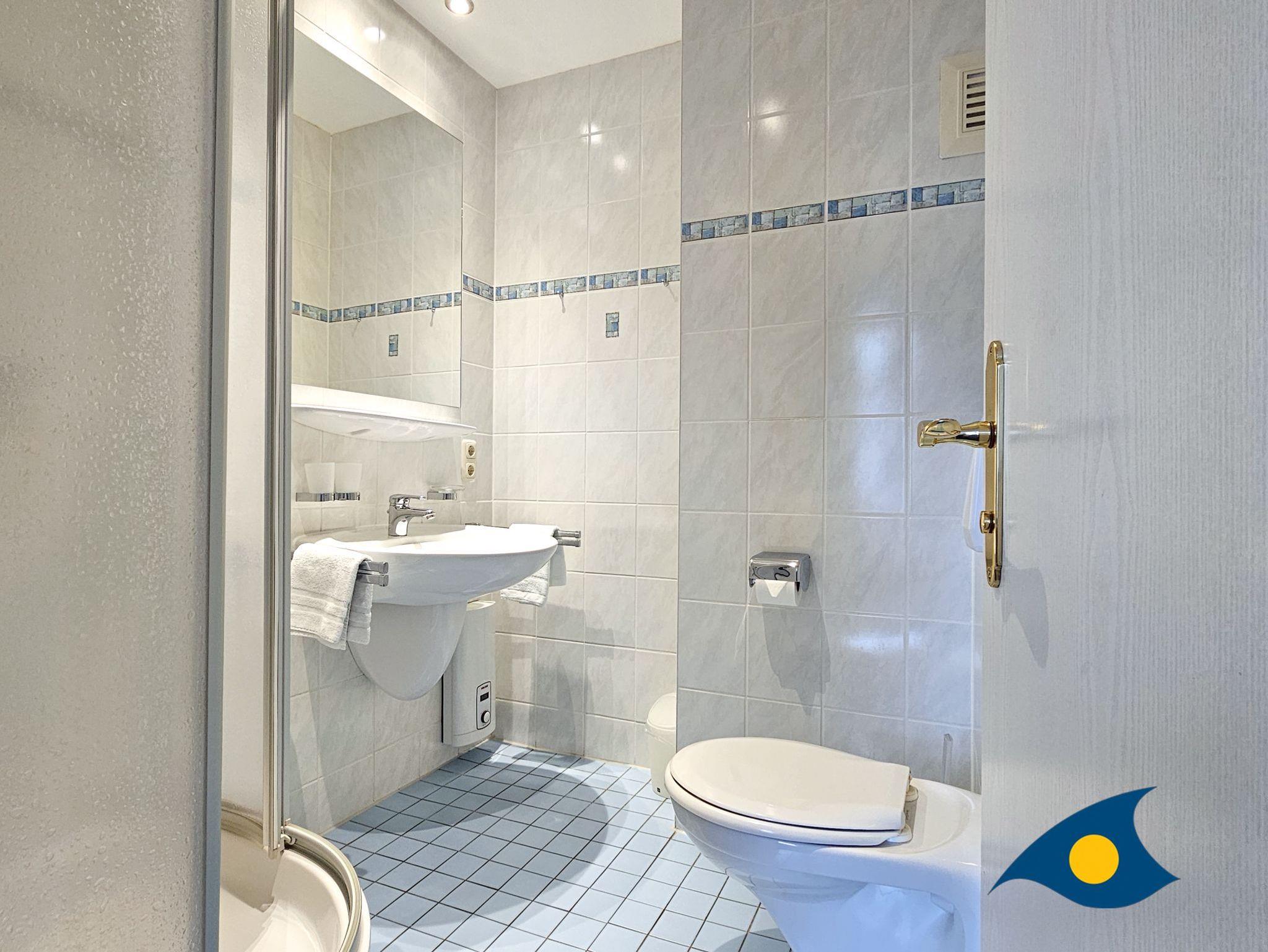 Das Badezimmer ist mit einer Dusche und einem WC ausgestattet und rundet das gemütliche Ambiente ab.