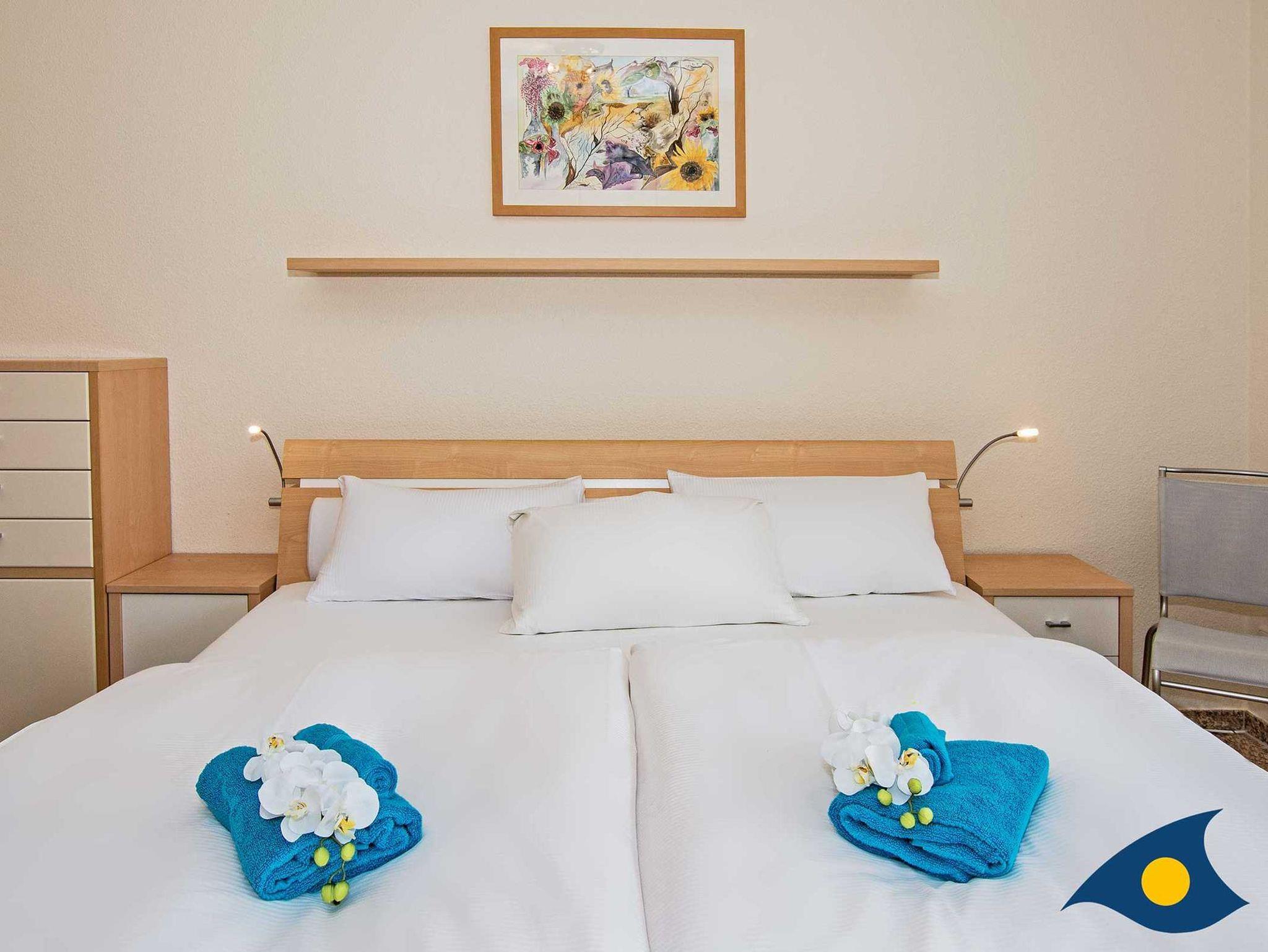 Zu dieser schönen, südlich gelegenen Zweiraumwohnung im Erdgeschoss der Dünenresidenz gehören ein Balkon und eine Hochterrasse. Das zeitgemäß eingerichtete Appartement verfügt über ein Wohnzimmer mit moderner Küchenzeile, ein Schlafzimmer mit Doppelbett und ein Badezimmer mit Dusche und WC. Die Schlafcouch im Wohnraum kann für zwei Personen aufgebettet werden.