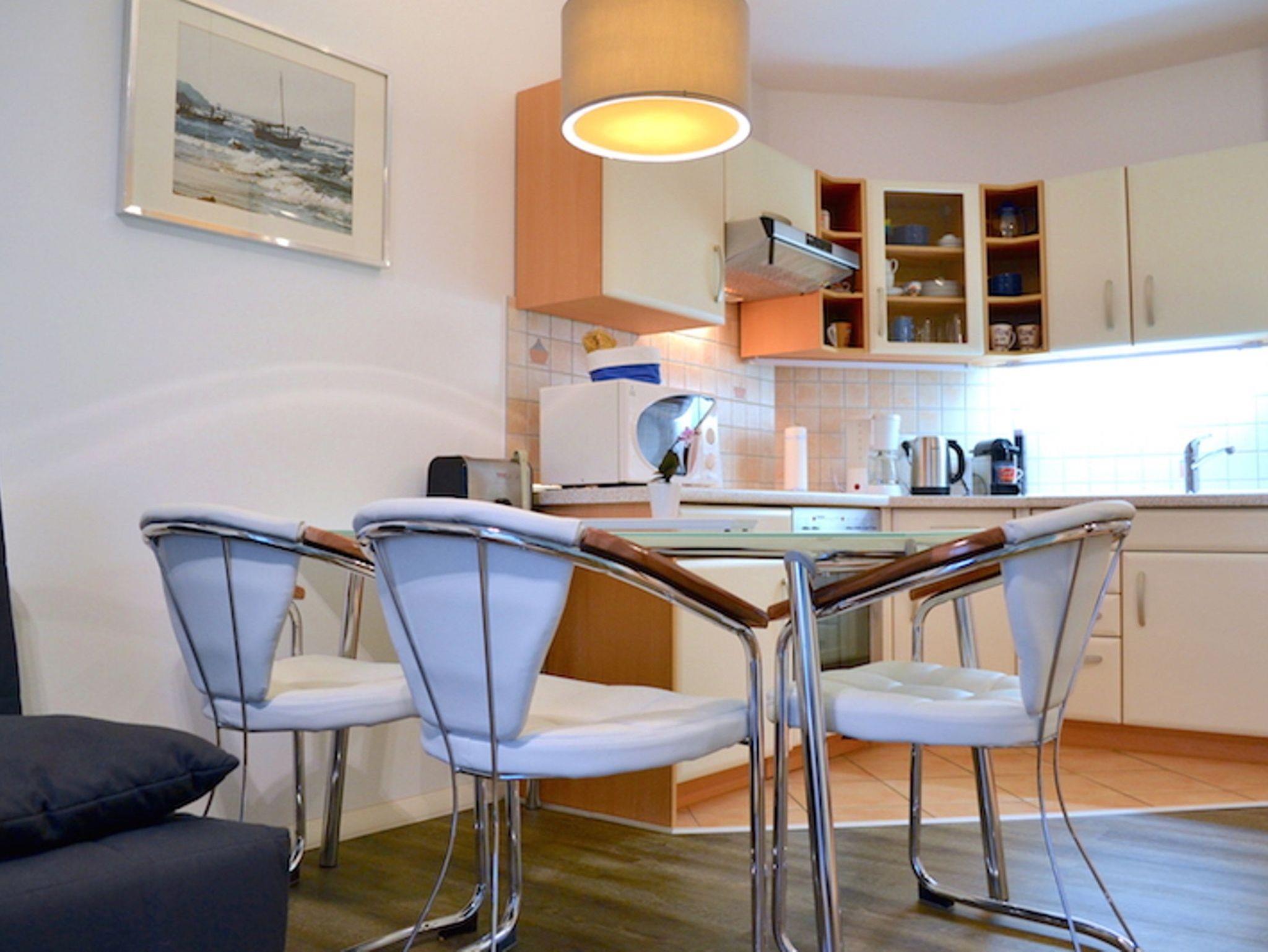 Im Wohnzimmer relaxen Sie auf dem bequemen Sofa vor dem LED-Fernseher mit Blu-ray/DVD-Player und Radio. An die umfangreich ausgestattete offene Küche mit Cerankochfeld, Backofen, Kühlschrank mit Gefrierfach, Mikrowelle, Toaster, Wasserkocher, Kaffeemaschine, Nespresso Kapselmaschine schließt ein Essbereich mit einem großen Esstisch und gepolsterten Stühlen an. Das Schlafzimmer mit Doppelbett, Kleiderschrank und LED-TV, sowie ein Duschbad runden die gemütliche Wohnung im 2. Obergeschoss ab. Auf dem von der Wohnküche und dem Schlafzimmer erreichbaren großen Balkon, lassen Sie den Tag mit ausreichend Sonne und einem Glas Wein ausklingen.