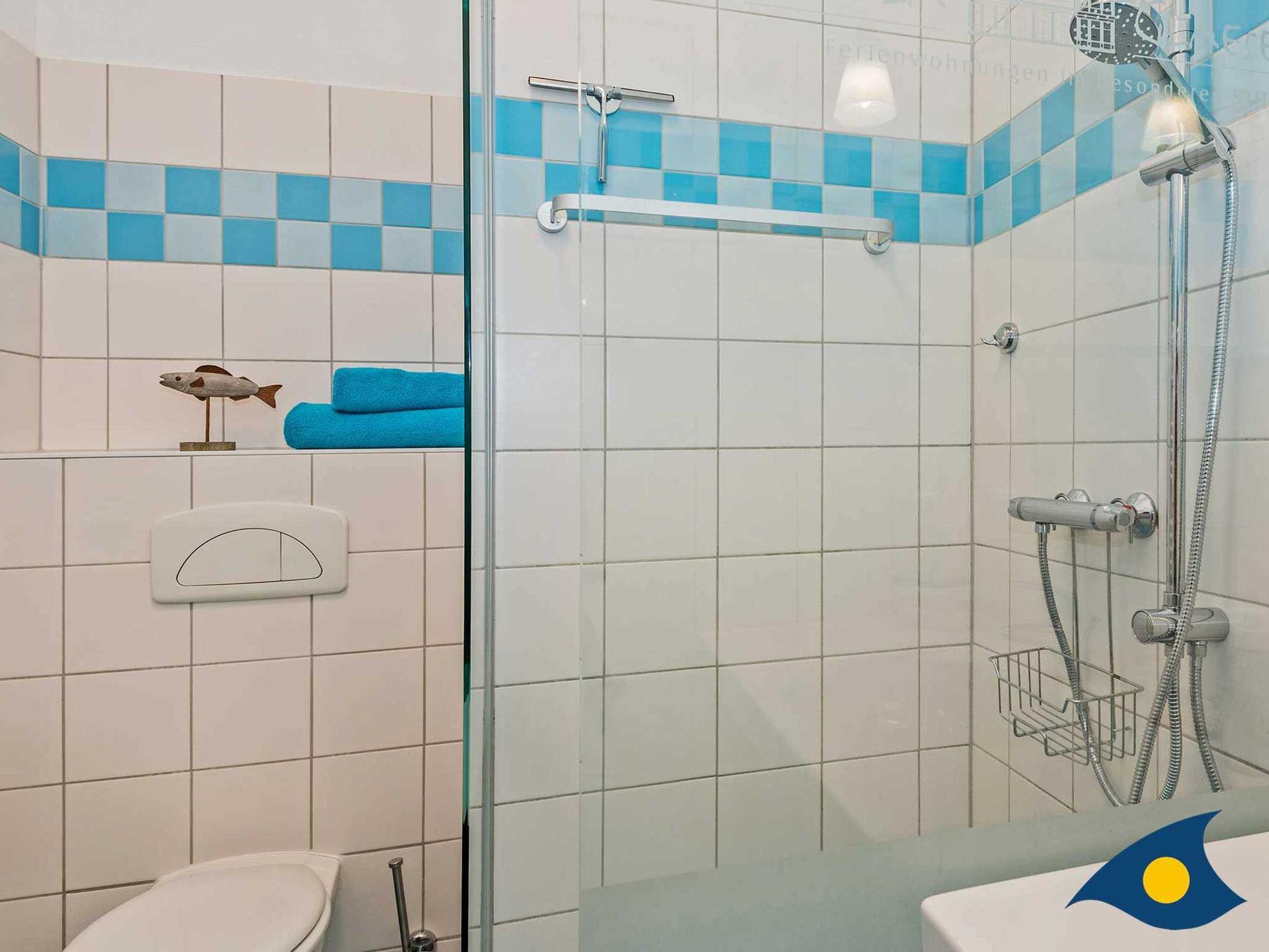 Badezimmer: ebenerdige Dusche, Duschhocker, Handtuchheizkörper, Kosmetikspiegel, Föhn, geräumiger Waschtischunterschrank